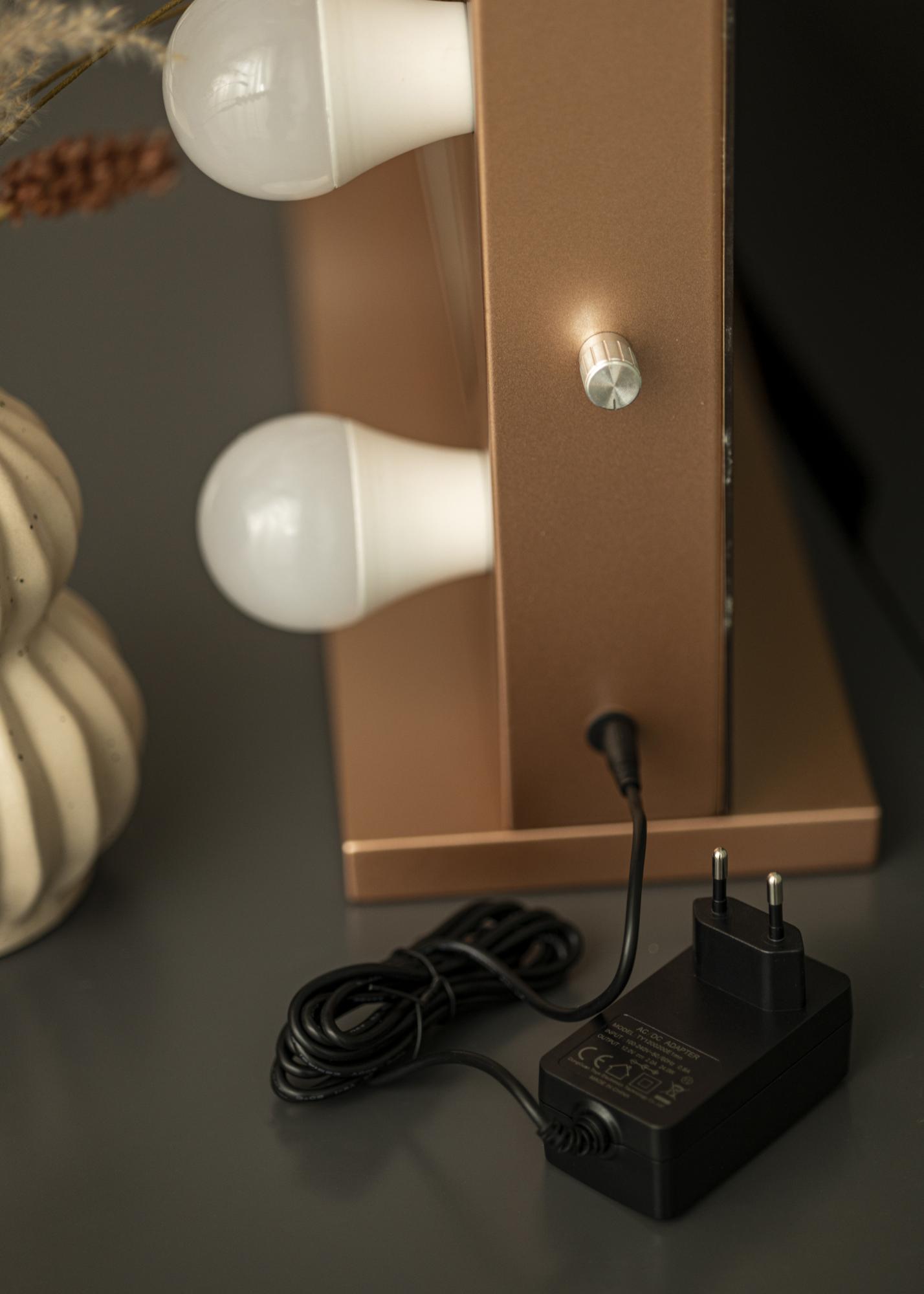 The rose gold frame is matched by a base in the same stylish shade, making this mirror a perfect interior detail on both tables and dressers. If you prefer to hang the mirror on the wall using the wall brackets on the back, it is possible to remove the base. Electrical connection is made with a plug.