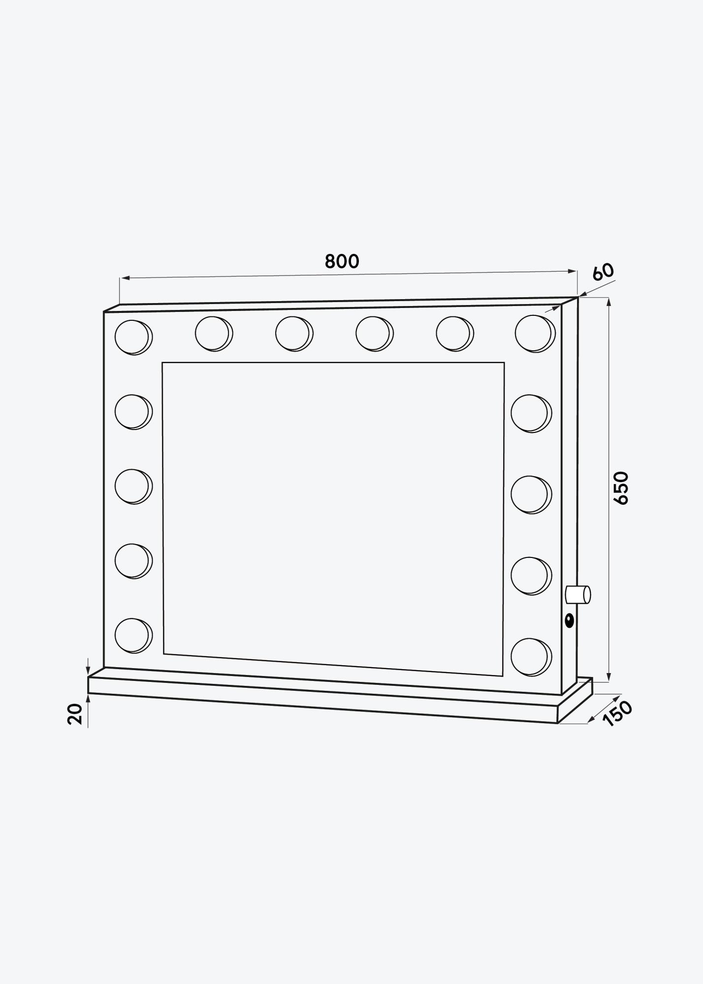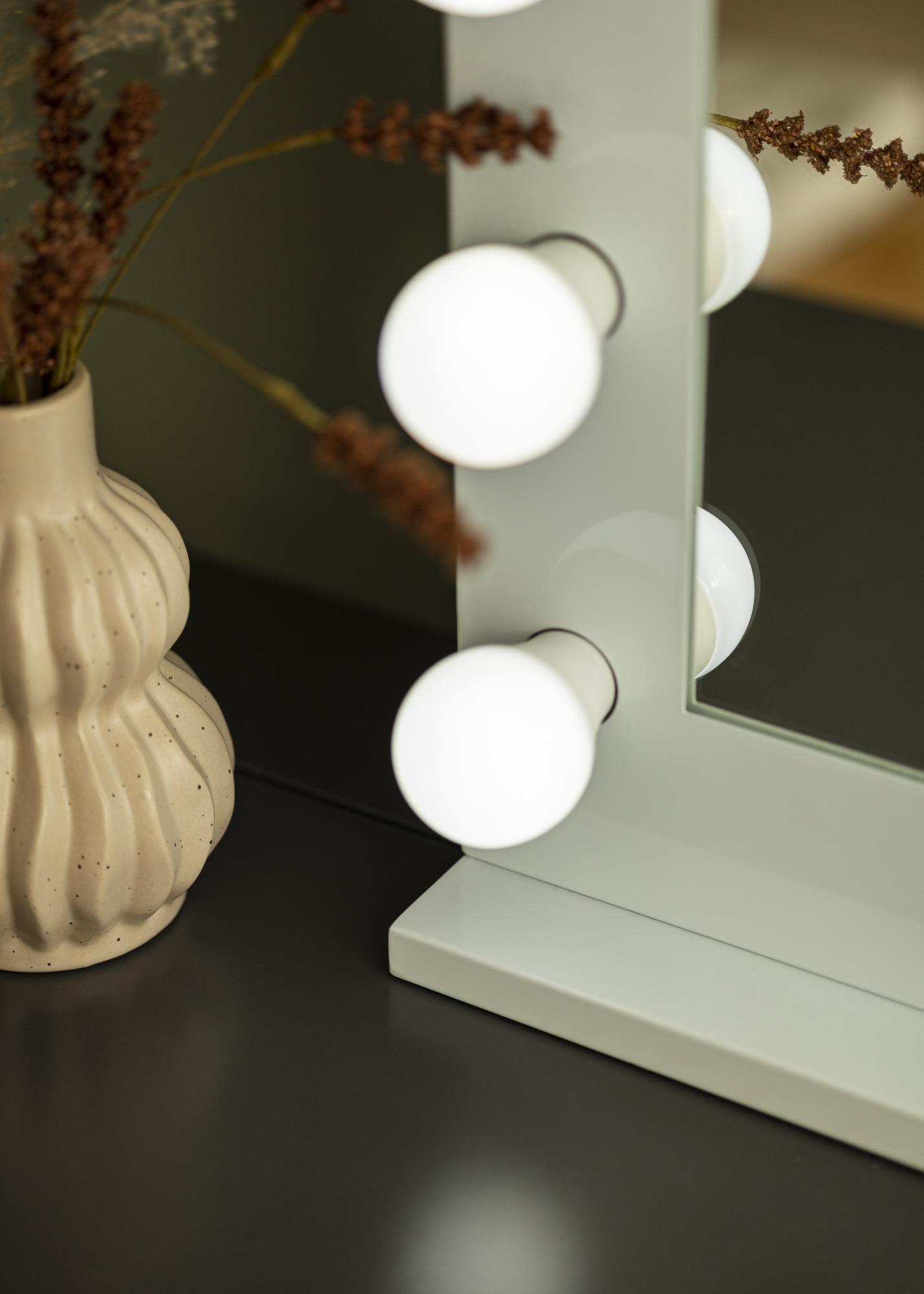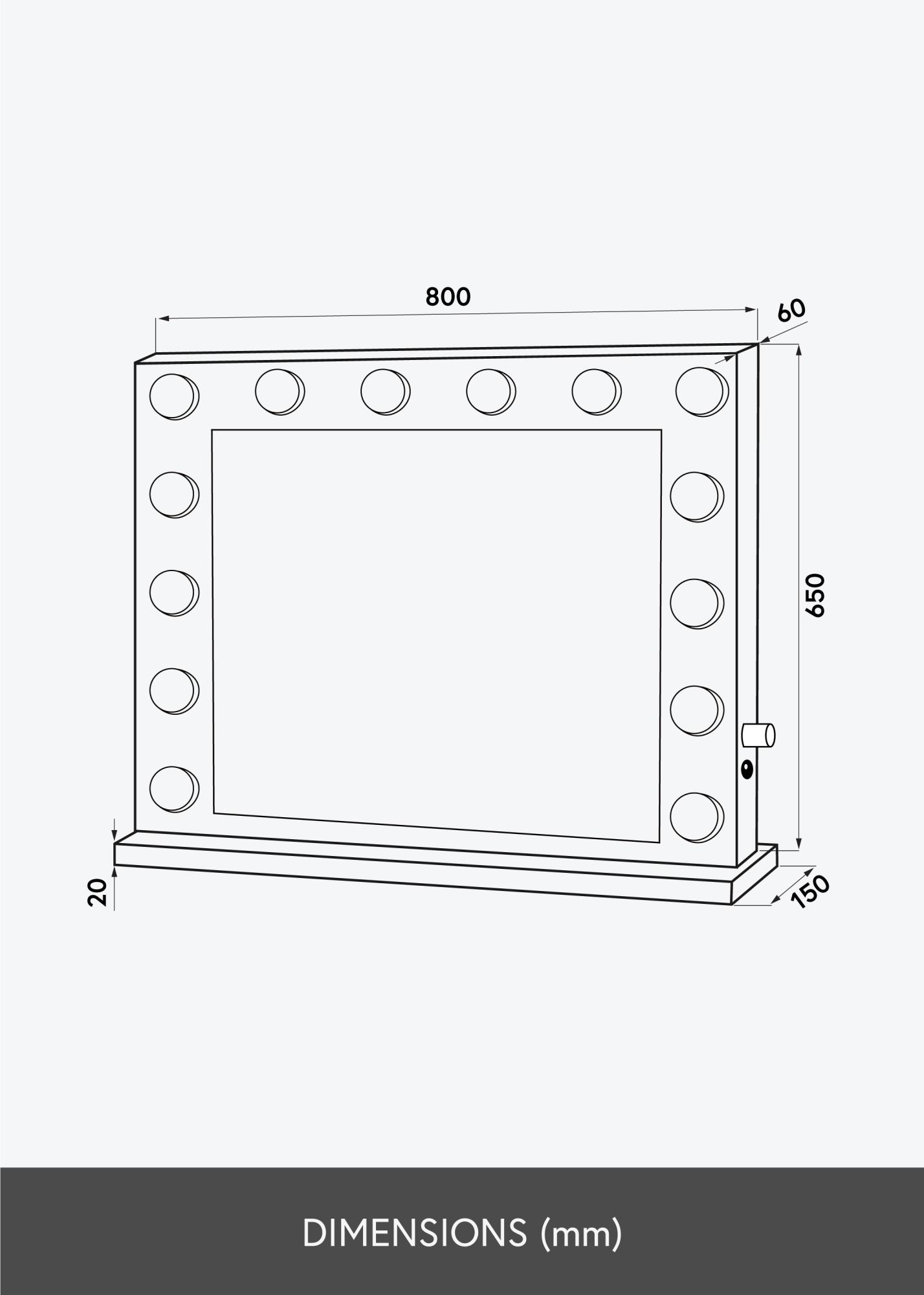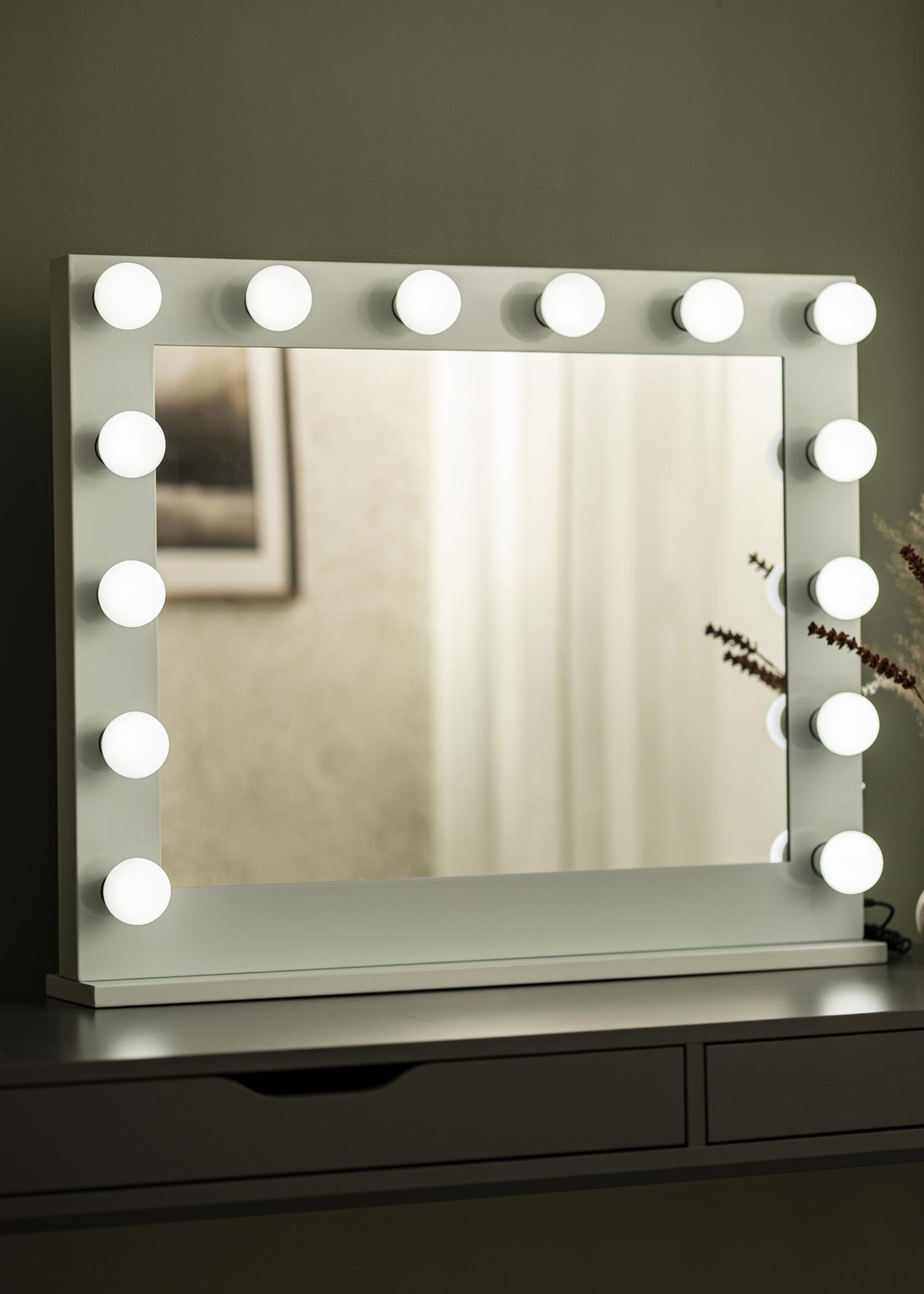 This is a large makeup mirror with inbuilt lighting - perfect for when you want to apply makeup or whatever your daily routine involves. With an impressive 80x65 cm mirror combined with a stylish white frame including 14 light bulbs, this makeup mirror has a real sense of Hollywood glamour. The light bulbs are replaceable and have E27 sockets. The mirror can be placed upright on a sideboard, chest of drawers or any other flat surface you choose to enhance with this beautiful makeup mirror.