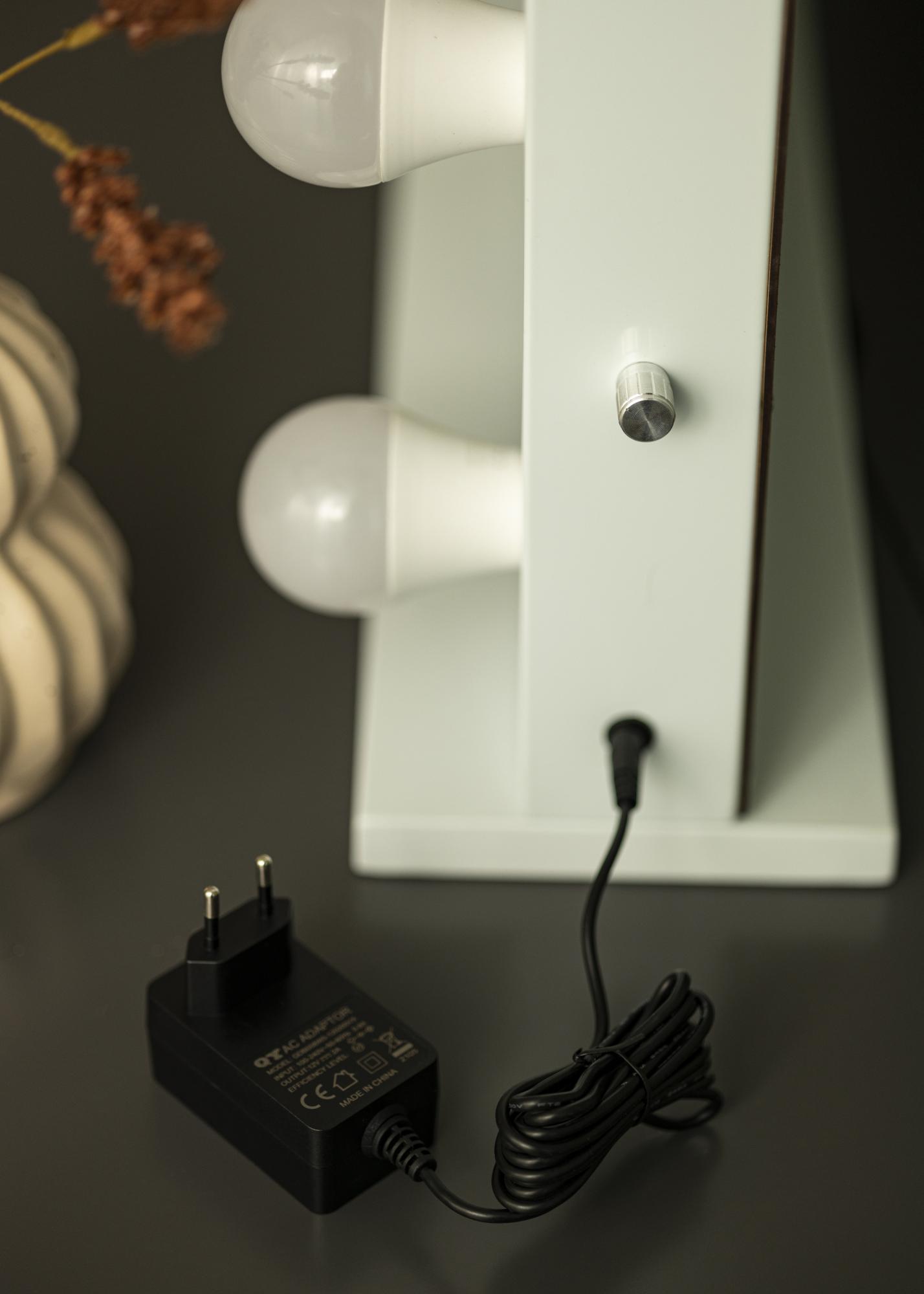 The lights on the mirror emit a cool white light. If you want to adjust your lighting, this can be easily done with the help of a dimmer switch on the side of the mirror. This mirror is powered using a plug.