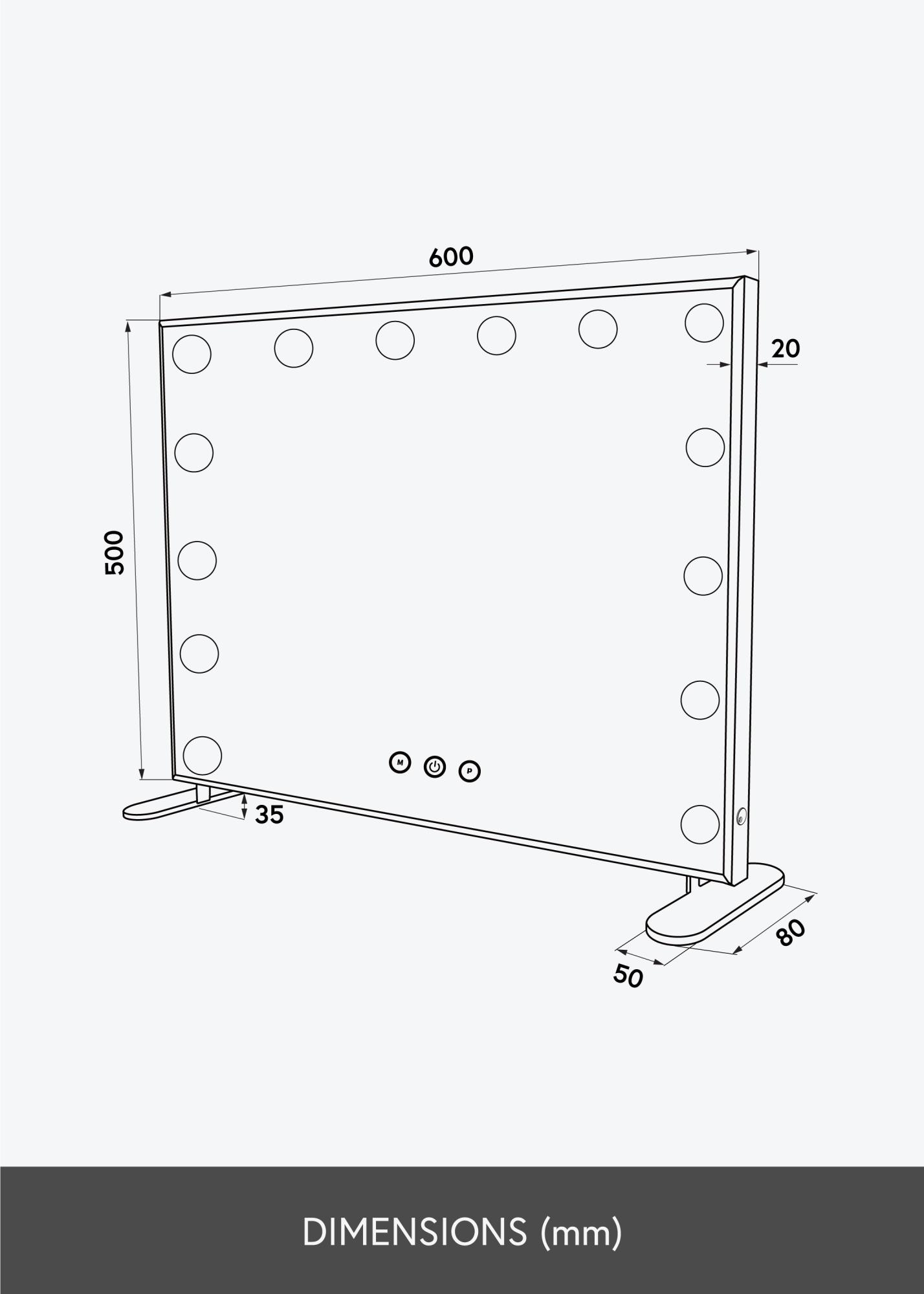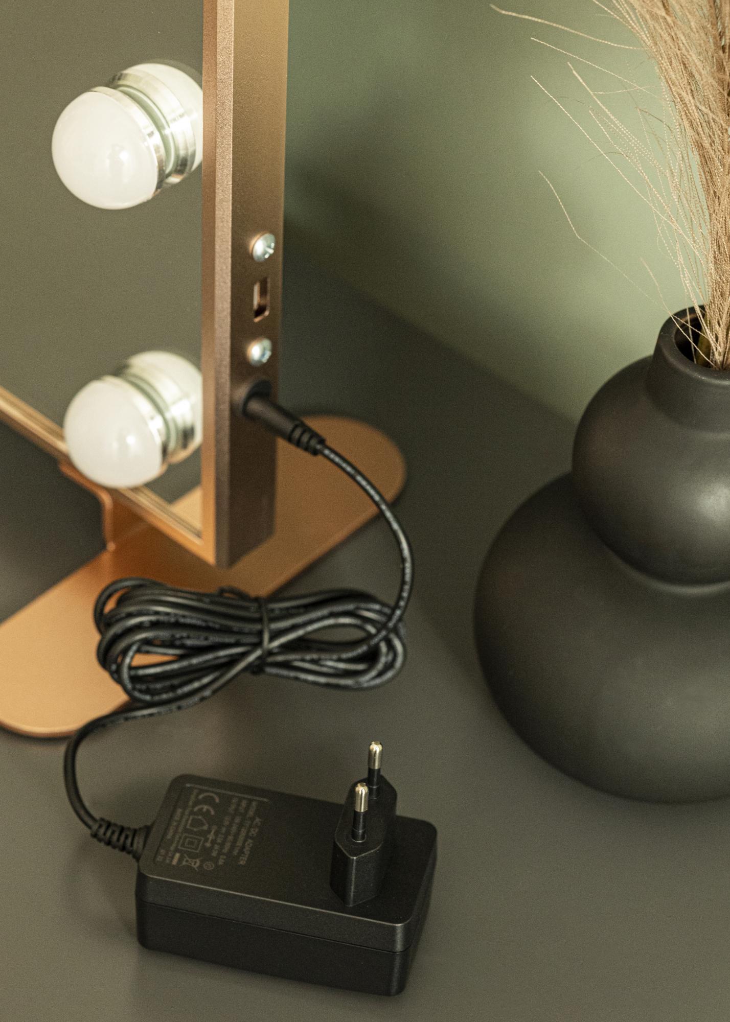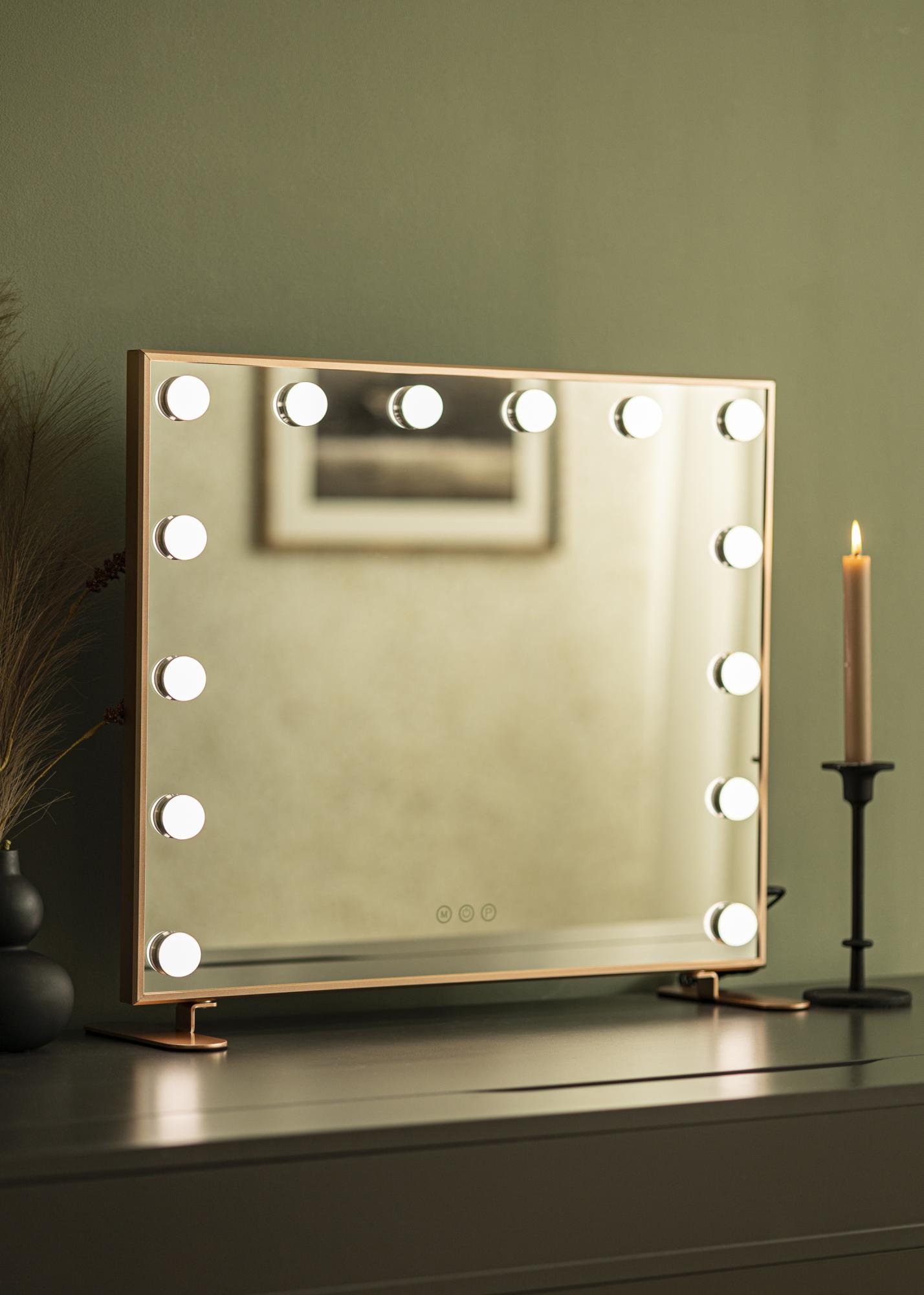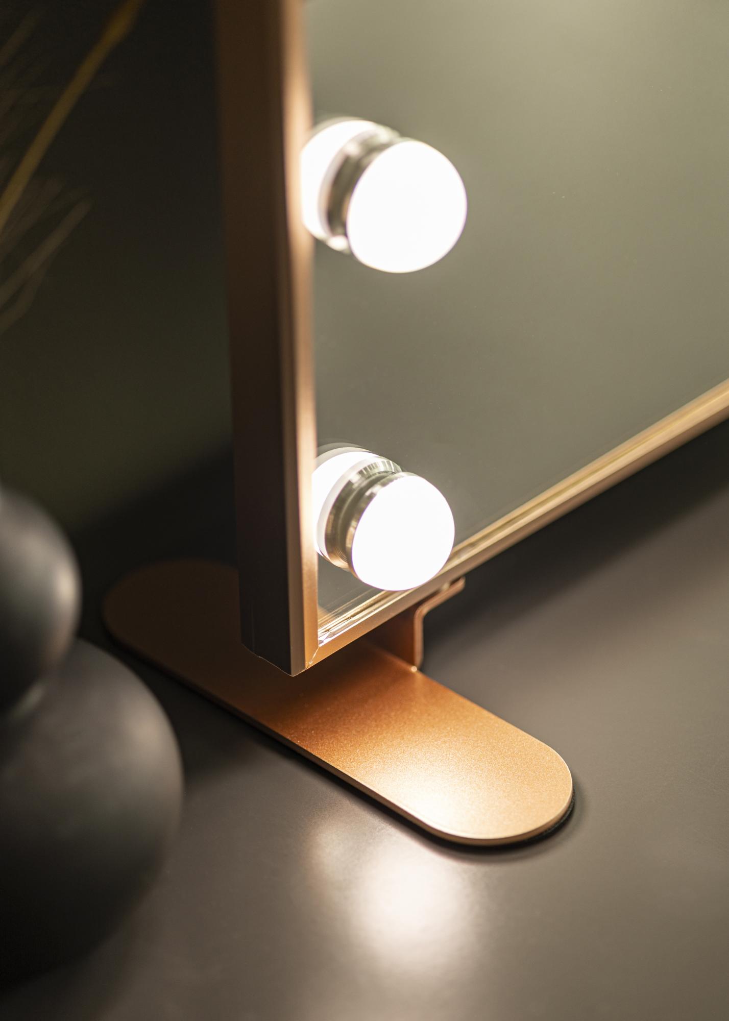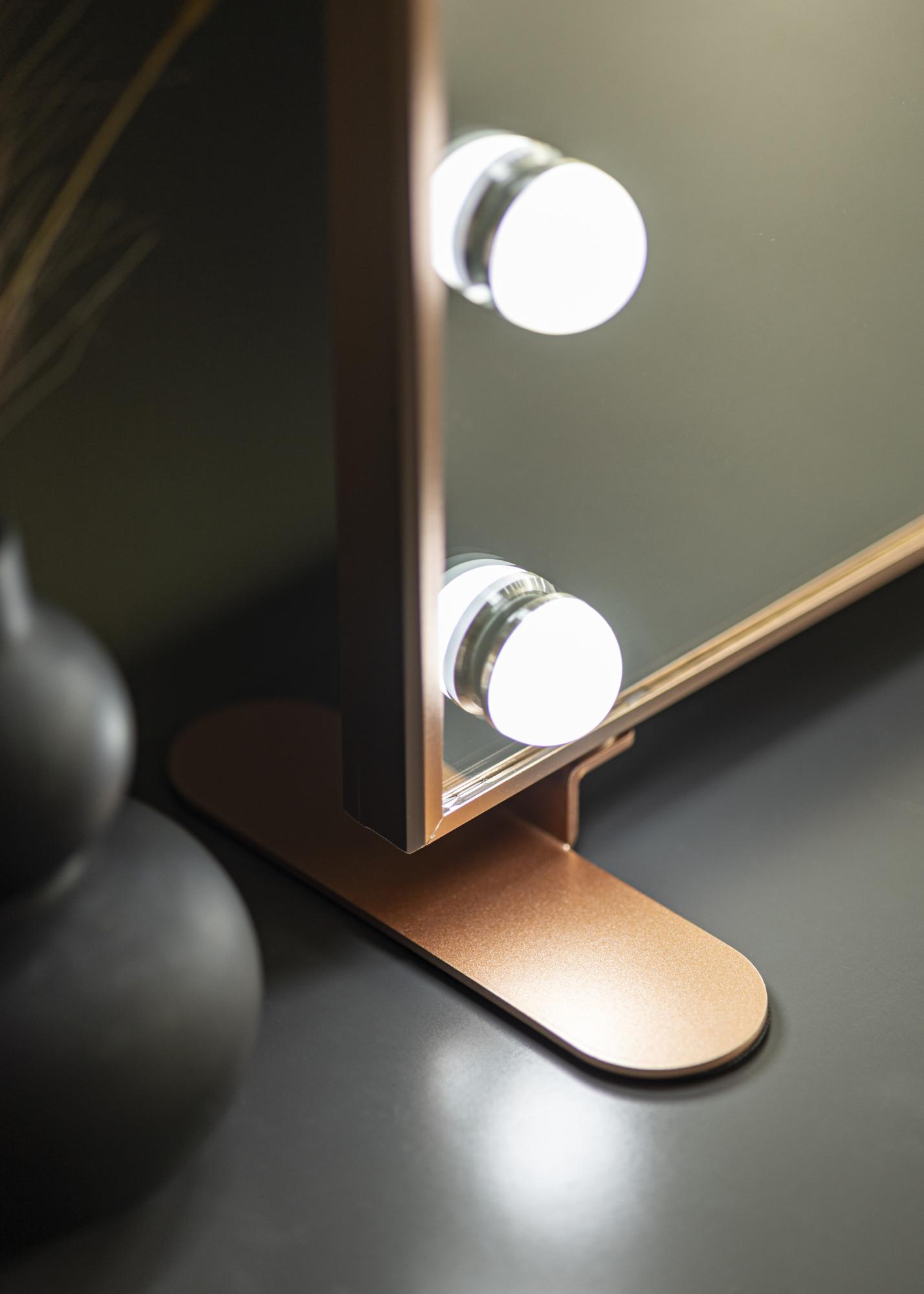 This luxurious makeup mirror features a thin metal frame in rose gold and LED lighting in the form of 14 large bulbs. It gives the mirror a glamorous Hollywood-inspired look that sets the style in any room. It has an elegant stand, also in a shade of rose gold, which can be detached if you wish to hang your mirror on the wall.