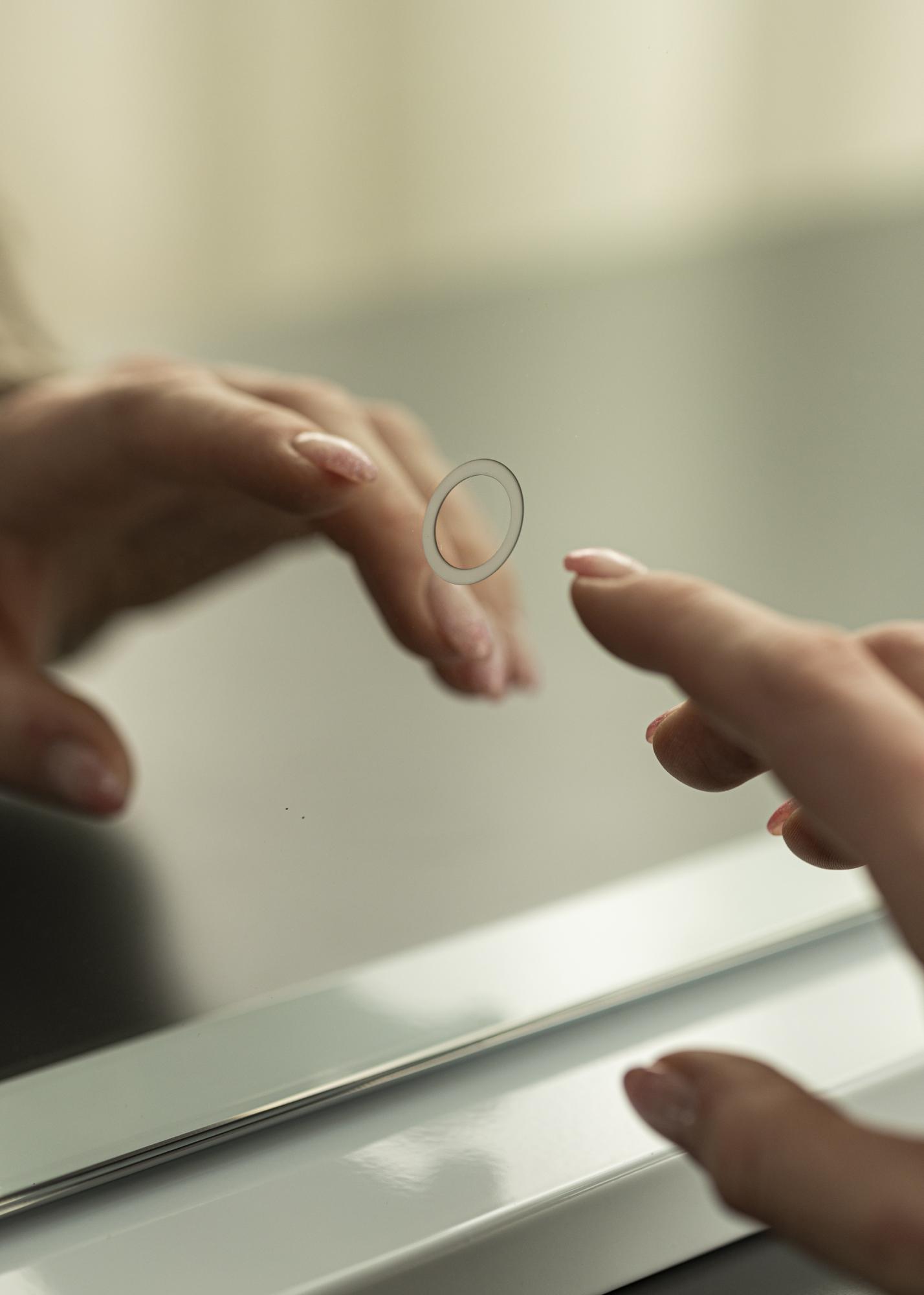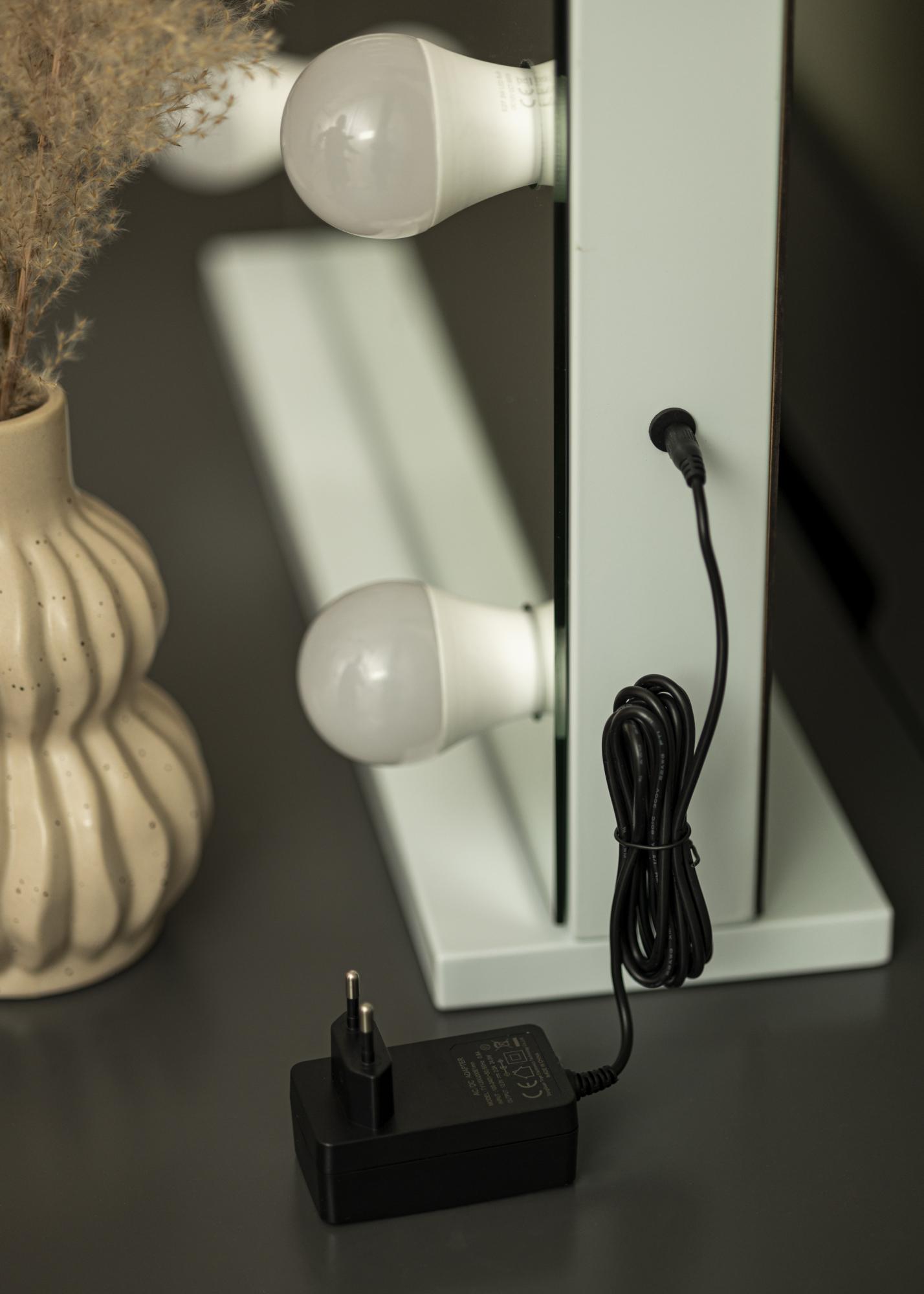 The LED lighting emits a cool white light. You turn on the lighting by pressing the button on the mirror. If you hold the button for a few seconds, you can dim the light to whatever suits you. With this function, you can easily choose whether you want gentle background lighting or a brighter light so you can focus on applying makeup.
