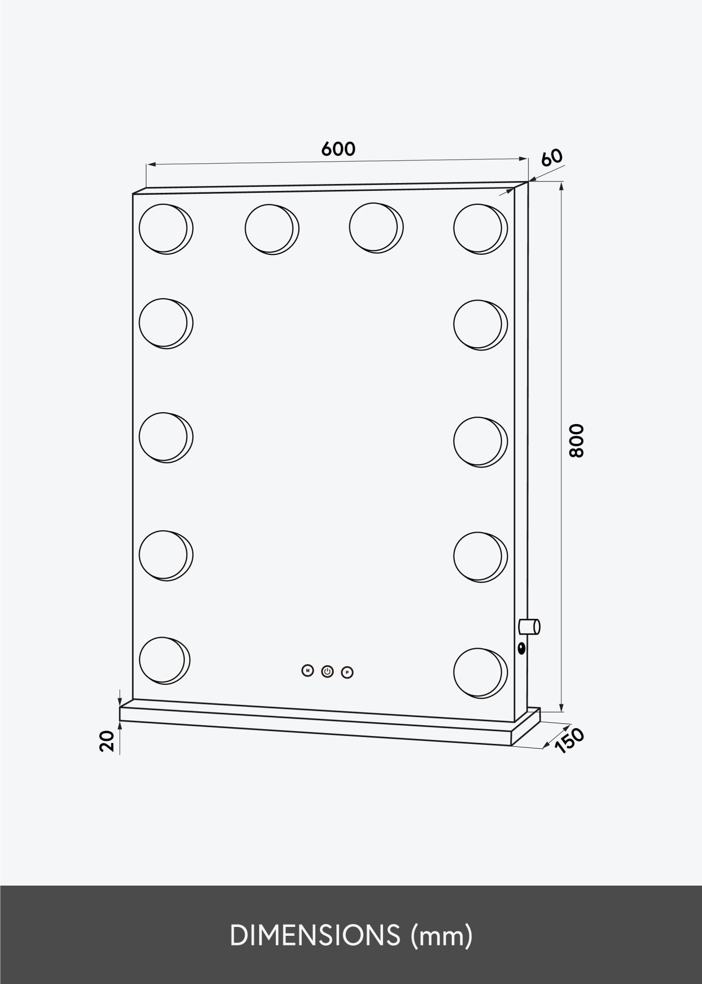 This makeup mirror has a Hollywood inspired design with a classic rectangular shape, a large 80x60 cm mirror and 14 LED lights arranged in an elegant frame. The mirror can be used freestanding on a piece of furniture either as an attractive functional item on a dressing table or as a decorative decor detail when placed on a side table. The mirror can also be wall mounted in a vertical position. The mirror is connected with a plug.