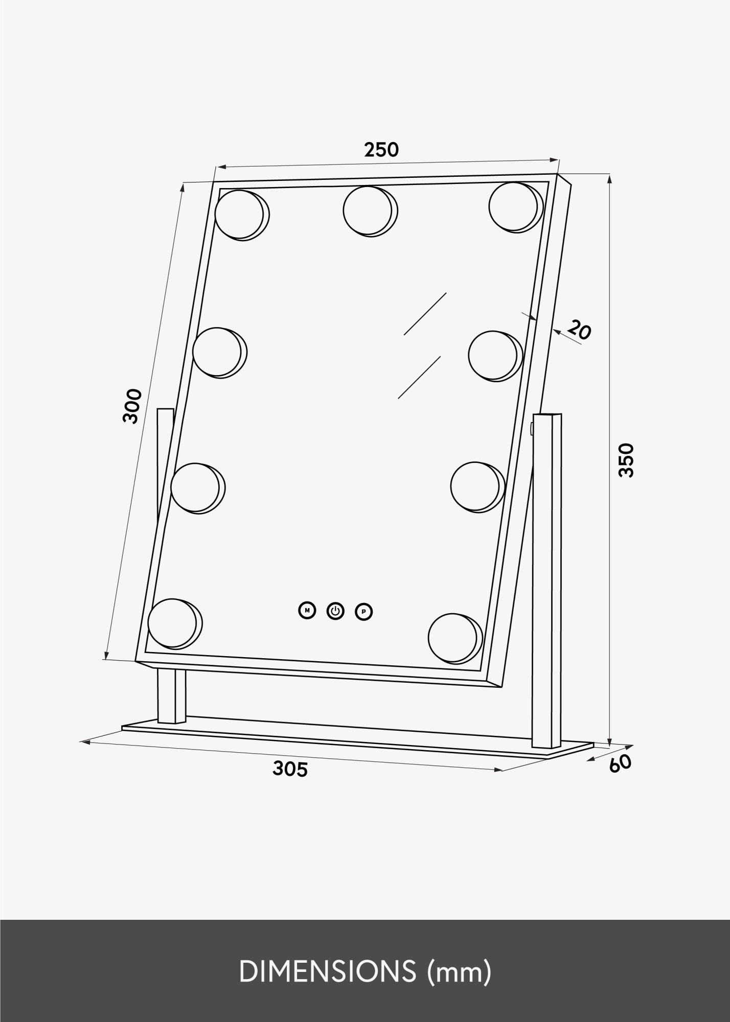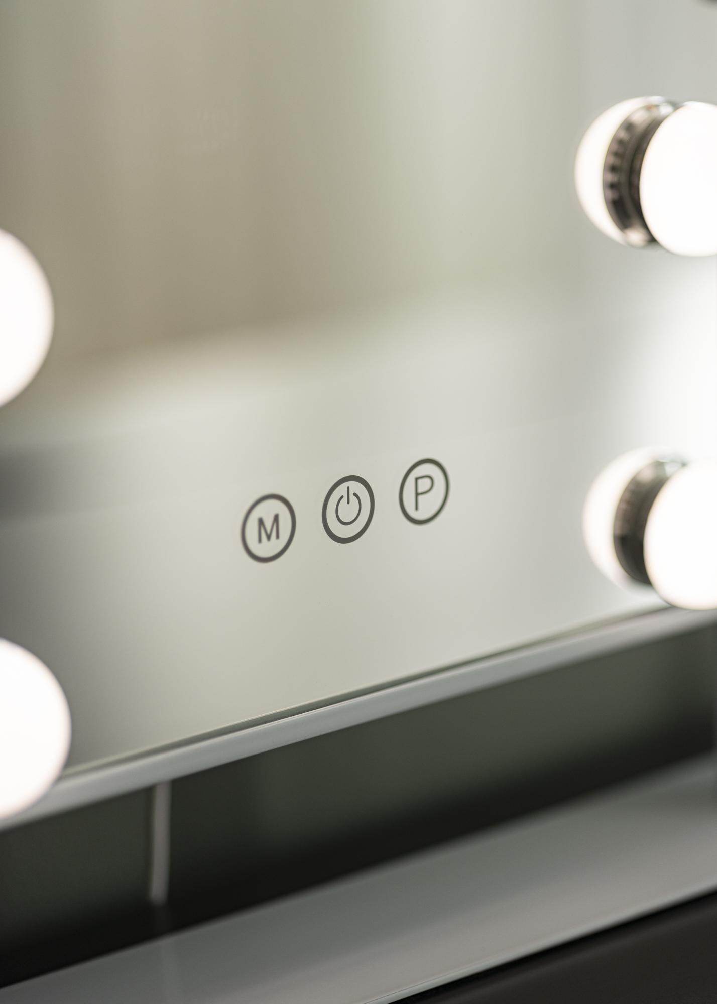 The lighting is activated using a touch button on the front of the mirror. There are also touch buttons for adjusting brightness and colour temperature so you can choose whatever settings suit the occasion. The button marked “M” sets the colour temperature and the button marked “P” adjusts the brightness. The mirror is powered using a plug.