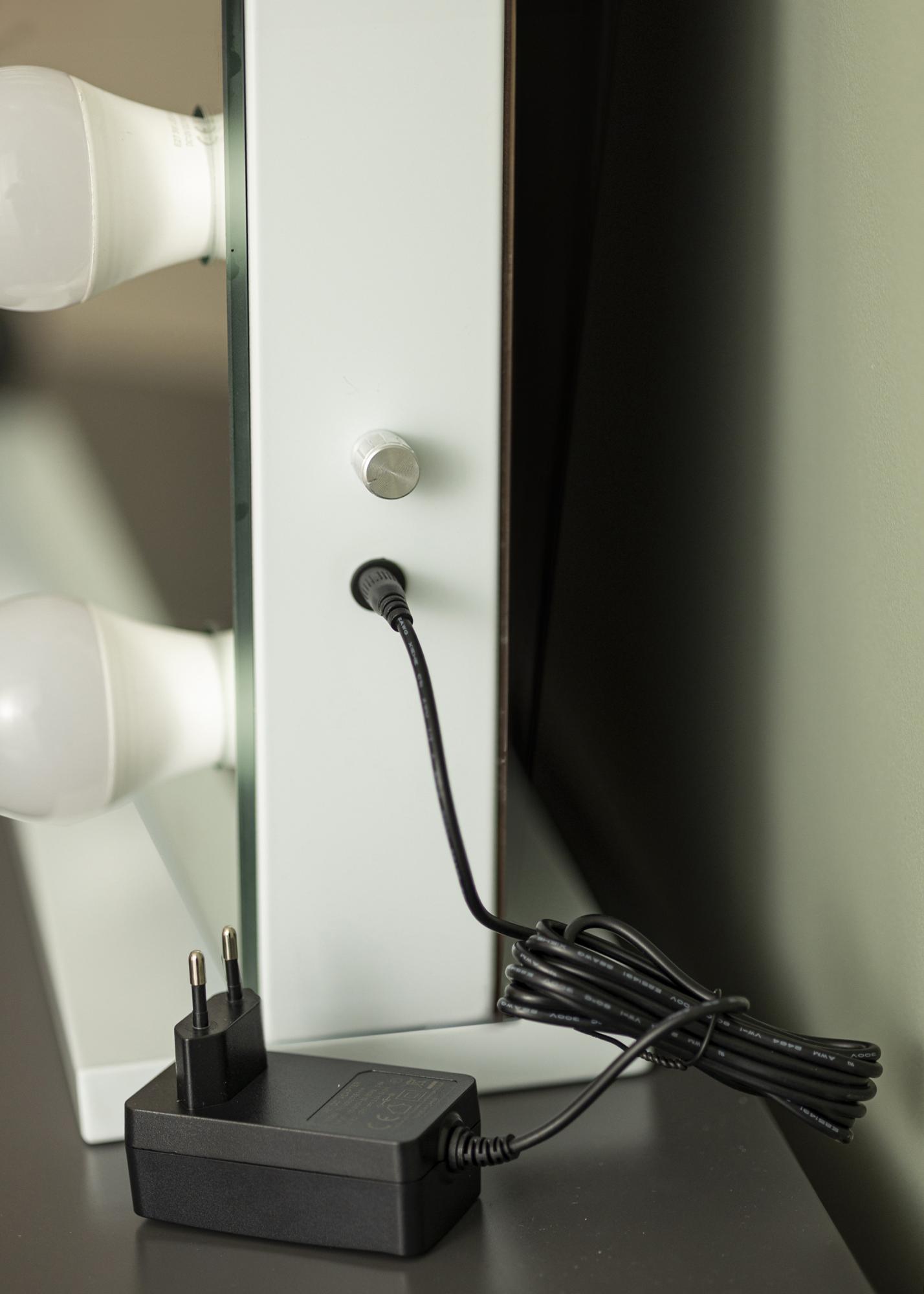 This unique makeup mirror has a design reminiscent of Hollywood makeup studios. The large 80x65 cm mirror is framed by 14 light bulbs with E27 sockets. These bulbs provide a balanced, even and cool white light that’s perfect for applying your makeup but also a stylish light source on the side table in the living room. The lighting is also adjustable giving you even more flexibility. Just turn the dimmer switch on the side of the mirror and set the light to whatever level you wish.