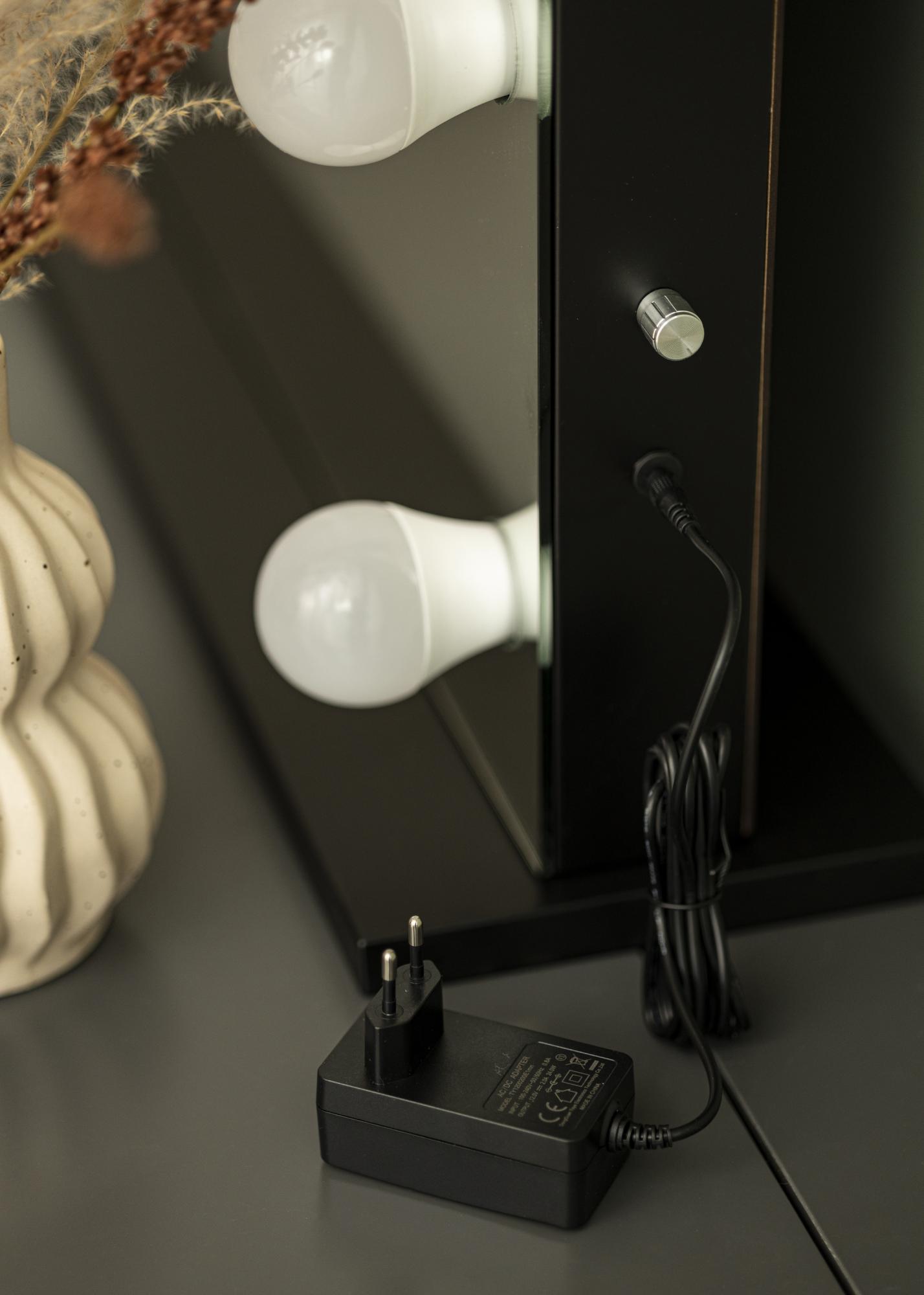 With a makeup mirror in a larger format, you can add style and function to the bedroom or living room. The surface of this mirror measures an impressive 100x80 cm which is beautifully framed by 15 light bulbs with E27 sockets. The clean design, classic rectangular shape and border of lights brings to mind the glamour of Hollywood. The bulbs emit a cool white light and can be adjusted to the desired brightness using the dimmer switch on the side of the mirror.