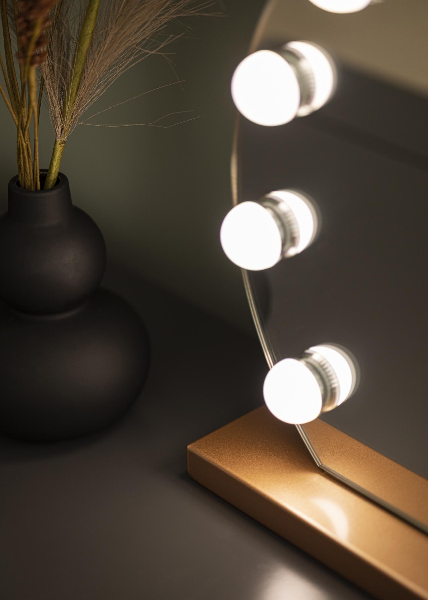 This 40x30 cm mirror has a classic round shape with 10 large LED lights around its outer edge. These lights give the mirror an exclusive look which is further enhanced by the beautiful rose gold colour of the stand. The lighting is activated by using the touch button on the front of the mirror. You can also set the colour temperature and brightness of the lights according to your personal preferences. These settings are accessed with the help of convenient touch buttons marked with "M" and “P” for adjusting colour temperature and brightness respectively. The three light temperatures you can choose from are warm, cool and natural light.