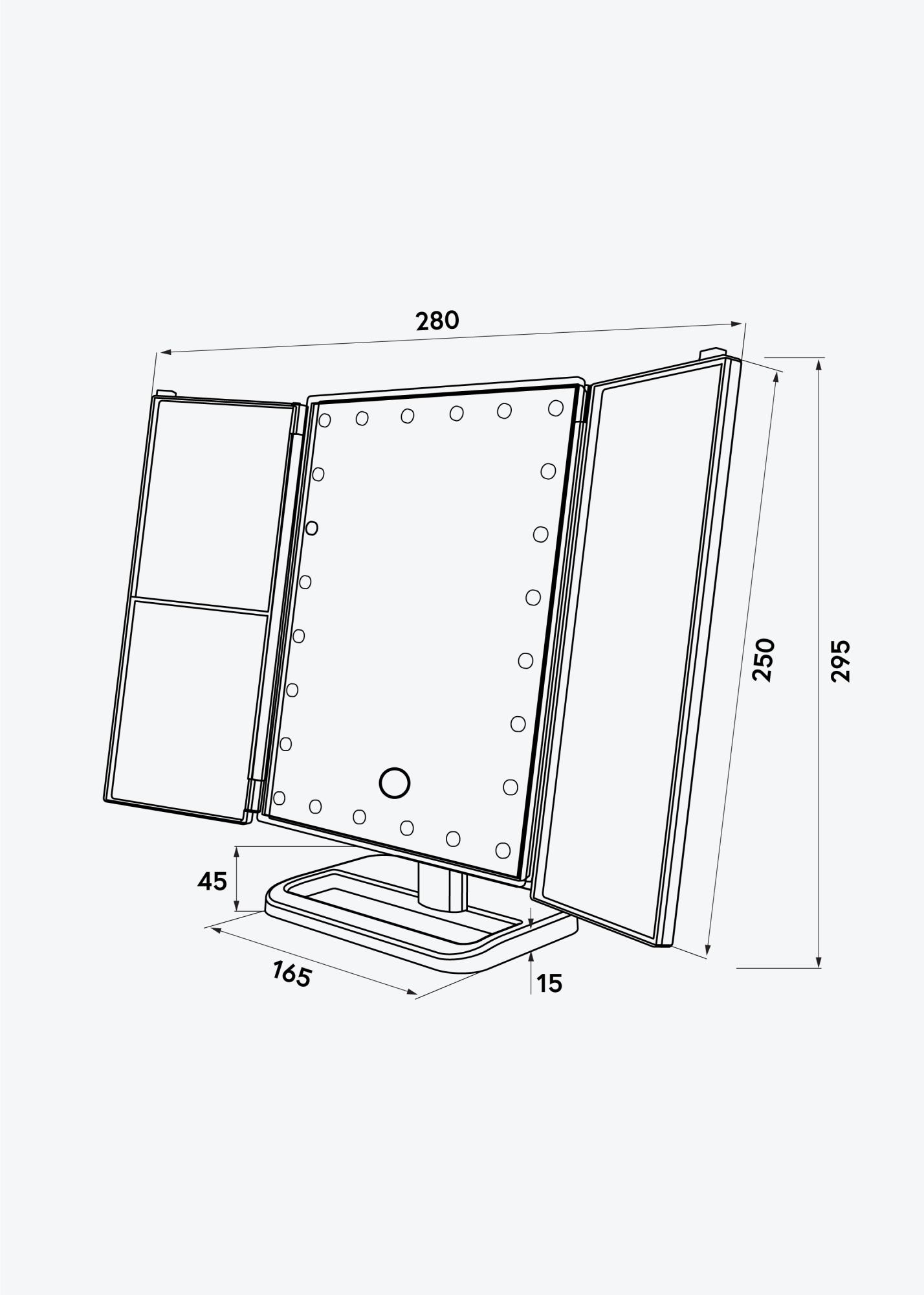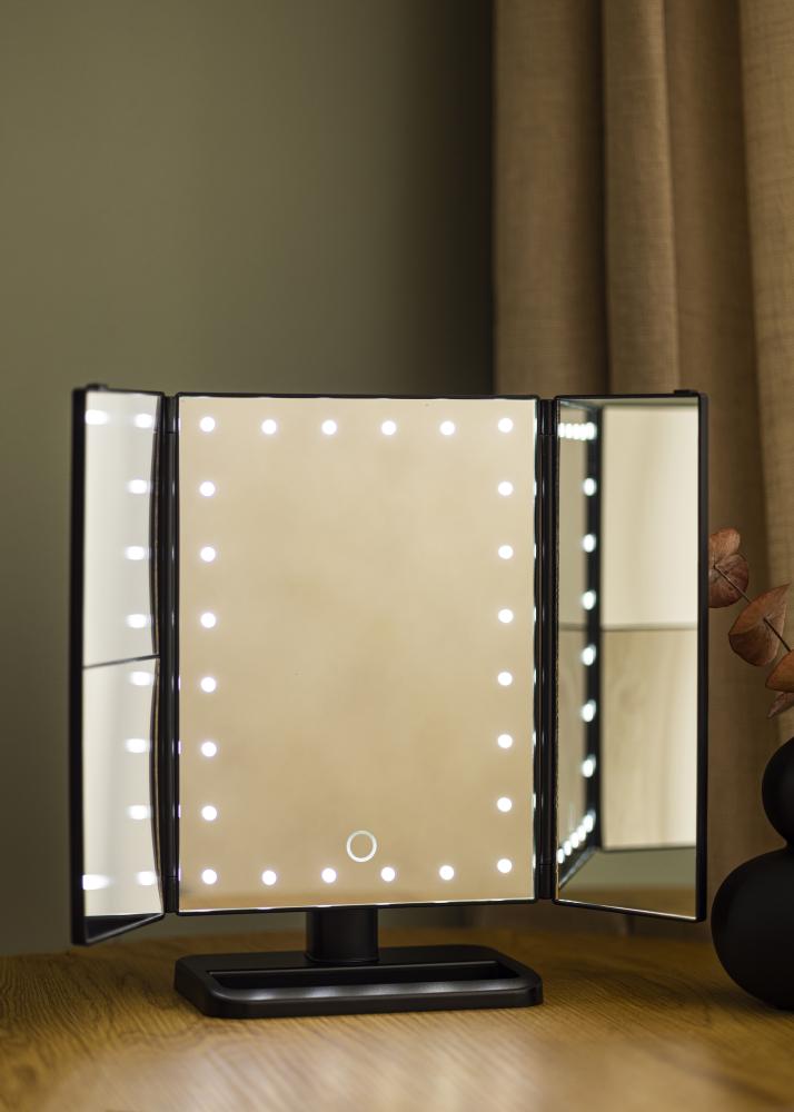 This makeup mirror is both practical and stylish with a classic black colour and LED lighting. It has a smart design with folding sides which allow you to see yourself from a variety of angles. The large central mirror is fitted with standard mirror glass while the smaller mirrors to the sides offer 2x, 3x, and 10x zoom.