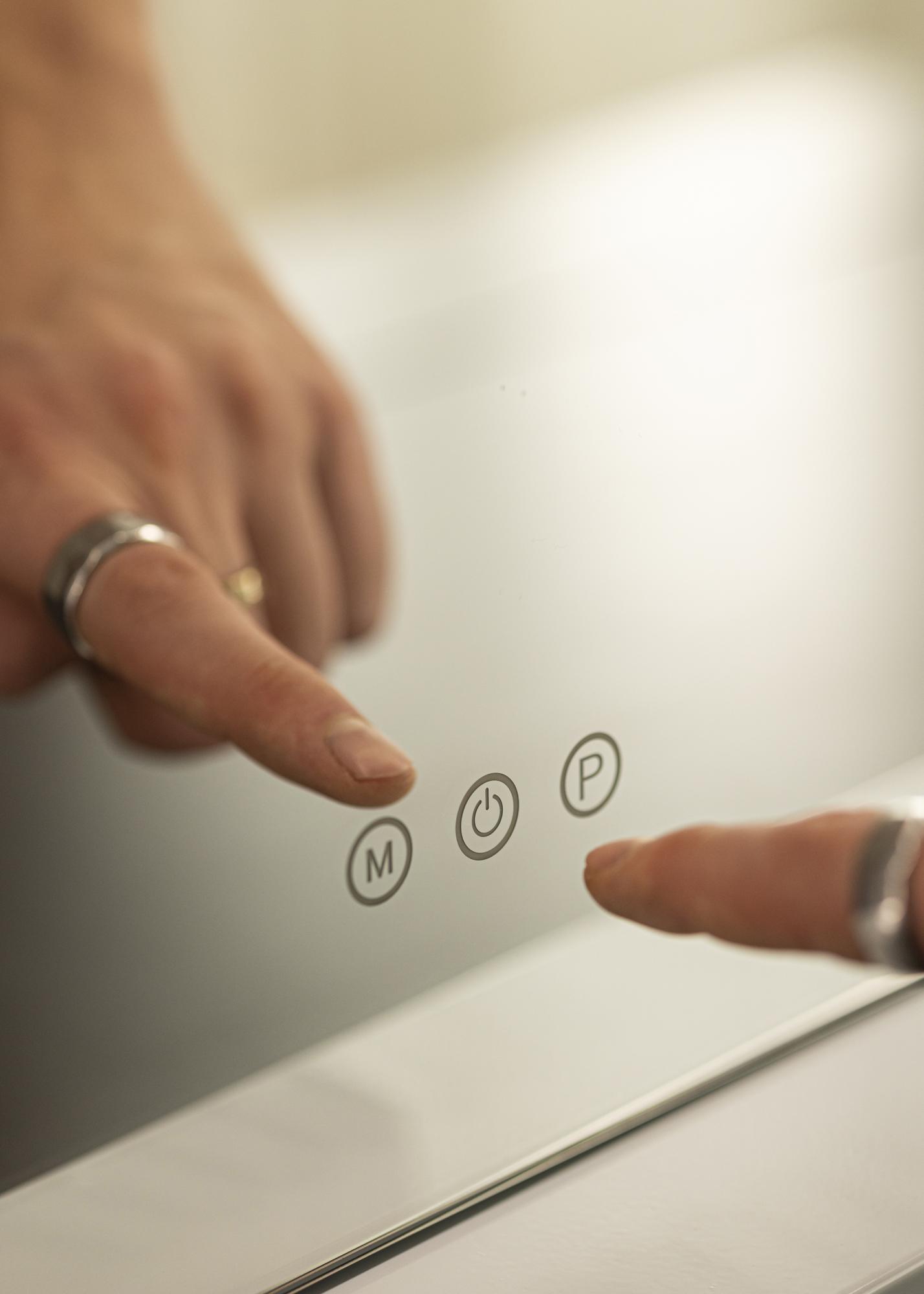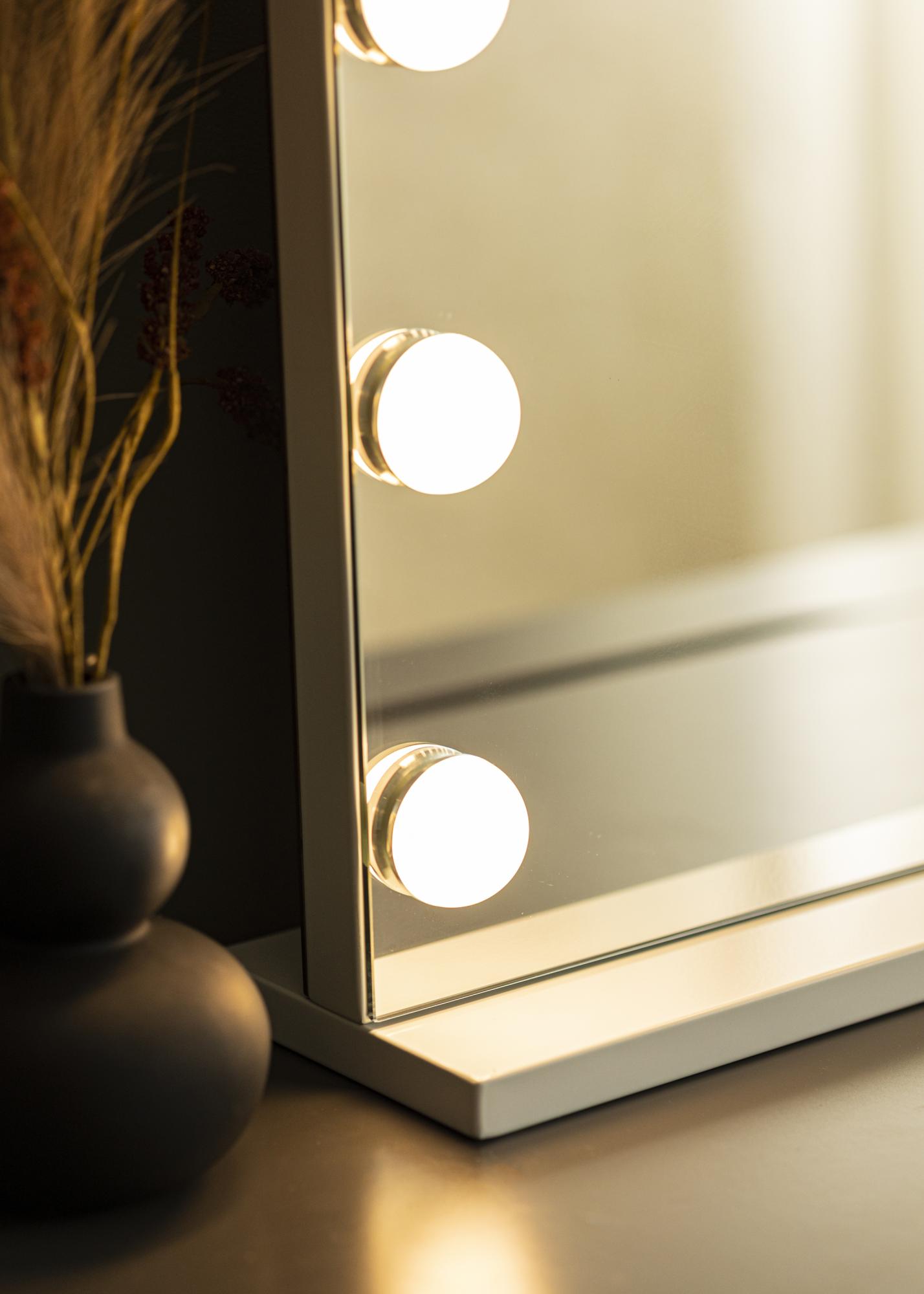 Let this makeup mirror become a stylish interior detail in your home! The integrated LED lighting, with 15 large LED bulbs arranged like a frame around the 80x60 cm mirror surface, gives the mirror a very elegant expression that enhances any room. The LED lighting can be adjusted to your needs, as you can set both brightness and colour temperature. The light settings are easily adjusted via the touch buttons located on the mirror surface – the "P" button adjusts the brightness and the "M" button adjusts the colour temperature. The three settings for colour temperature are warm, cold, and natural light. Electrical connection is made with a plug.