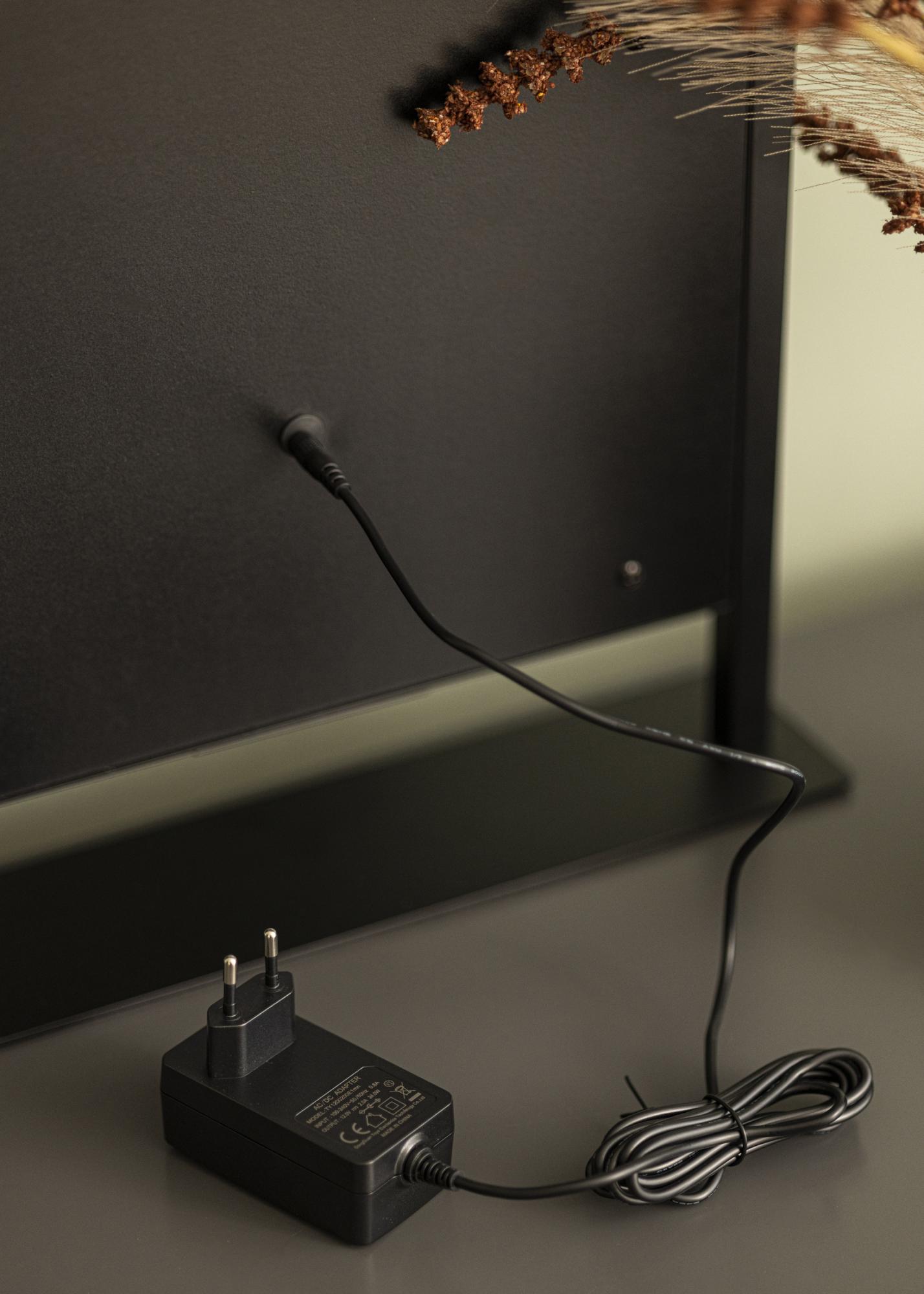 The mirror has a stylish black colour that matches well with the majority of rooms. The neutral colour is highlighted by 12 LED lights which enhance the stylish appearance even more. The inbuilt LED lights are arranged as a frame around the 30x41 cm mirror. If you hold down the touch button on the front of the mirror for a few seconds, you can dim the lighting to a brightness that suits you. The mirror is powered using a plug.