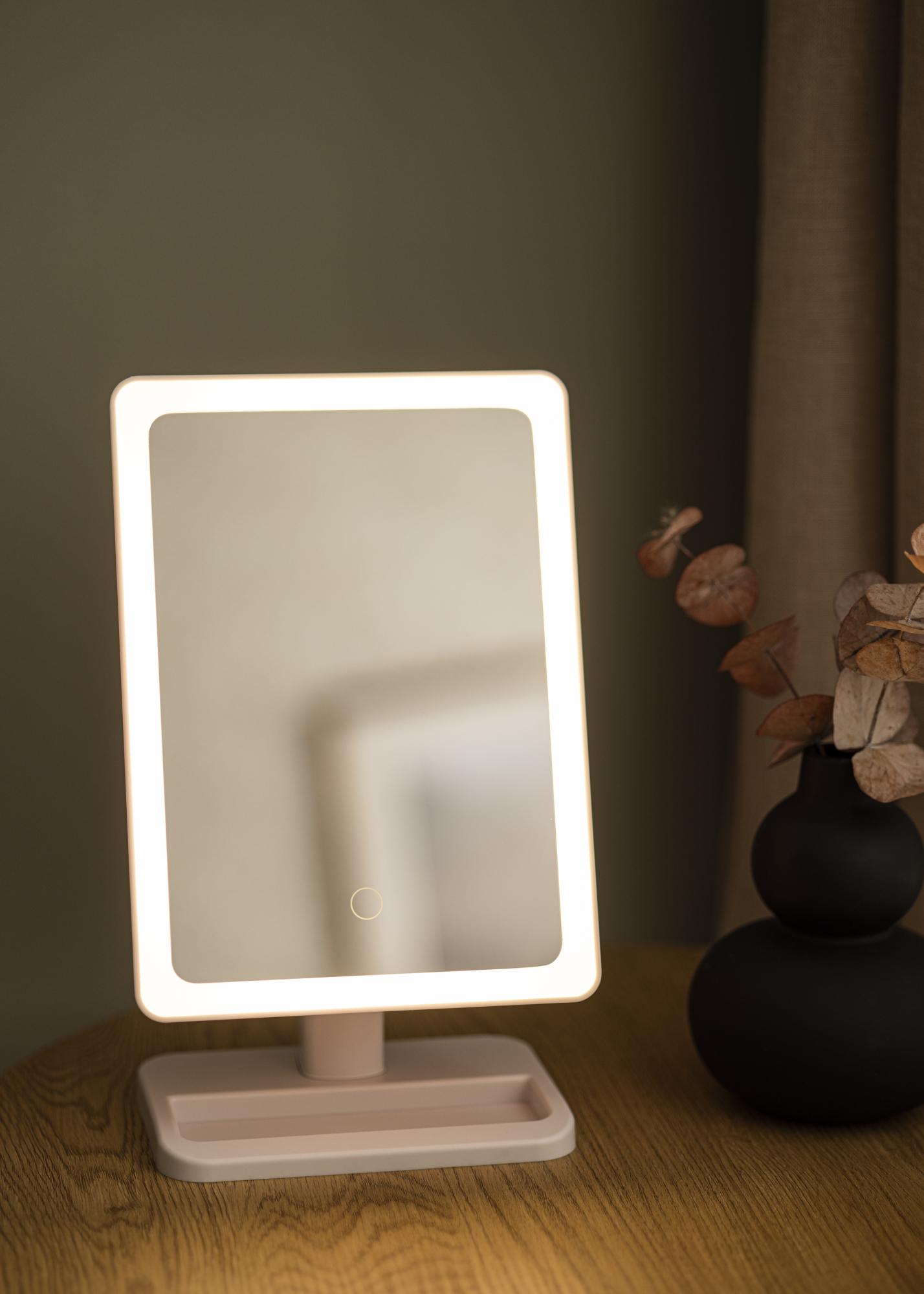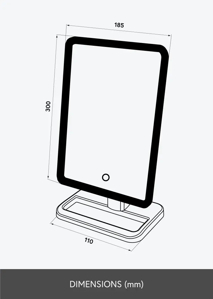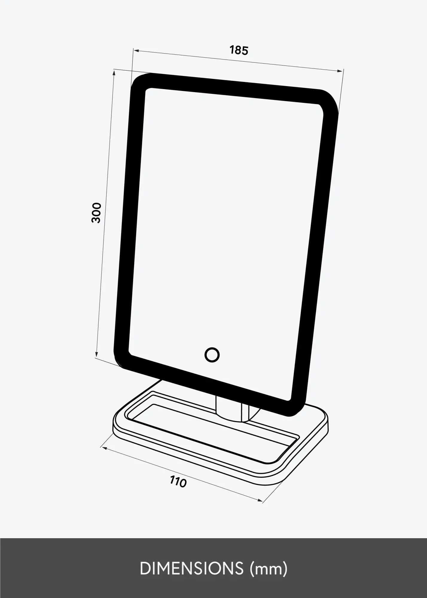 The mirror has a stylish appearance in neutral white and LEDs that frame the 16.5x25 cm mirror. You can adjust the lighting by holding down the button on the mirror for a few seconds and setting the brightness to a level that suits you best. The smart design allows you to tilt the mirror to an angle of your choosing and the light weight makes the mirror easy to move around. An additional smaller mirror with 10x zoom is also included. It's perfect for when you need to see your face in extra detail. The mirror is powered by an inbuilt battery that’s charged using the charging cable provided.
