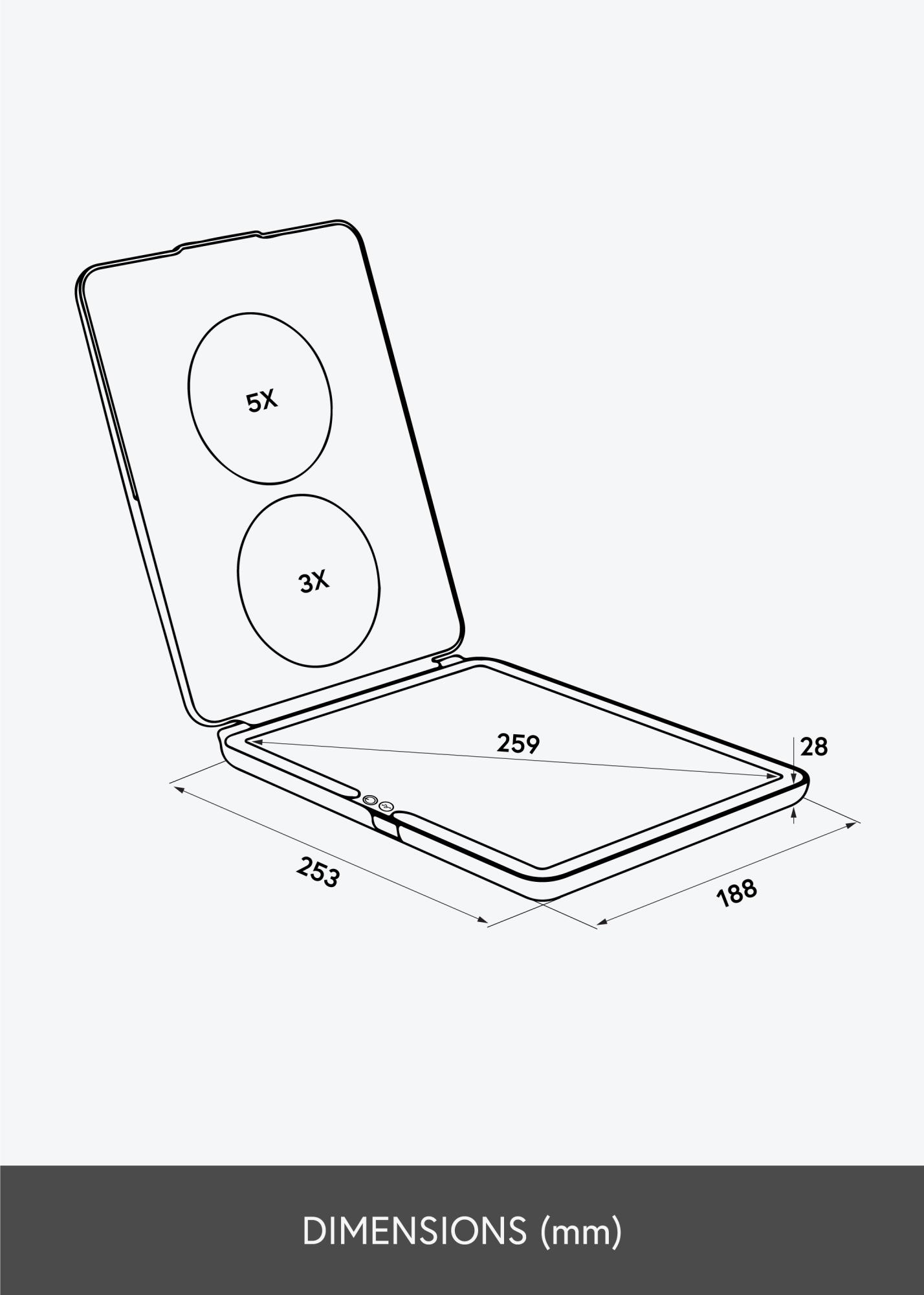 Do you want a makeup mirror that’s pocket-sized and fits perfectly in your jacket or bag? Then this compact makeup mirror is a great choice! The 18.5x25 cm mirror has a foldable design that protects the mirror from dirt and dust. The hinge mechanism also allows you to set the angle of the mirror when it’s in use. As well as the main mirror, it has a zone with 5x zoom as well as a zone with 3x zoom.