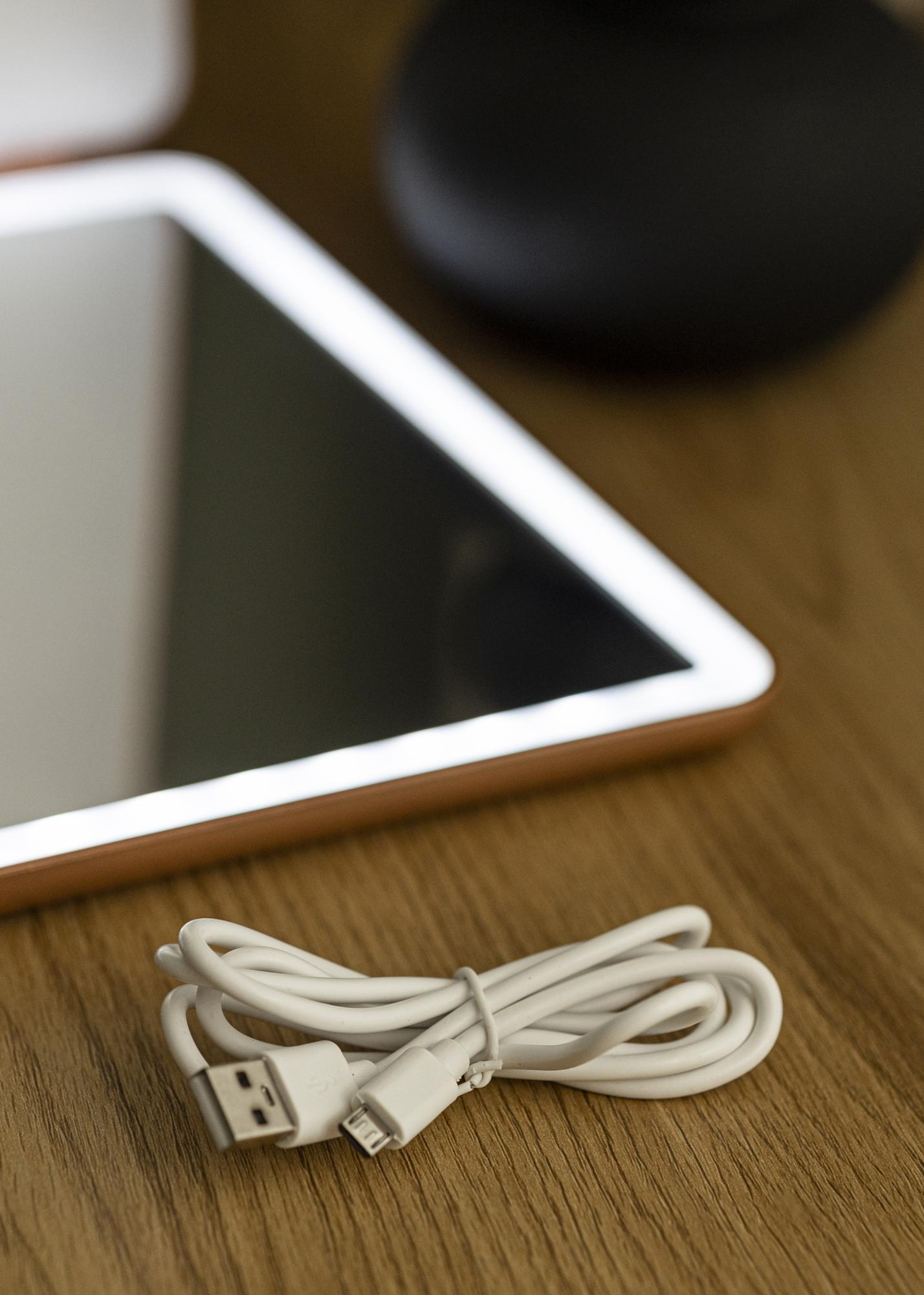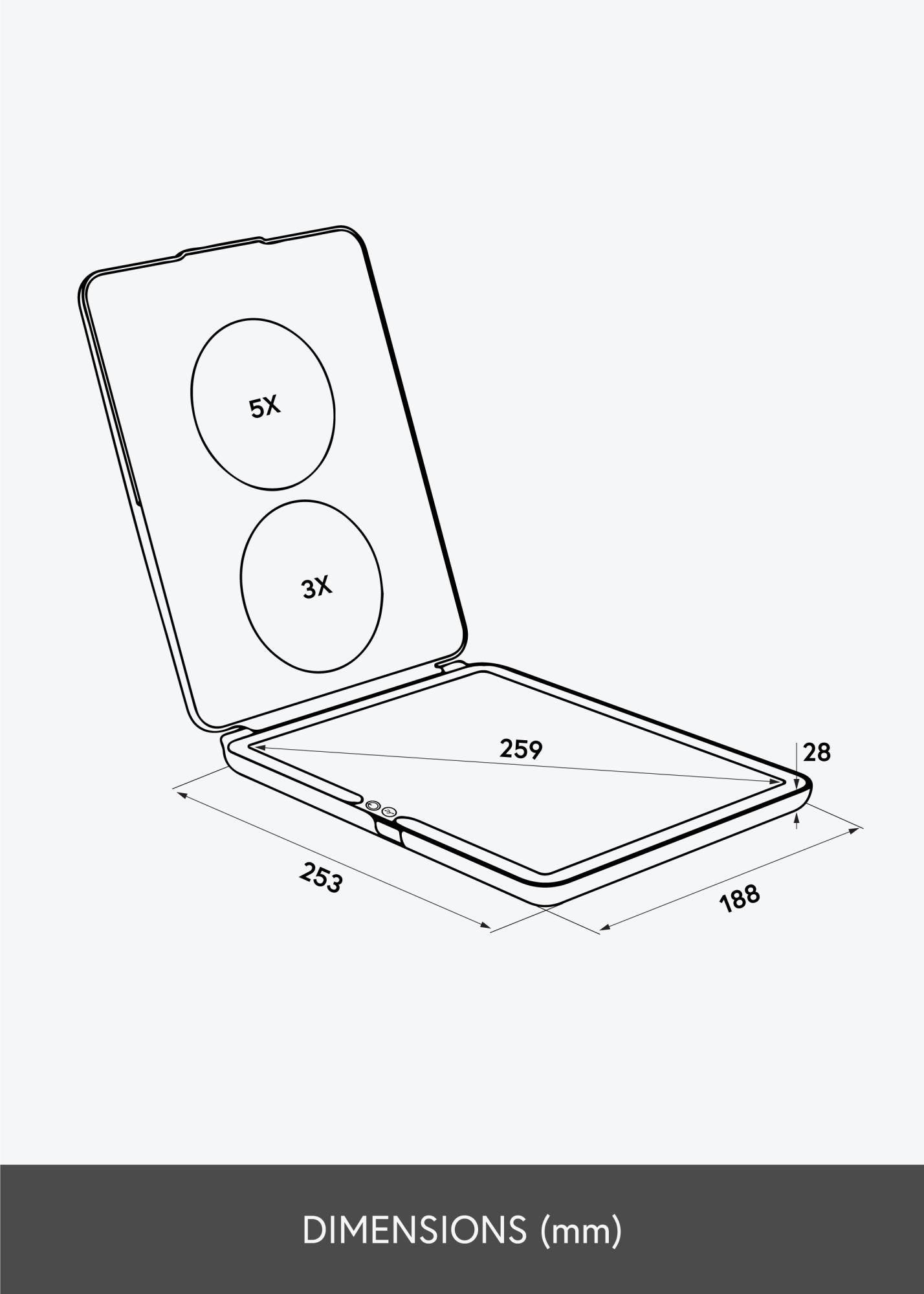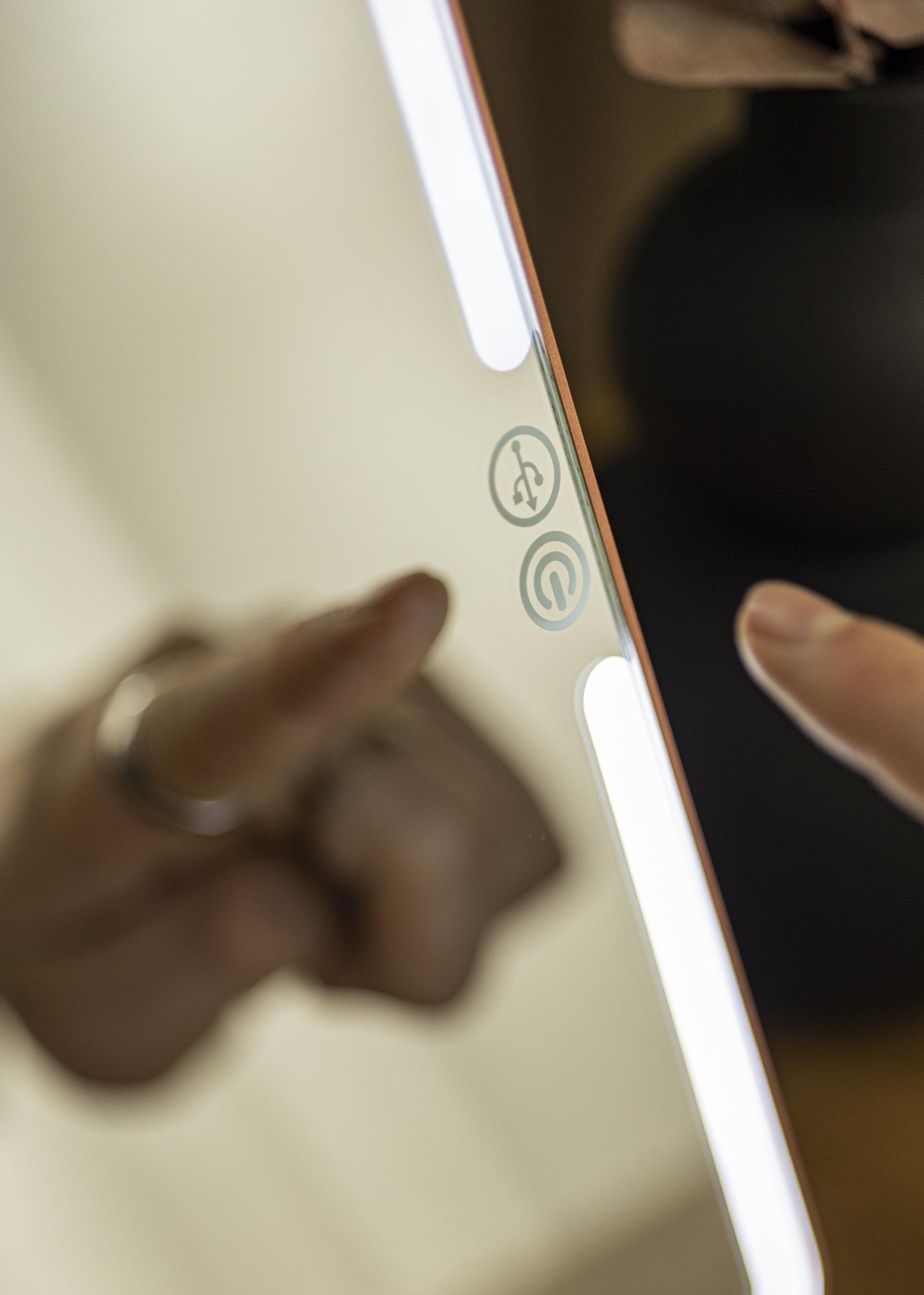 The inbuilt LEDs illuminate your face with a pleasant, even light. The lighting is powered by an inbuilt battery that’s easily recharged via a USB connection. The mirror is fitted with touch buttons that turn the lighting on and off and allow you to dim the light. If you fold up the mirror when it’s still on, it automatically goes into power-saving mode by turning the light off until you open the mirror again.