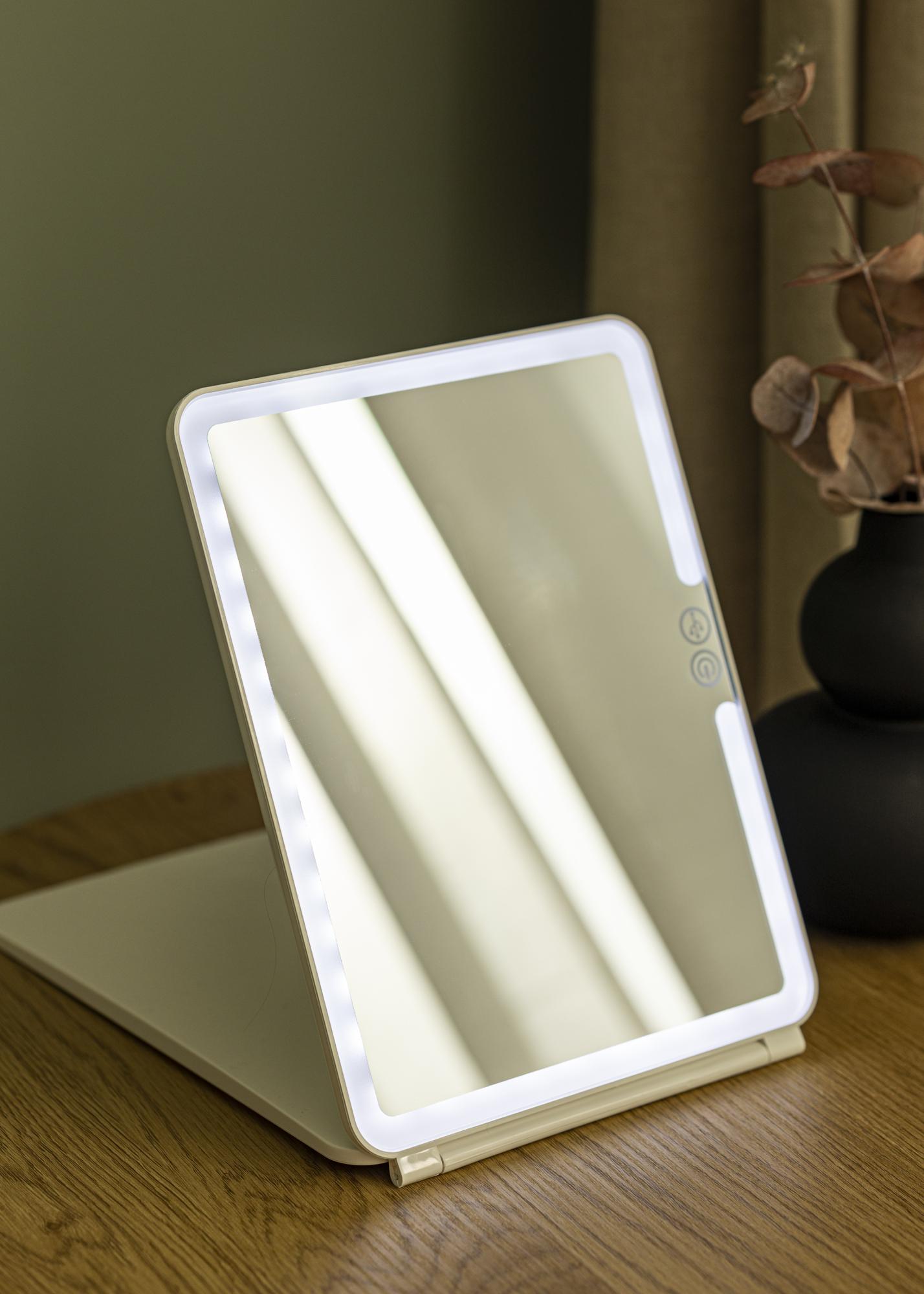 This makeup mirror comes in a smaller format with a smart folding design that makes it easy to set the angle of the mirror when you want to use it. The foldable design saves space and protects the mirror when it’s in your bag. It’s perfect to have with you when you are out and about as it is both compact, lightweight and has inbuilt lighting that lights your face evenly regardless of your surroundings. The lighting is switched on and off using a touch button on the frame of the mirror. If you hold down the button for a few seconds, you can dim the light and choose one of three colour temperatures.