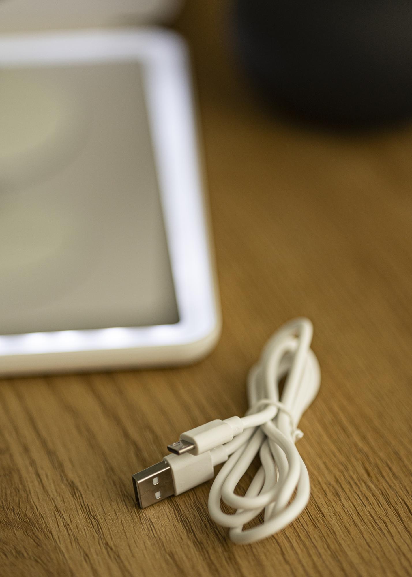 If the mirror is folded while the lights are still on, it automatically goes into power saving mode until you open the mirror again. This makeup mirror is battery powered and recharges via a USB connection.