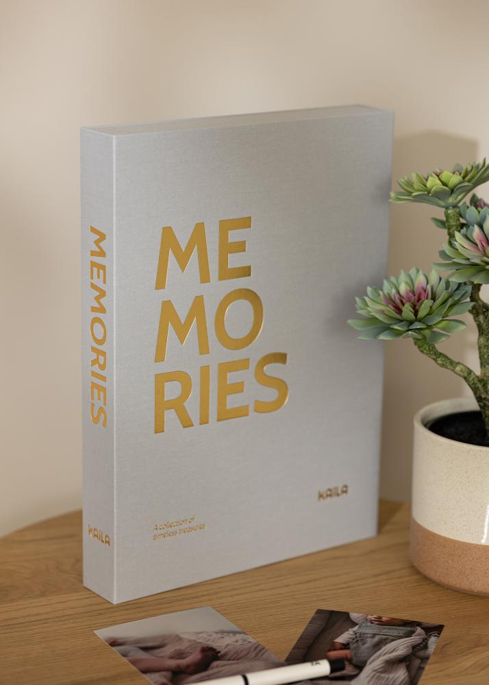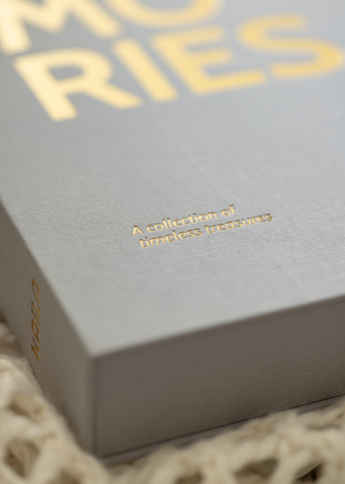 The album is stylishly covered in grey fabric and decorated front and back with "MEMORIES" in gold-coloured text. The album title also includes the evocative phrase "A collection of timeless treasures", printed in the bottom left corner.