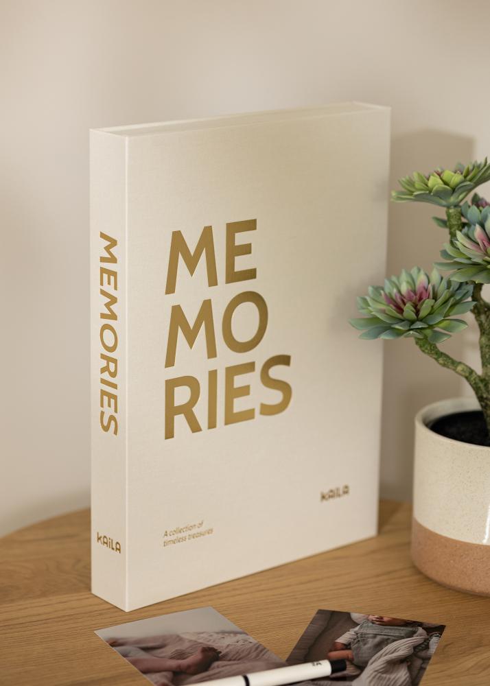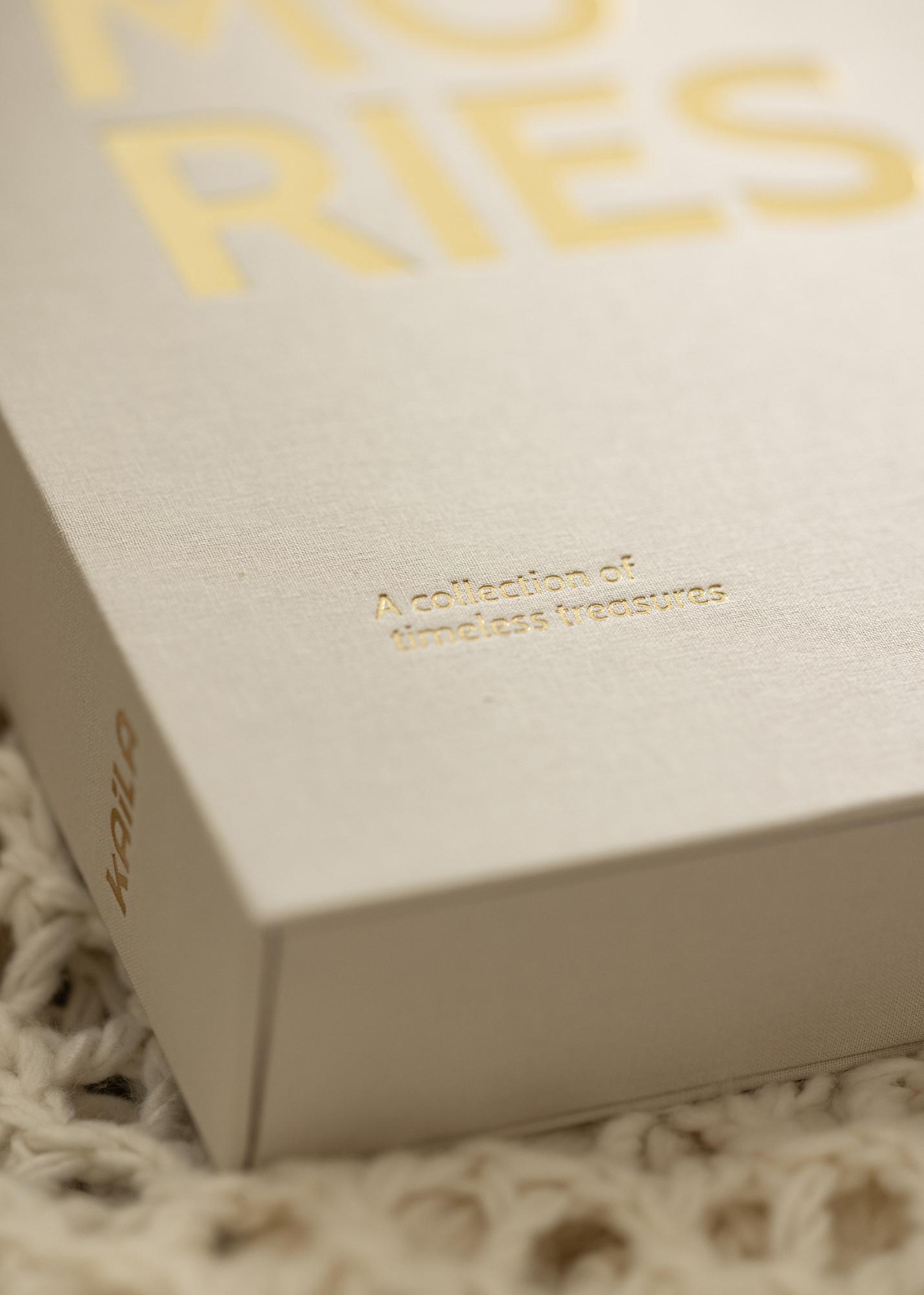 The album is stylishly covered in light grey fabric and decorated front and back with "MEMORIES" in gold-coloured text. The album title also includes the evocative phrase "A collection of timeless treasures", printed in the bottom left corner.