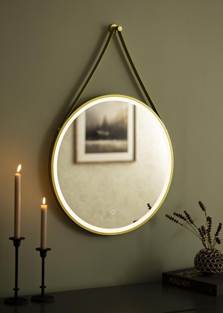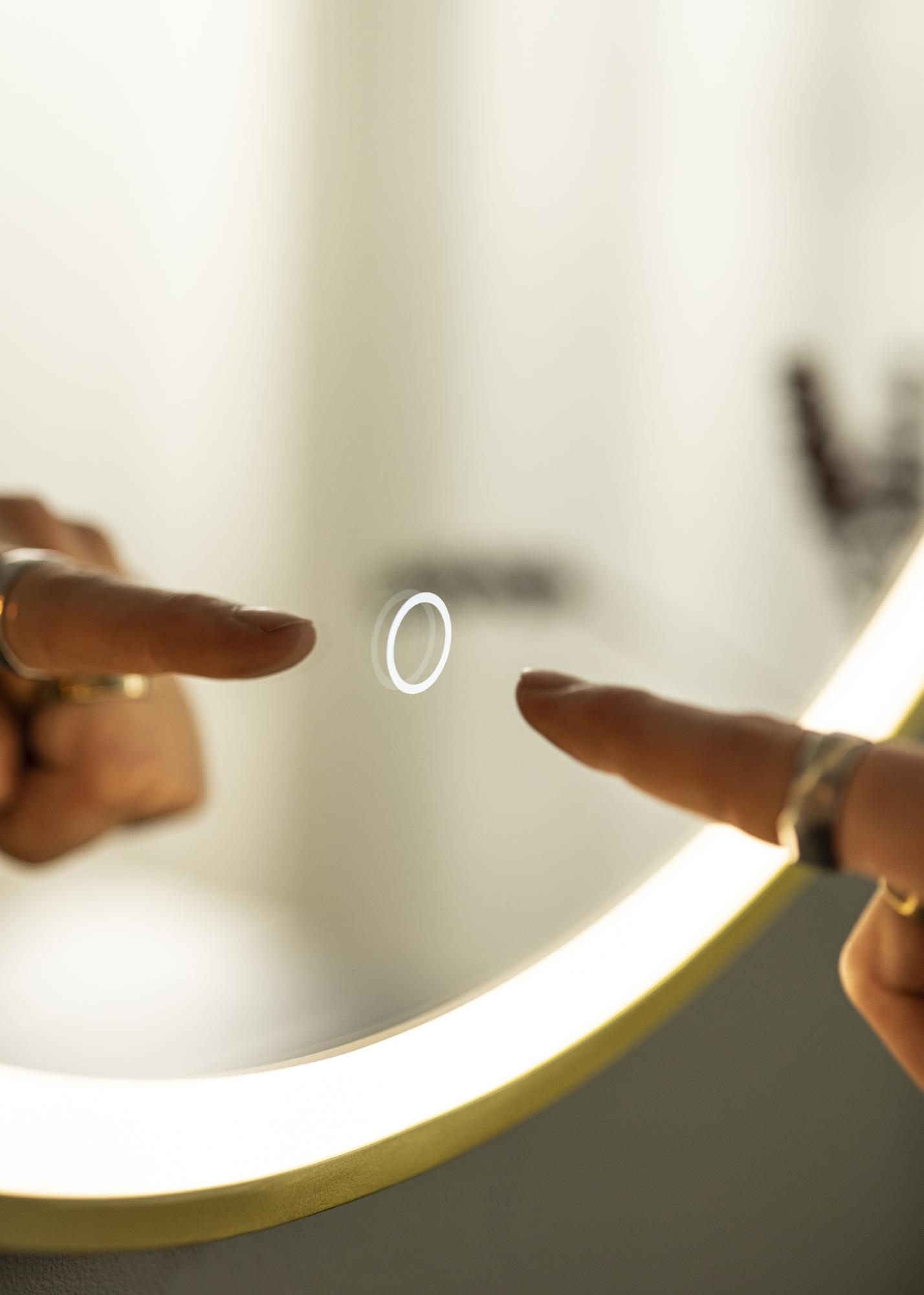 This fabulous unique wall mirror is the perfect decor detail to add the finishing touch to your bathroom. It has a modern round design with a gold frame and gold coloured wall mounting accessories. To ensure that the mirror maintains a stable position, it is wall mounted using brackets located behind the mirror in addition to the hanging accessories above. This mirror is intended for fixed installation and should be connected to a switch. For the lighting to work properly, it must be connected to a standard switch, not a dimmer switch.