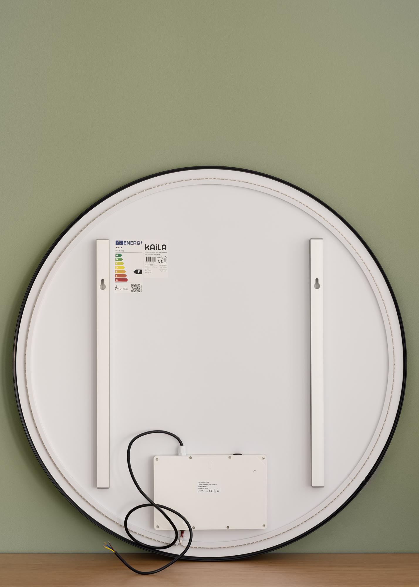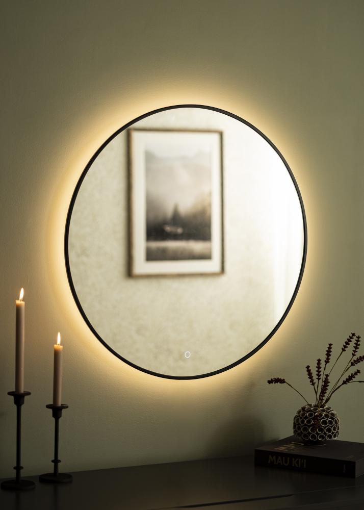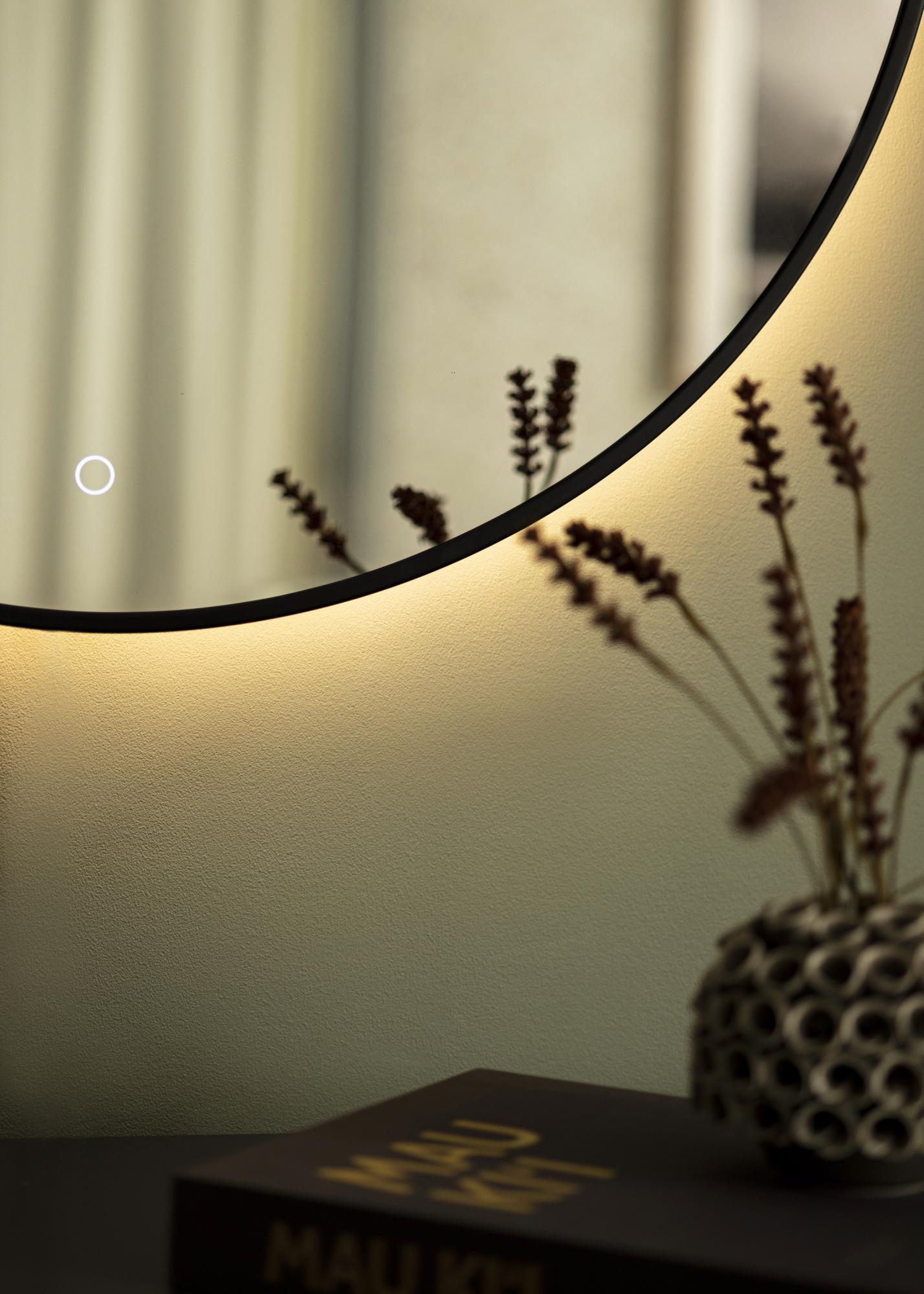 This is a stylish mirror with LED lighting which looks just as good in the hall as it does in the bathroom. The mirror has a classic round shape and a sophisticated black metal frame. The brightness of the integrated 3000K LED lighting can be adjusted to between 10%-100%. This allows you to set your lighting to a brightness that suits you and adjust it whenever your needs change. To dim the lighting, hold the touch button on the lower edge of the mirror for a few seconds. The LEDs are positioned behind the mirror to give the lighting a softer glow.