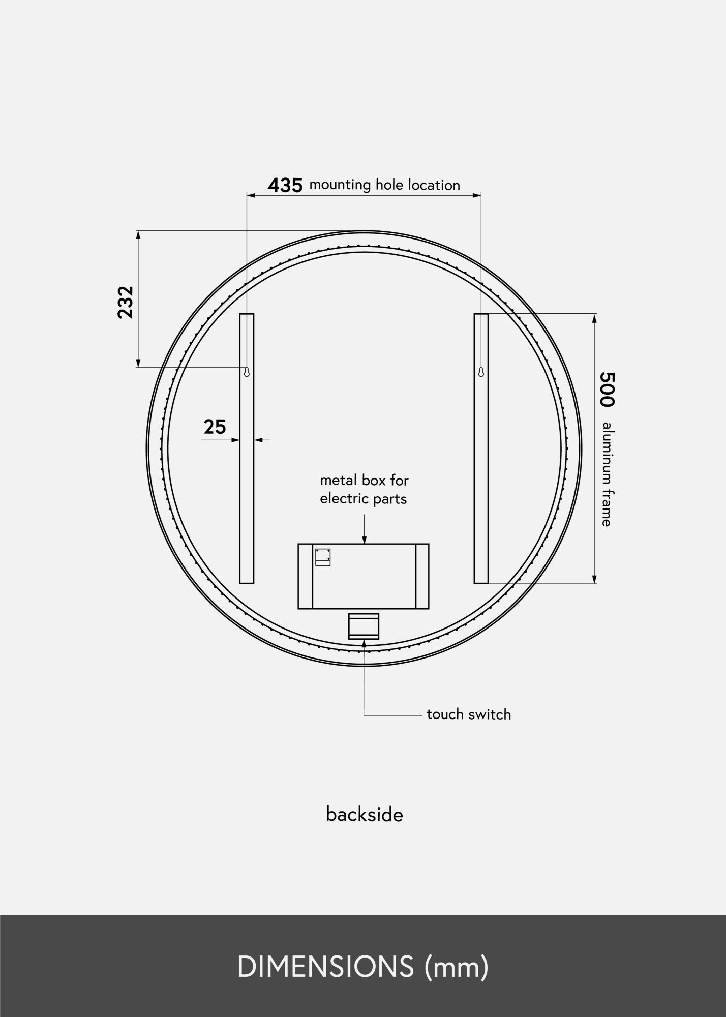 This circular wall mirror has a diameter of 78.5 cm. This mirror is intended for fixed installation and should be connected to a switch. For the lighting to work properly, it must be connected to a standard switch, not a dimmer switch.