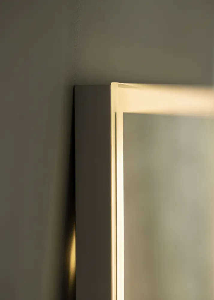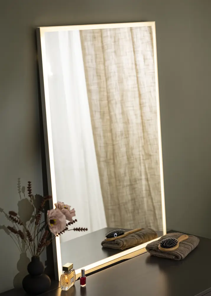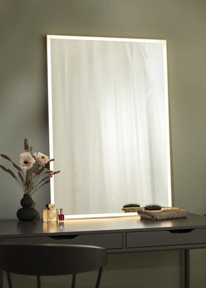 This stylish mirror with inbuilt lighting delivers the perfect, even light required for applying makeup and adds a touch of glamour to your decor! The mirror has LED lighting around the frame which beautifully illuminates the 76x107 cm mirror surface with a glow of 3000K. The lighting has a pleasant glow which you can adjust. Simply hold the touch button in the lower edge of the mirror for a few seconds.