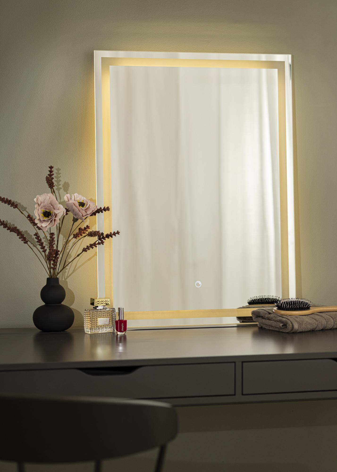 If you want a modern, minimalist mirror with inbuilt lighting then this is the mirror for you. It’s fitted with energy-saving LED lights that provide an even light perfect for applying makeup or whatever your daily routine entails. The lighting is situated behind the mirror but shines through the glass to create an elegant frame on the front of the mirror. You can adjust the intensity of the light by holding the button on the mirror for a few seconds.