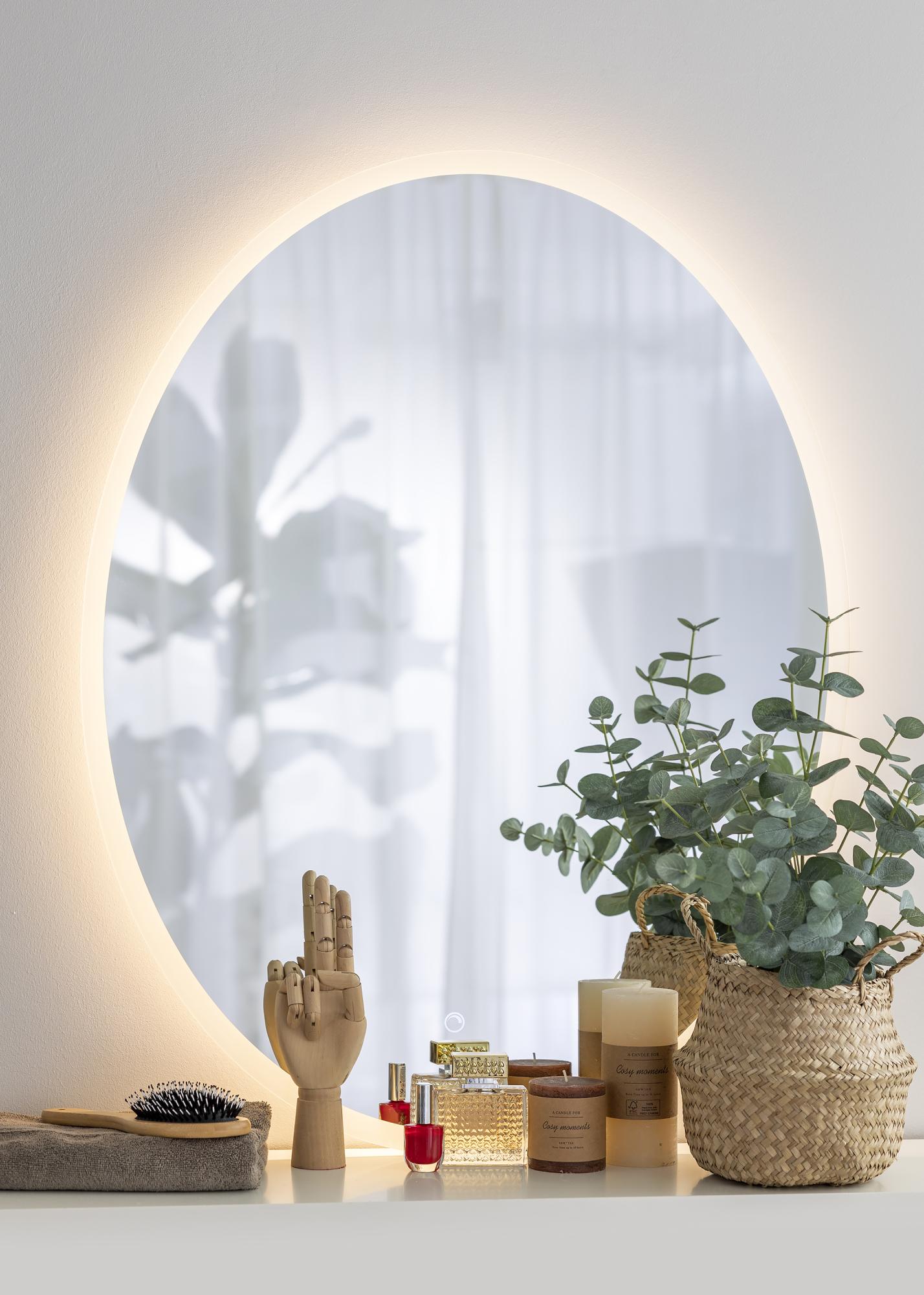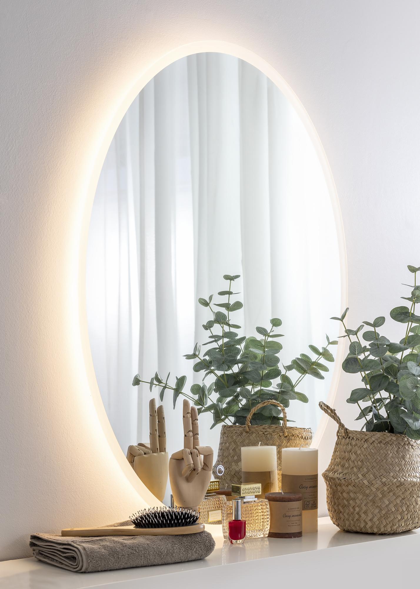 With its oval shape and integrated LED lighting, this really is a bathroom mirror with an elegant design! The integrated LED is dimmable, and can be adjusted by pressing the watertight touch button on the screen. The mirror is lit from behind by a warm, white 3000K light, which gives a beautiful glow at the front. LED is an energy efficient light source that makes for an even and natural light. The mirror is approved for bathroom use. This mirror is intended for fixed installation and for connecting to a light switch. For the mirror to function correctly, it must be connected to a standard switch, not a dimmer switch.
