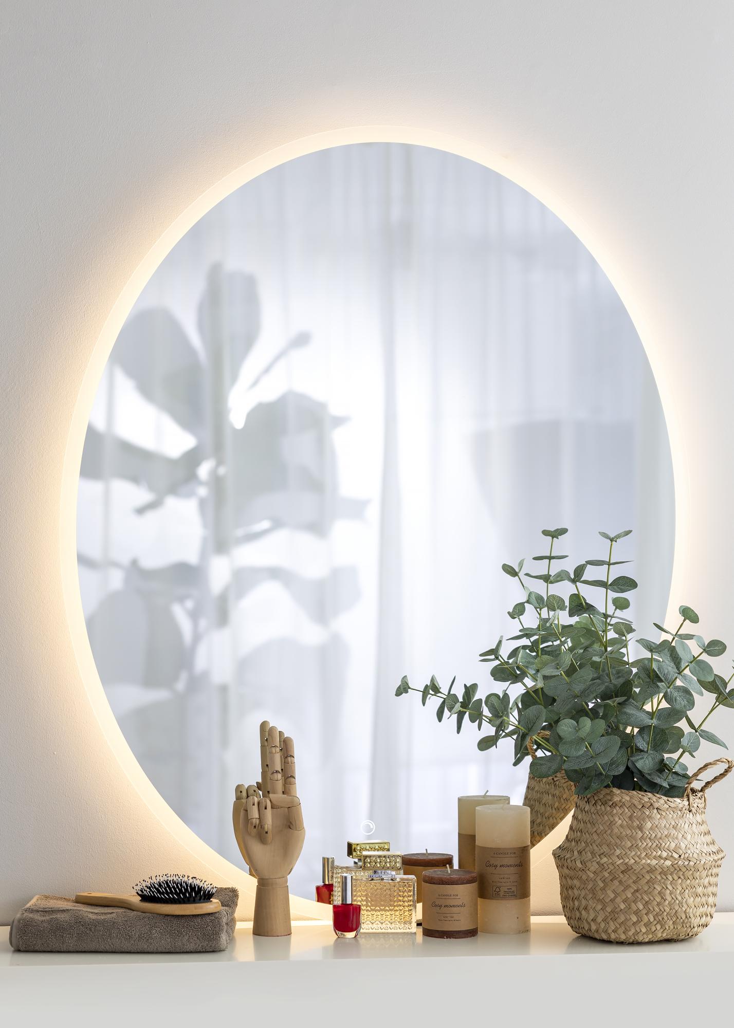 With its oval shape and integrated LED lighting, this really is a bathroom mirror with an elegant design! The integrated LED is dimmable, and can be adjusted by pressing the watertight touch button on the screen. The mirror is lit from behind by a warm, white 3000K light, which gives a beautiful glow at the front. LED is an energy efficient light source that makes for an even and natural light. The mirror is approved for bathroom use. This mirror is intended for fixed installation and for connecting to a light switch. For the mirror to function correctly, it must be connected to a standard switch, not a dimmer switch.