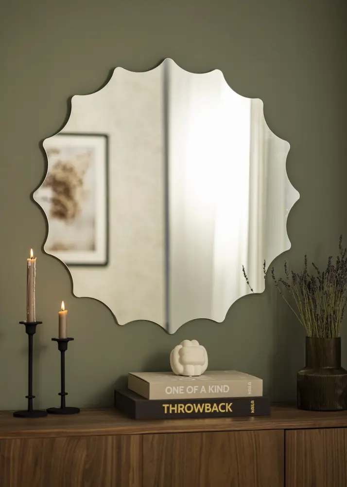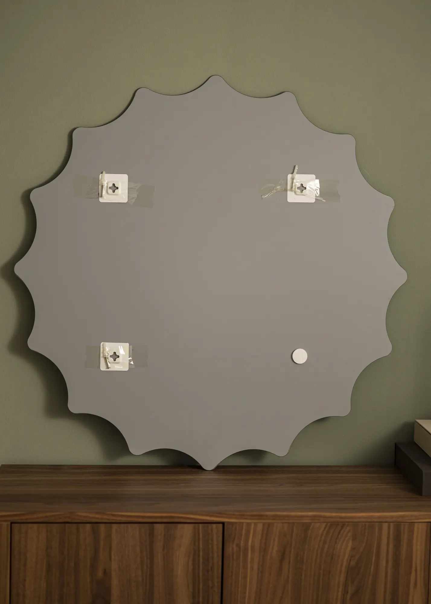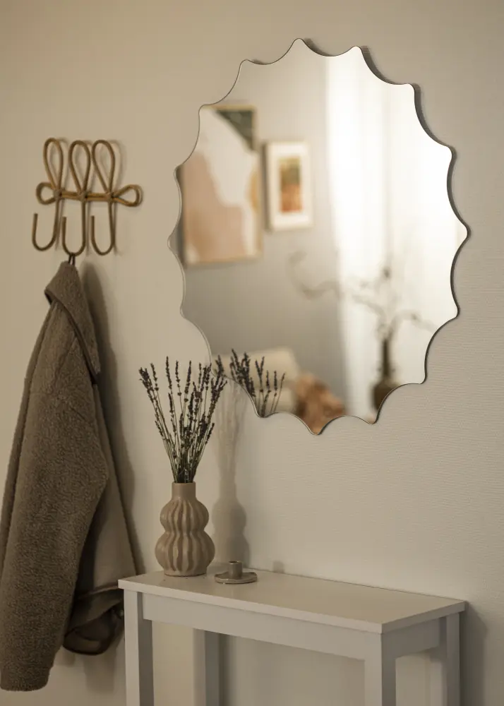 Stylish mirror from KAILA with an eye-catching shape that adds the finishing touch to a creative interior. The sun-shaped design creates a fascinating focal point, while the thin and colourless glass retains that classic look. The wall mirror is unframed, which enhances its clean and elegant lines. Add this flowing mirror to the hall, bedroom or living room, via the cleverly designed wall bracket, and add a splash of style to your home. The mirror has a diameter of 80 cm.
