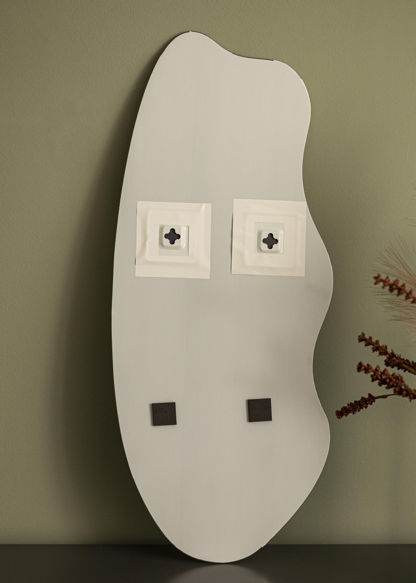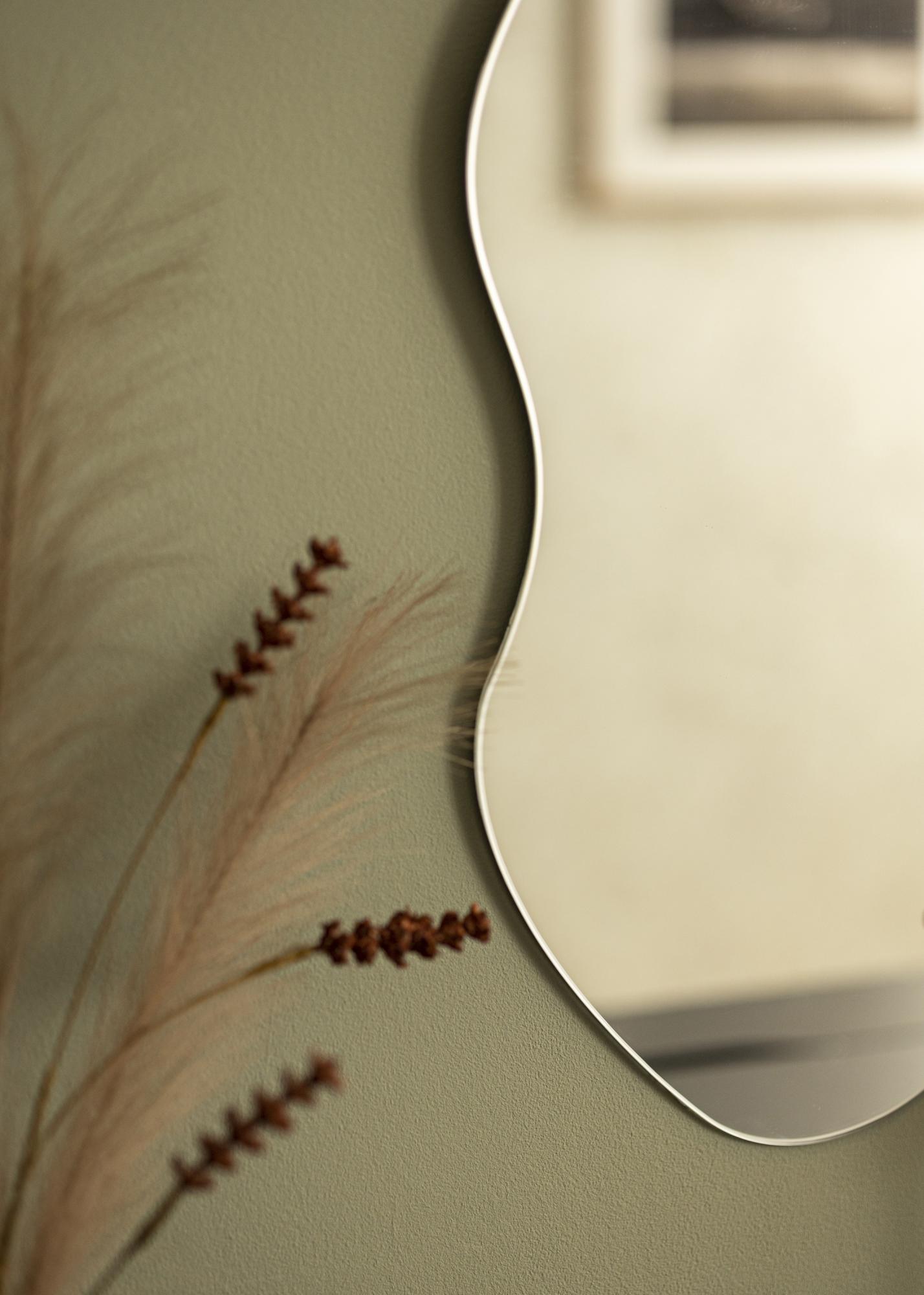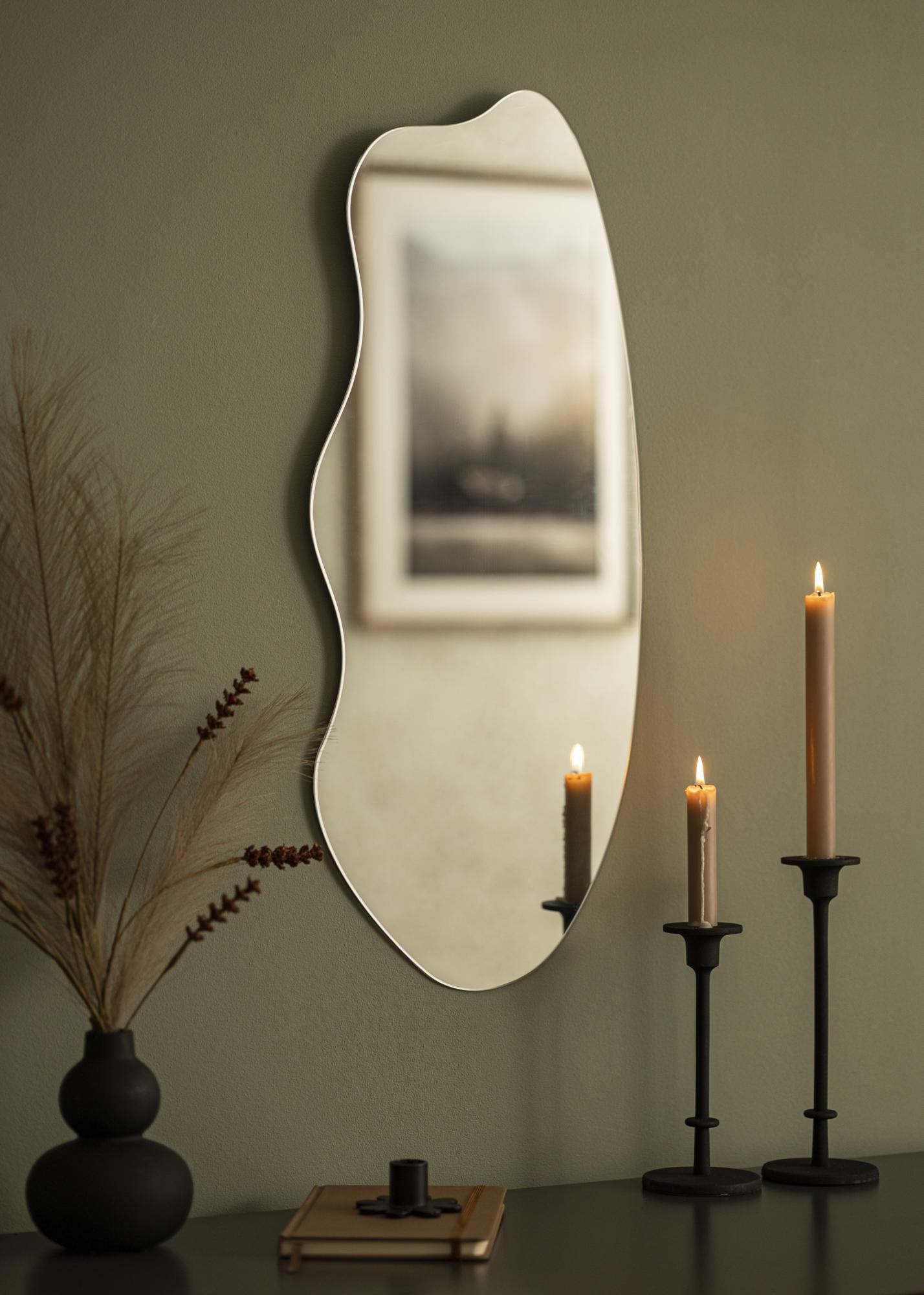 An asymmetrical wall mirror is an eye-catching decor detail perfect for every home. This mirror has a unique shape with one long, rounded side and an undulating form on the other. Together they create an exciting and elegant piece of wall decor. The mirror works just as well in the hall as it does in the living room. It also makes an exceptional and modern bathroom mirror.