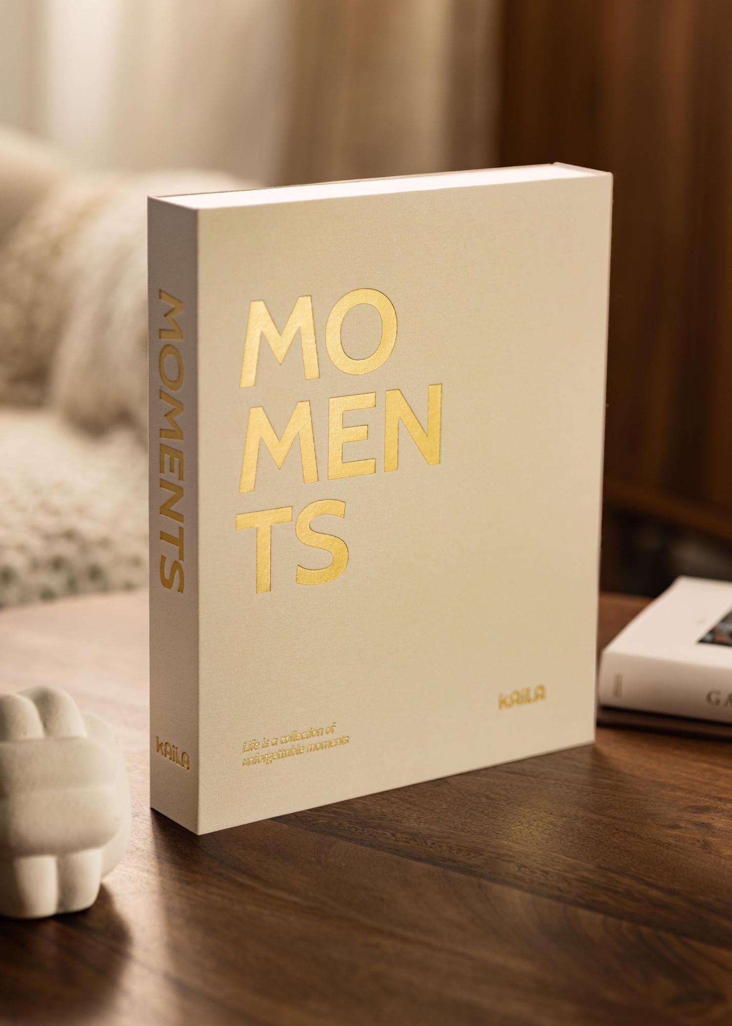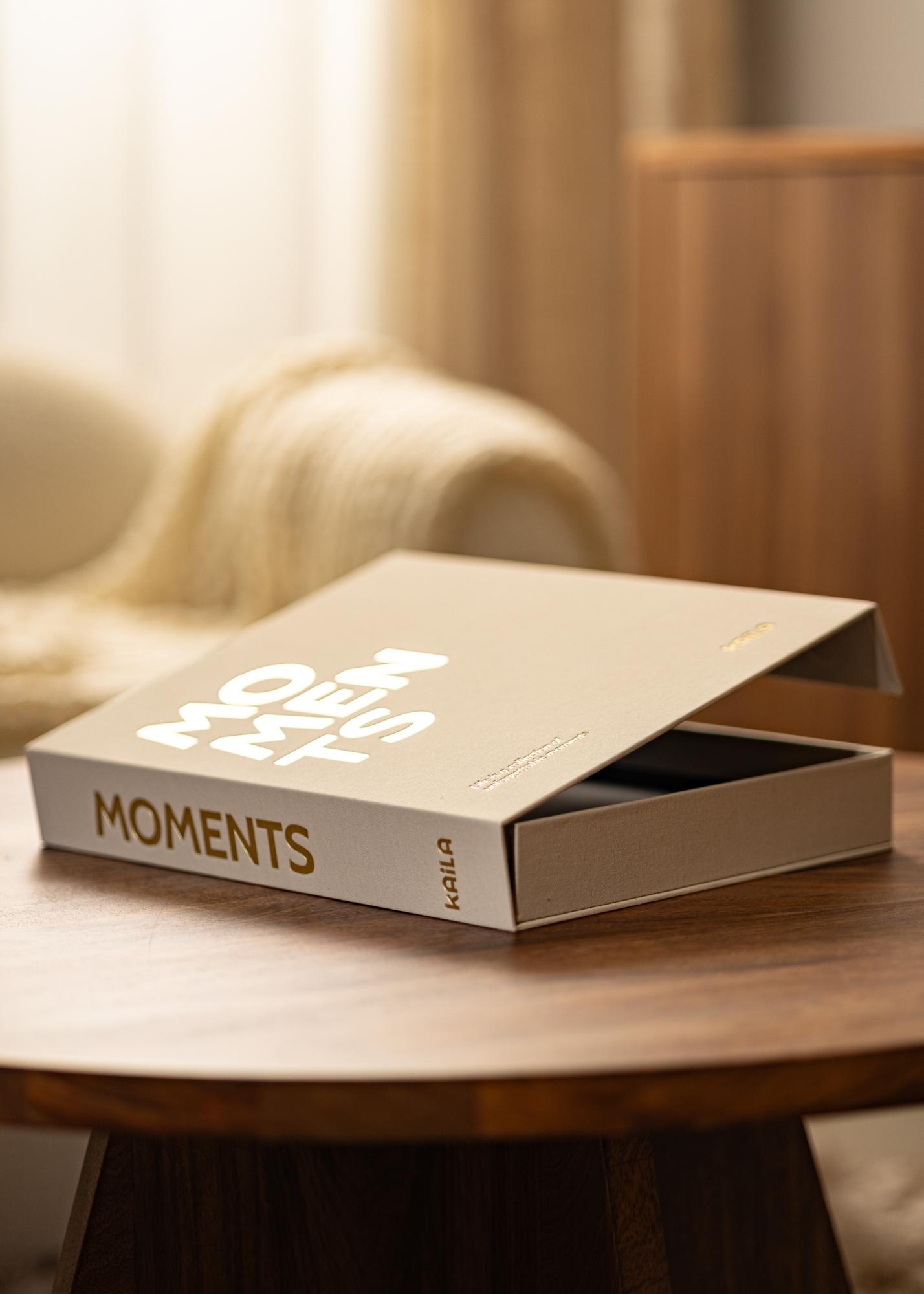 The photo album has a clever box design which you open to access your photos. To give the album a truly luxurious appearance, it’s covered in a cream-coloured fabric and has the title "MOMENTS" printed on the front cover and down the spine. The beautiful subtitle "Life is a collection of unforgettable moments" is printed in the lower left corner on the front.