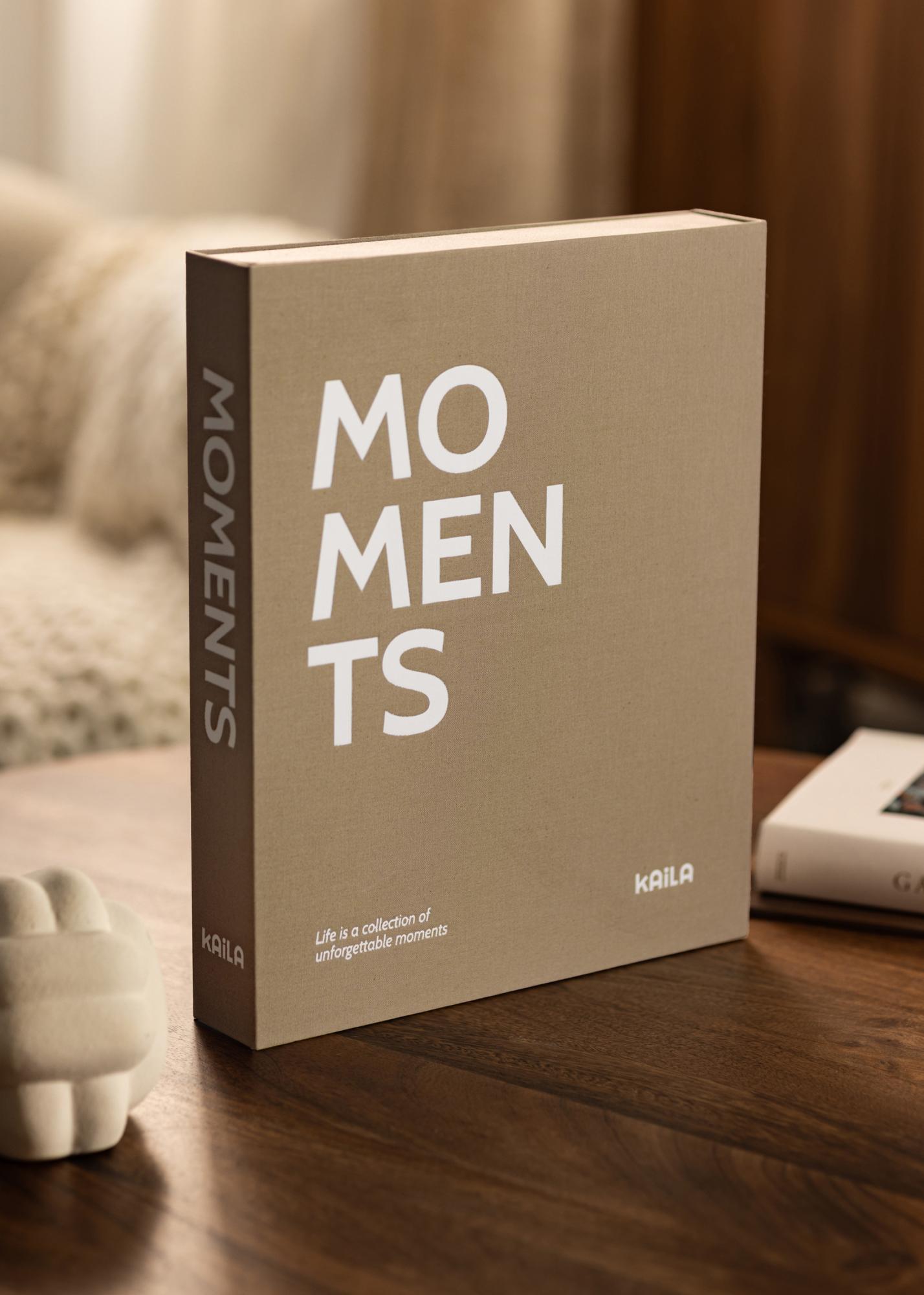 The photo album has a clever box design which you open to access your photos. To give the album a truly luxurious appearance, it’s covered in a grey fabric and has the title "MOMENTS" printed on the front cover and down the spine. The beautiful subtitle "Life is a collection of unforgettable moments" is printed in the lower left corner on the front.