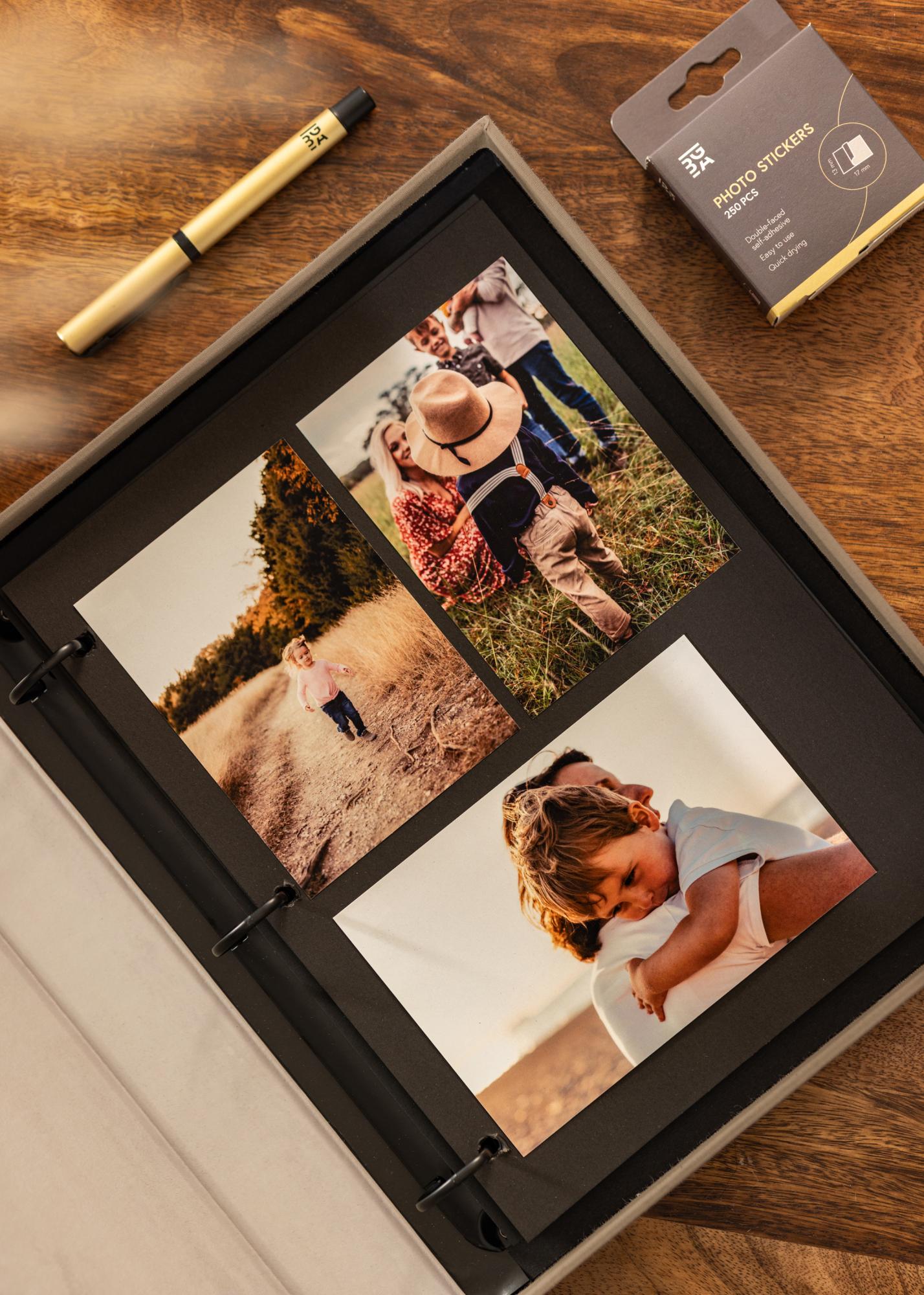 With this photo album you can store your fondest photo memories with style! The album is designed as a stylish Coffee Table Book for displaying on sideboards and tables in your home. Inside the album, you’ll find a ring binder with 60 black pages (30 sheets) that you can fill with your finest photographs. Since you stick your pictures into the album yourself, you can creatively combine images in different sizes and formats.
