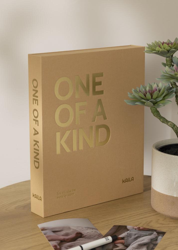 Develop your pictures and preserve them in a beautiful Coffee Table Photo Album! This photo album from KAILA is bound in manilla-coloured cloth and shaped like a box, giving it a truly exclusive feel. The best thing about this photo album is that it is just as attractive as the rest of your decor! On the front of the photo album, you'll find the words ”ONE OF A KIND” printed in large, gold letters, along with the subtitle ”You will take world by storm”. This makes this album perfect for childhood pictures or as a present to someone special. Or, of course, just for your own lovely photos.