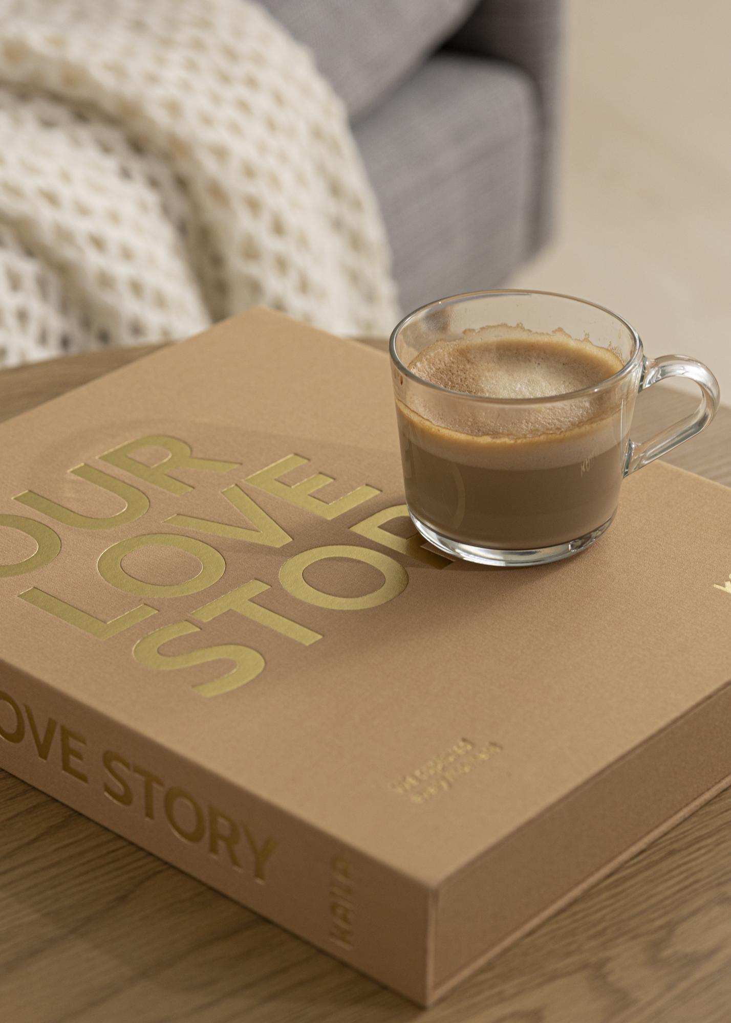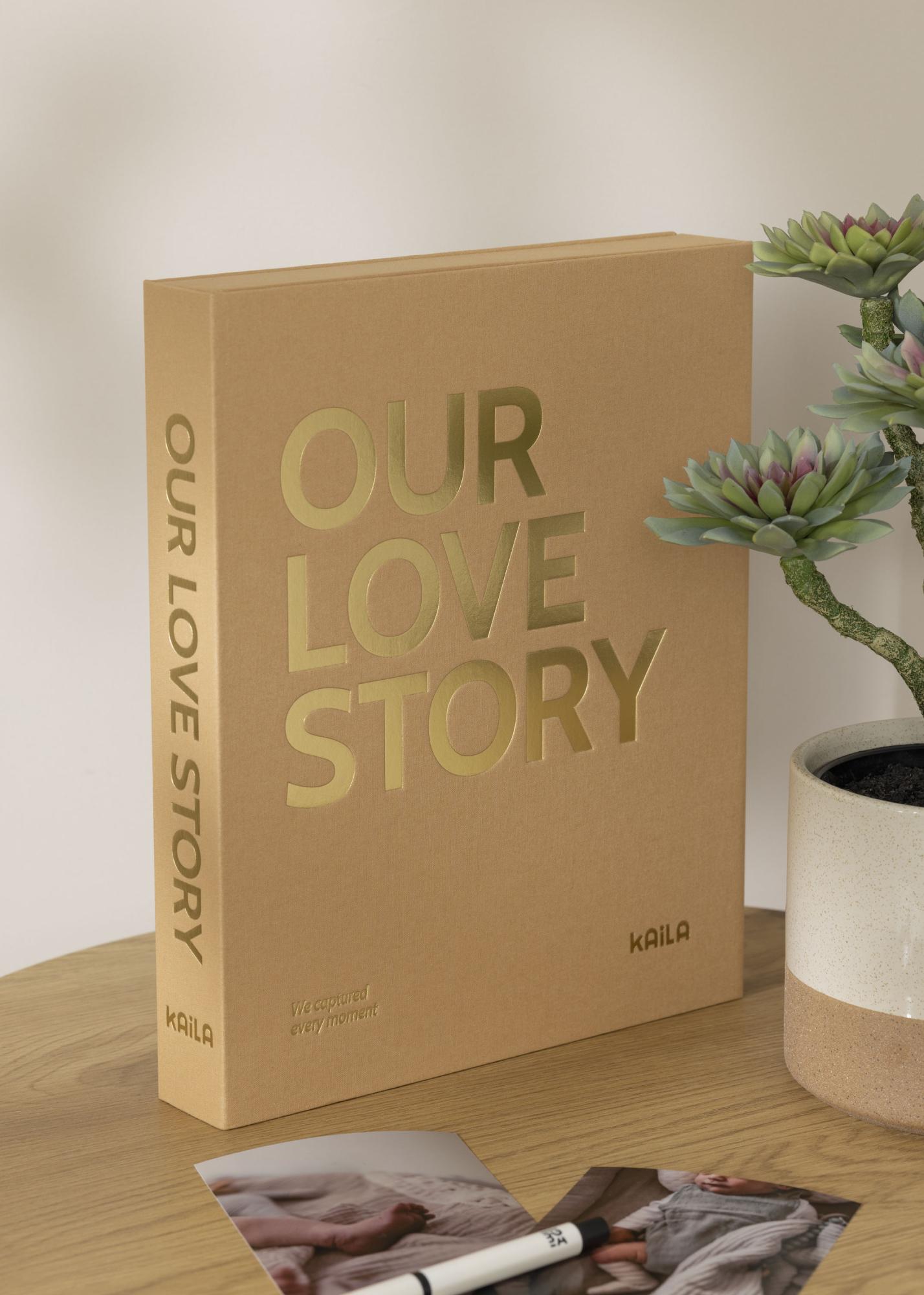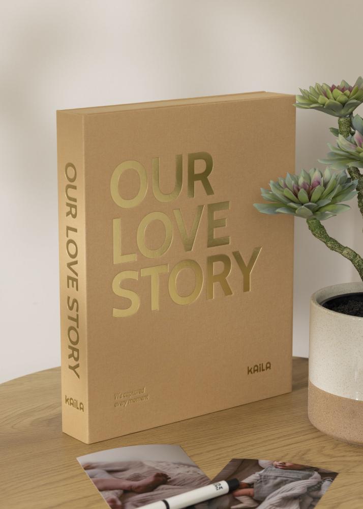 This is a photo album and a Coffee Table Book combined in one, making for a decorative detail in your home. This beautiful manilla-coloured photo album is designed like a clothbound box. On the front of the photo album, you'll find the words ”OUR LOVE STORY” printed in large, golden letters, along with the subtitle ”We captured every moment”. This makes this album perfect for pictures from your closest relationships, or as a beautiful present for someone. Why not use this elegant photo album for storing beautiful wedding photos? On the inside of the album, you'll find a beautiful and discreet print on the inside cover, and a ring binder with 30 black sheets (60 pages) where you can stick your photos in yourself, giving you the opportunity to be creative.