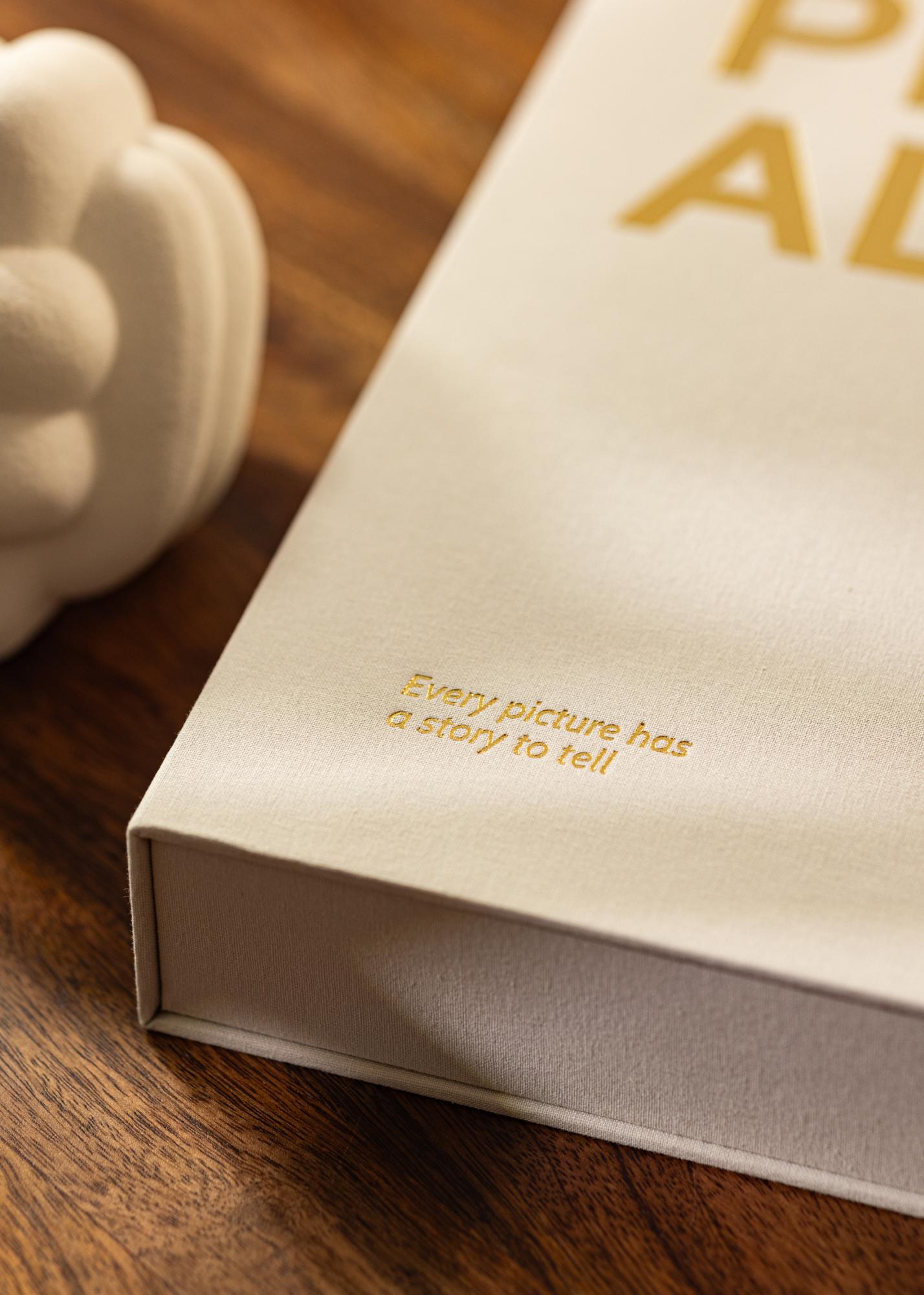 On the front, you’ll find the words "PHOTO ALBUM" with the accompanying subtitle "Every picture has a story to tell" in the lower left corner. The simplicity and subtlety of the words accentuates the modern style of this album.