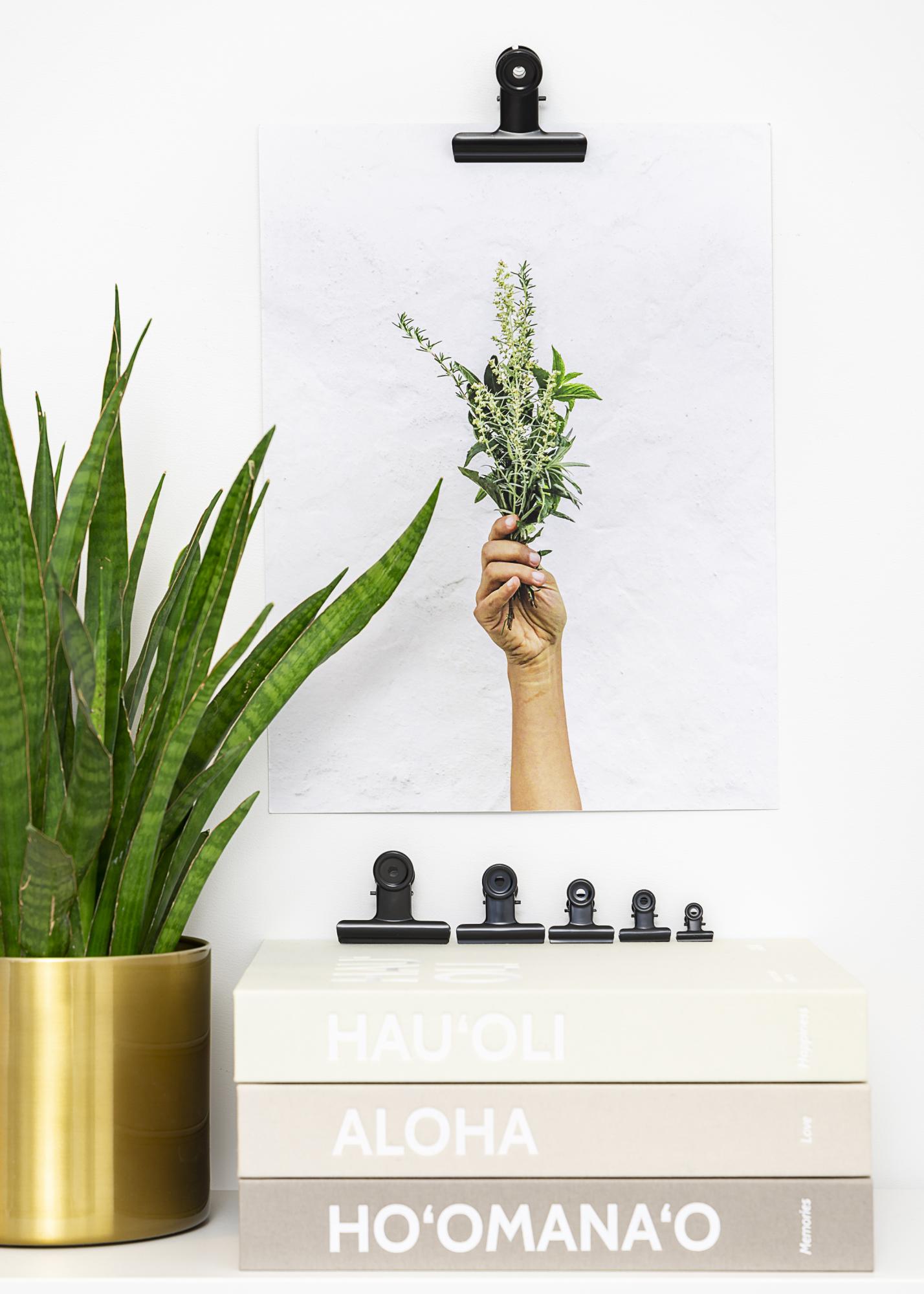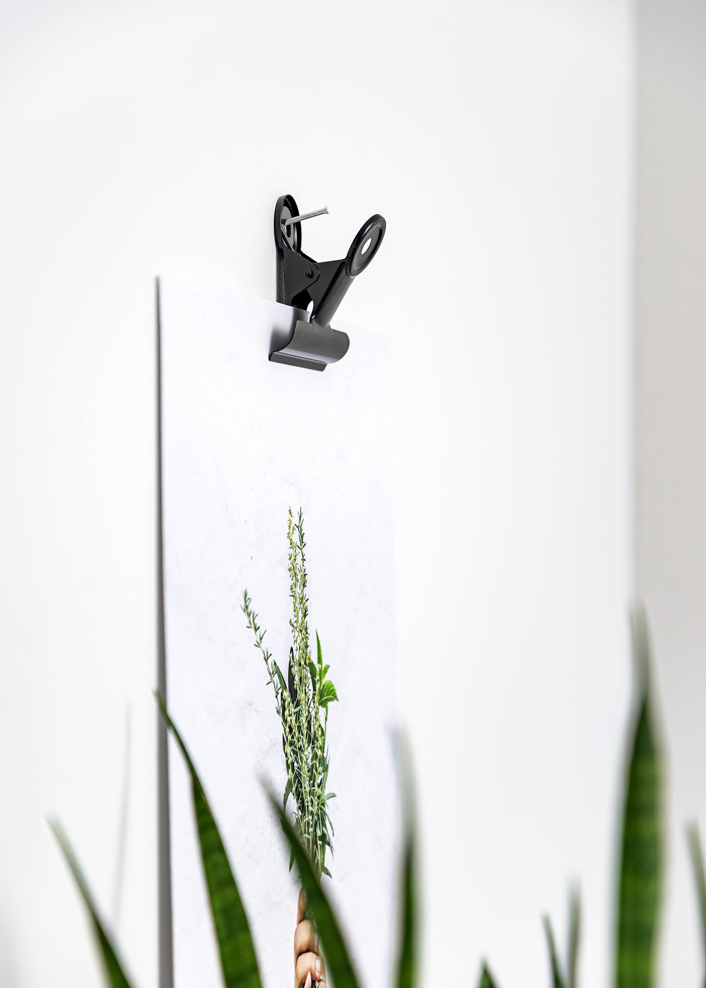 This black metal clip has an attractive matte finish and lets you hang your posters and prints in a chic and trendy way. The clip has a strong and sturdy grip, meaning that you can use it on both very thin paper as well as slightly thicker images. If you have a large poster that you want to hang up, you can choose to use two poster clips. The metal clip's design is stylistically simple, and the hole in the round top of the clip makes it simple and smooth to hang it up on the wall with a small nail or screw.