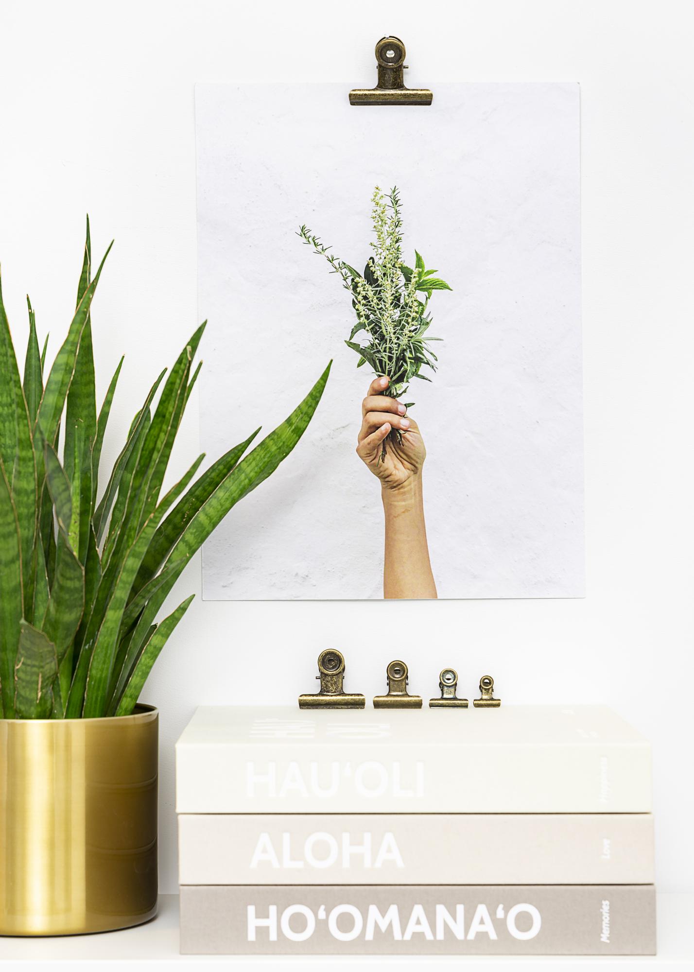 This stylish metal clip gives you a simple and modern way of hanging up posters and prints, at the same time as the beautiful worn bronze colour appeals to those who like rustic decorative details. The clip's has a sturdy but flexible grip, meaning that you can use it to hold both super thin paper as well as thicker prints. If you have a poster with a slight larger format, you just need to use two metal clips. Mounting the clip on your wall is simple, thanks to its stylish round top.