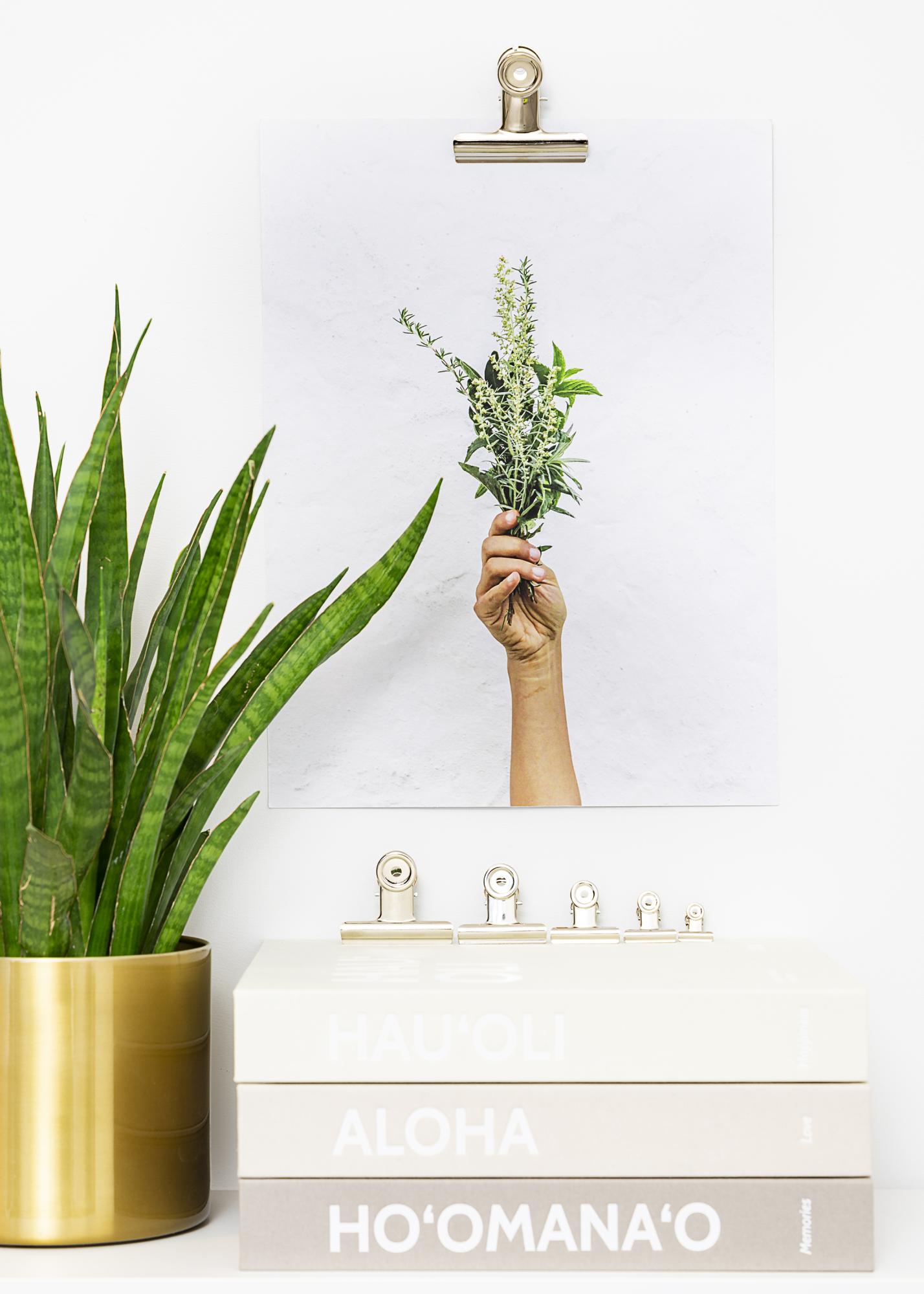 This metal clip has a modern and glossy silver finish, and is the perfect tool for hanging up your posters and prints in a trendy and minimalist way. The clip's flexible and strong grip means that you can hang up images of varying thickness - even the thinnest of paper. If you have a large poster, you just need to use two metal clips. The poster clip's design is pared-back and stylistically simple, and the holes in the round top of the clip make mounting on the wall easy and simple - all you need is a small nail or screw.