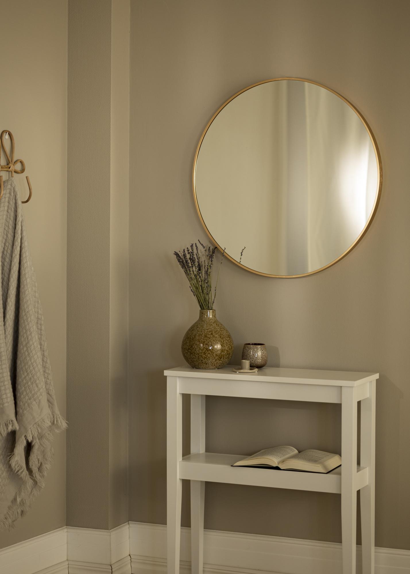 A round mirror in a stylish Swedish design with a metal frame in beautiful gold. The frame has a brushed surface, which gives the lovely gold colour a slightly duller look. It also has a trendy frame that's thin but at the same time deep - between 30-40 mm deep depending on the size - meaning that it stands slightly off of the wall for a cool 3D effect. The frame's depth also makes the mirror feel solid and robust, without affecting its minimalist feel.