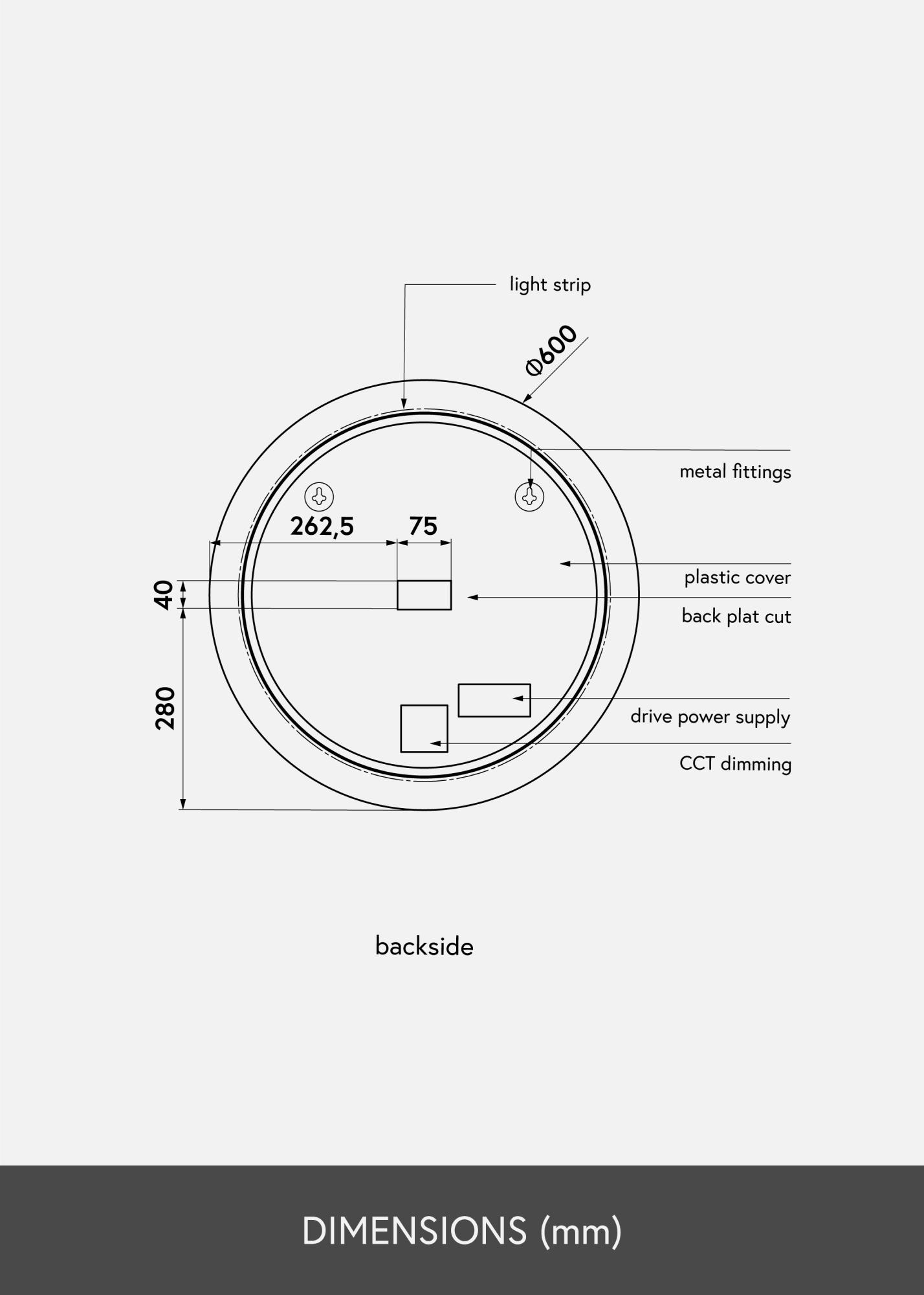 The mirror is approved for bathroom use, but its timeless and elegant design looks great on any of the home’s other walls! The mirror has a 60 cm diameter, is just 3 cm deep, and comes with wall fixings. For the mirror to function correctly, it must be connected to a standard switch, not a dimmer switch.