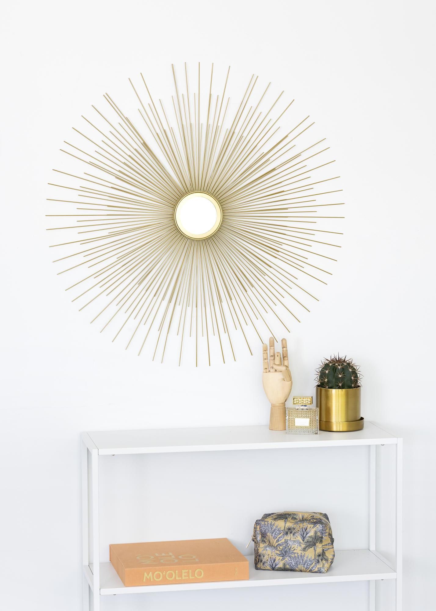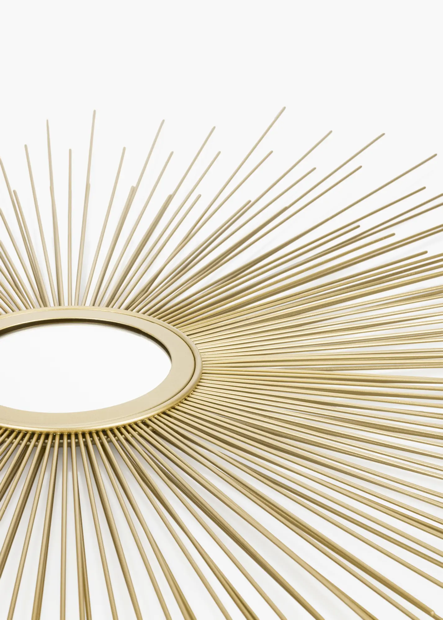 This is a round wall mirror that looks like a sun. This small mirror stylishly framed by sunray-like, thin metal spokes with an elegant golden colour. The mirror's surface has an outer measurement of 80 cm. This product comes with wall fixings. Put this mirror somewhere in your home to create more space and light - for example in the bedroom or living room, to give the rooms a more elegant feeling!