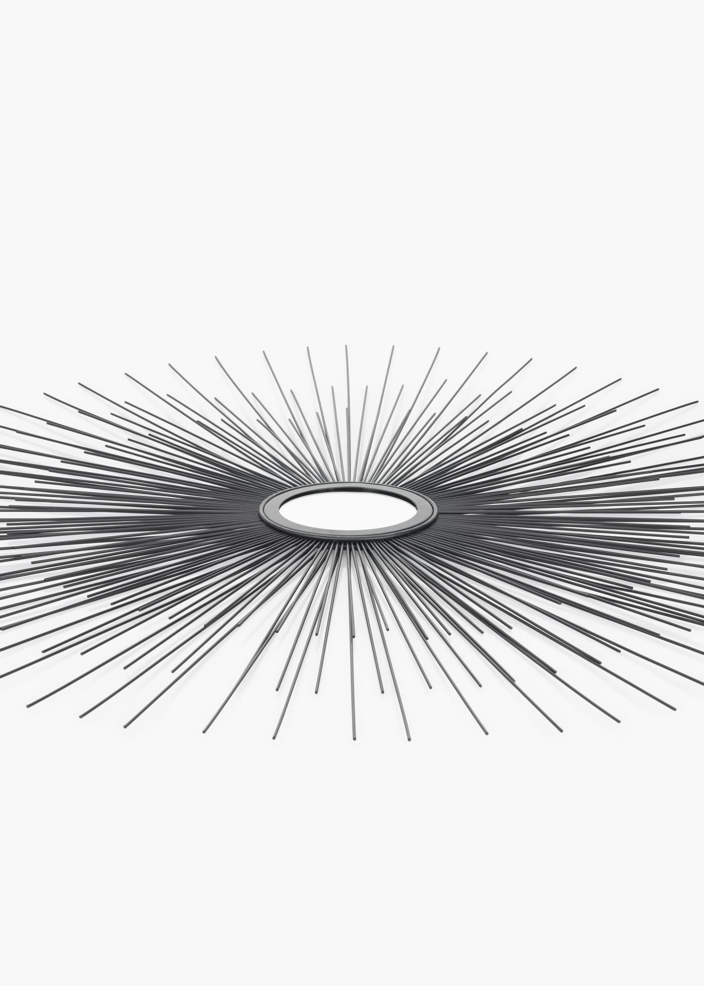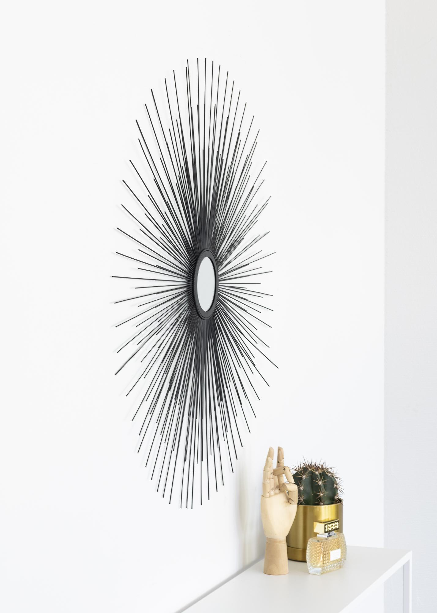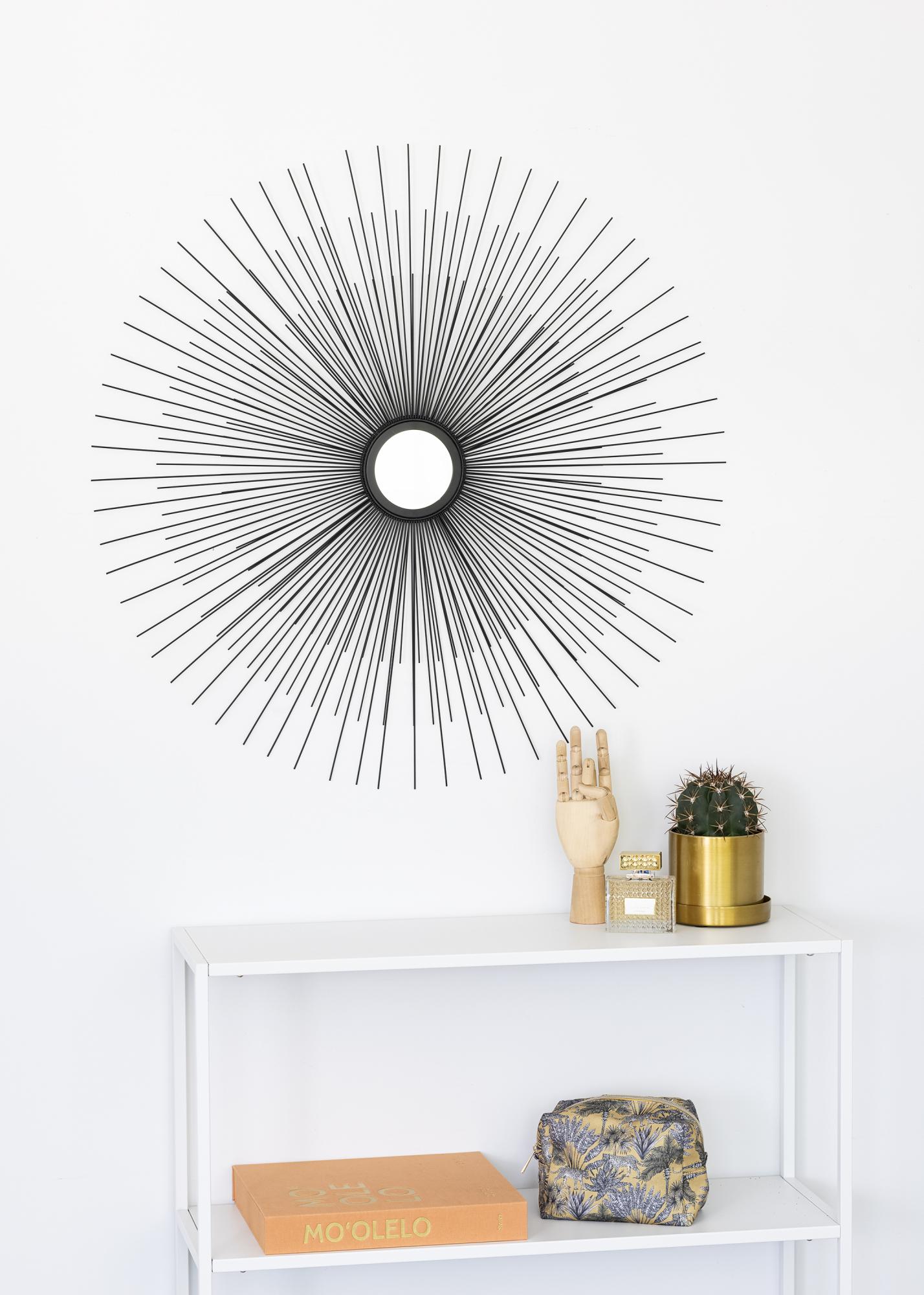 This is a round wall mirror that looks like a sun. The small mirror has a striking frame comprising sunray-like, thin metal spokes with a stylish black colour. The mirror's surface has an outer measurement of 80 cm. This product comes with wall fixings. Put this mirror somewhere in your home to create more space and light - for example in the bedroom or living room, to give the rooms a more elegant feeling!