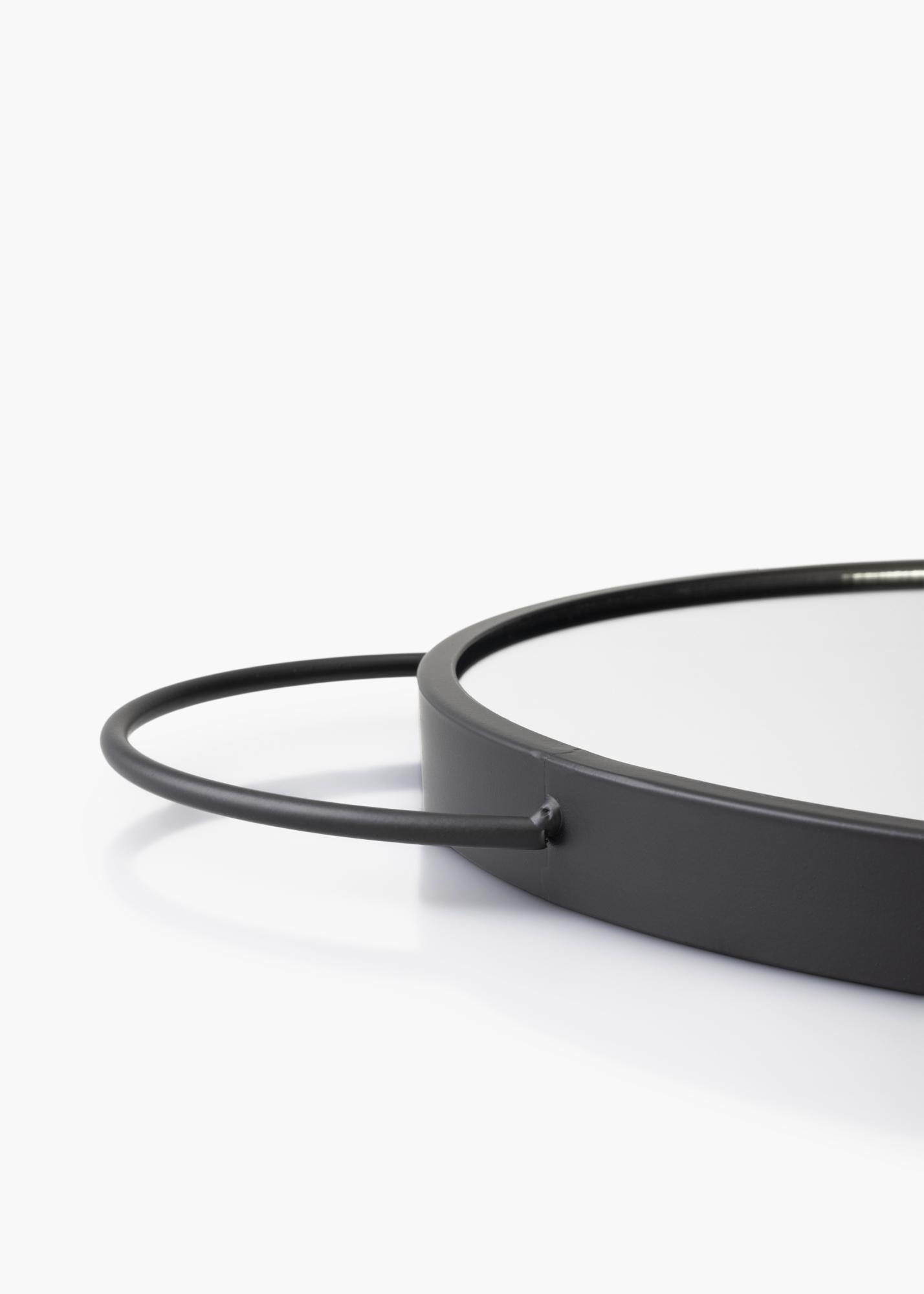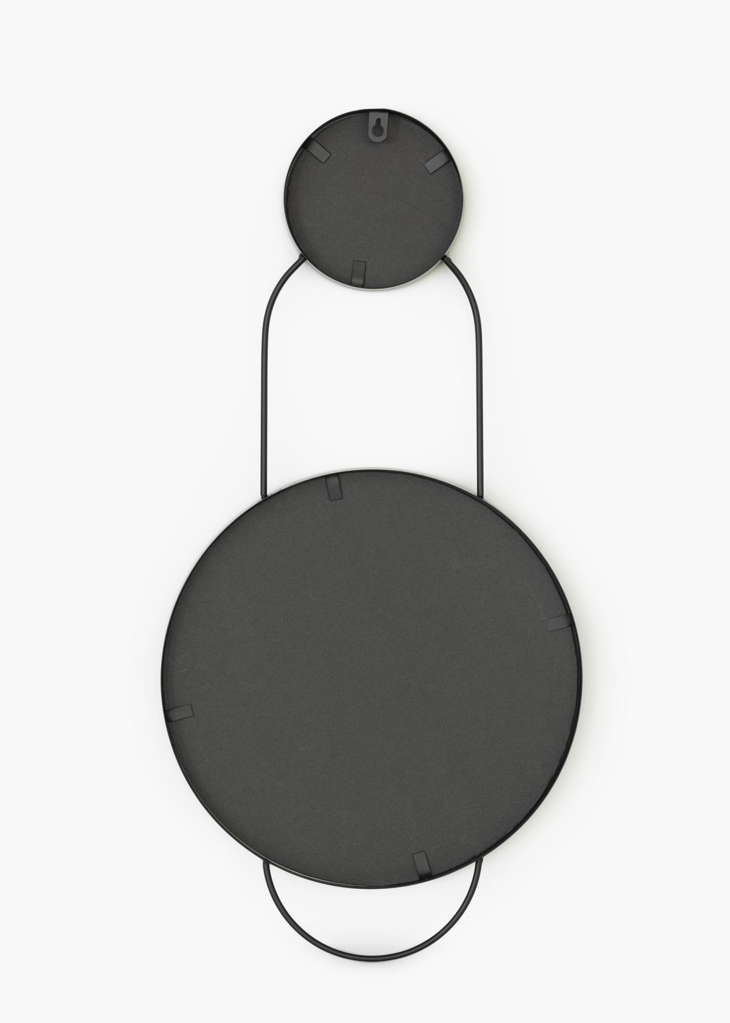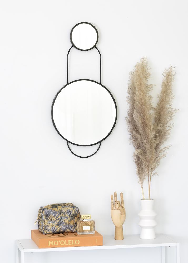 This is a striking wall mirror from KAILA, consisting of two mirrors combined in one, with a unique and attractive design. This wall mirror has a smaller mirror at the top and a larger one below. It measures 35x35 cm and is made from metal. This mirror has a stylish black colour that makes the whole thing a very fashionable piece of design.