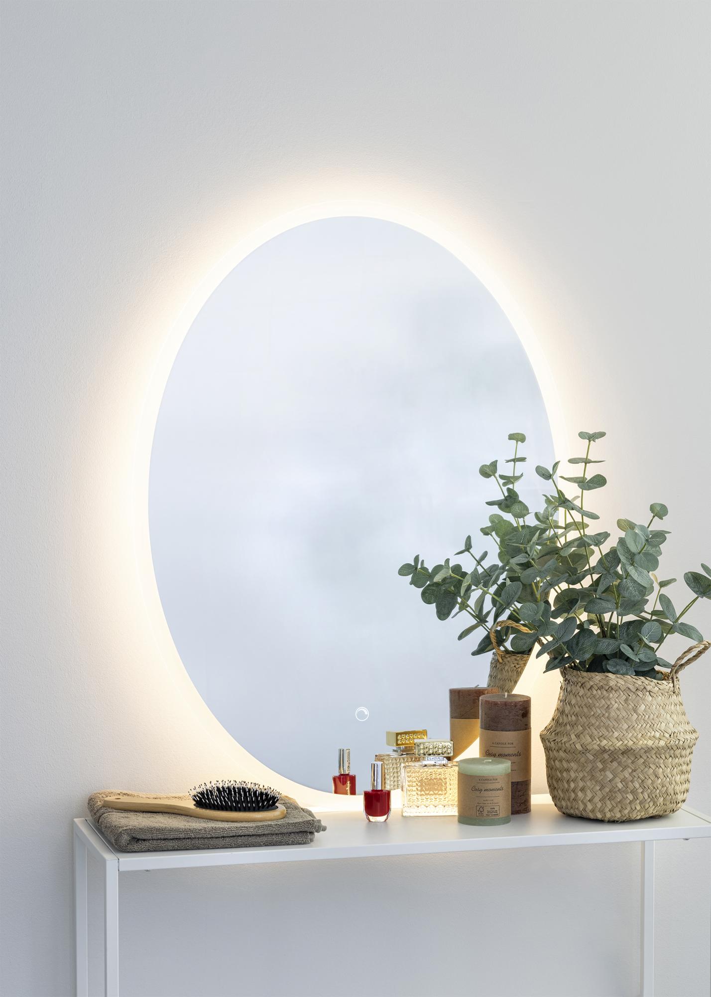 With its oval shape and integrated LED lighting, this really is a bathroom mirror with an elegant design! The integrated LED is dimmable, and can be adjusted by pressing the watertight touch button on the screen. The mirror is lit from behind by a warm, white 3000K light, which gives a beautiful glow at the front. LED is an energy efficient light source that makes for an even and natural light. The mirror is approved for bathroom use. For the mirror to function correctly, it must be connected to a standard switch, not a dimmer switch.