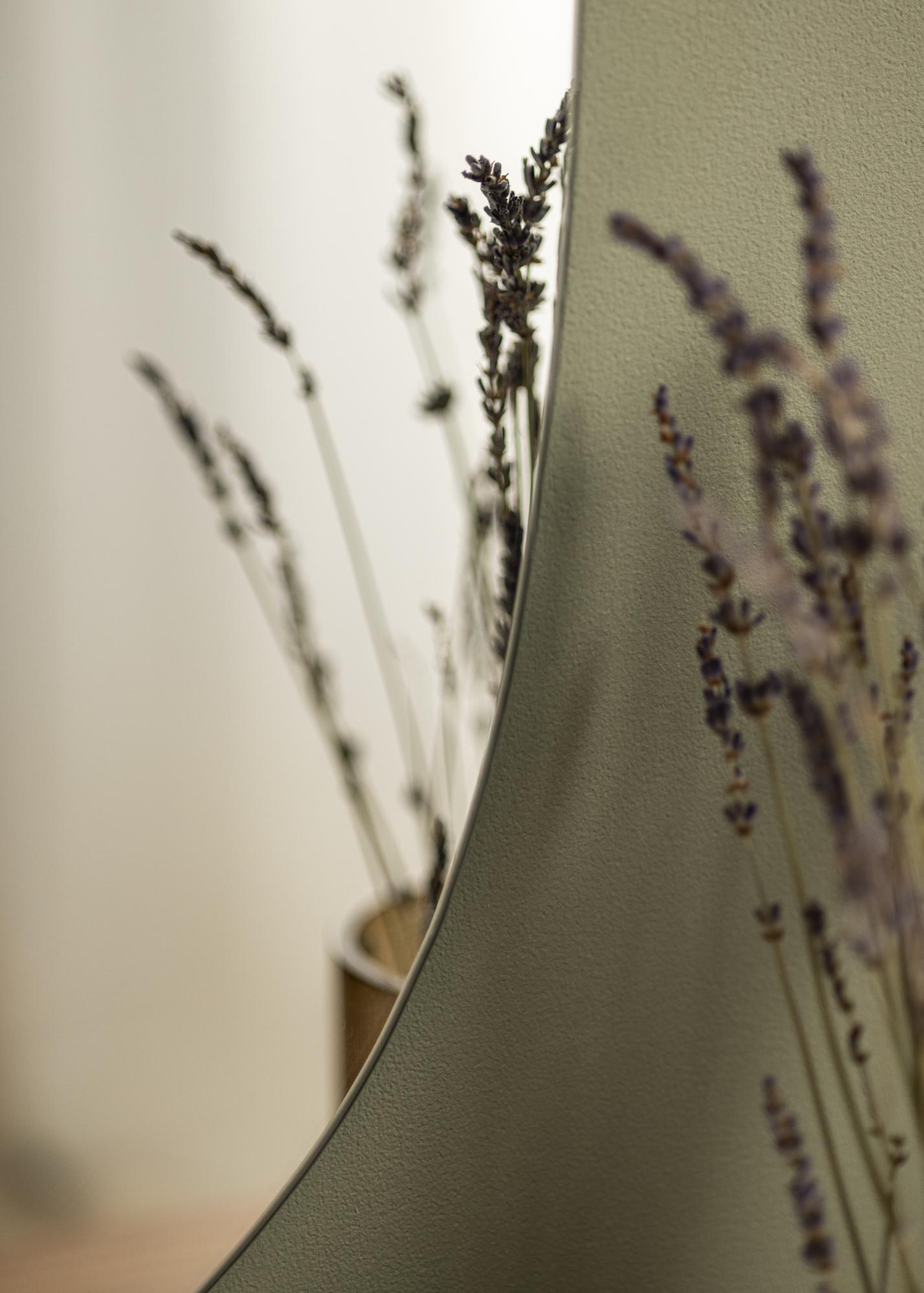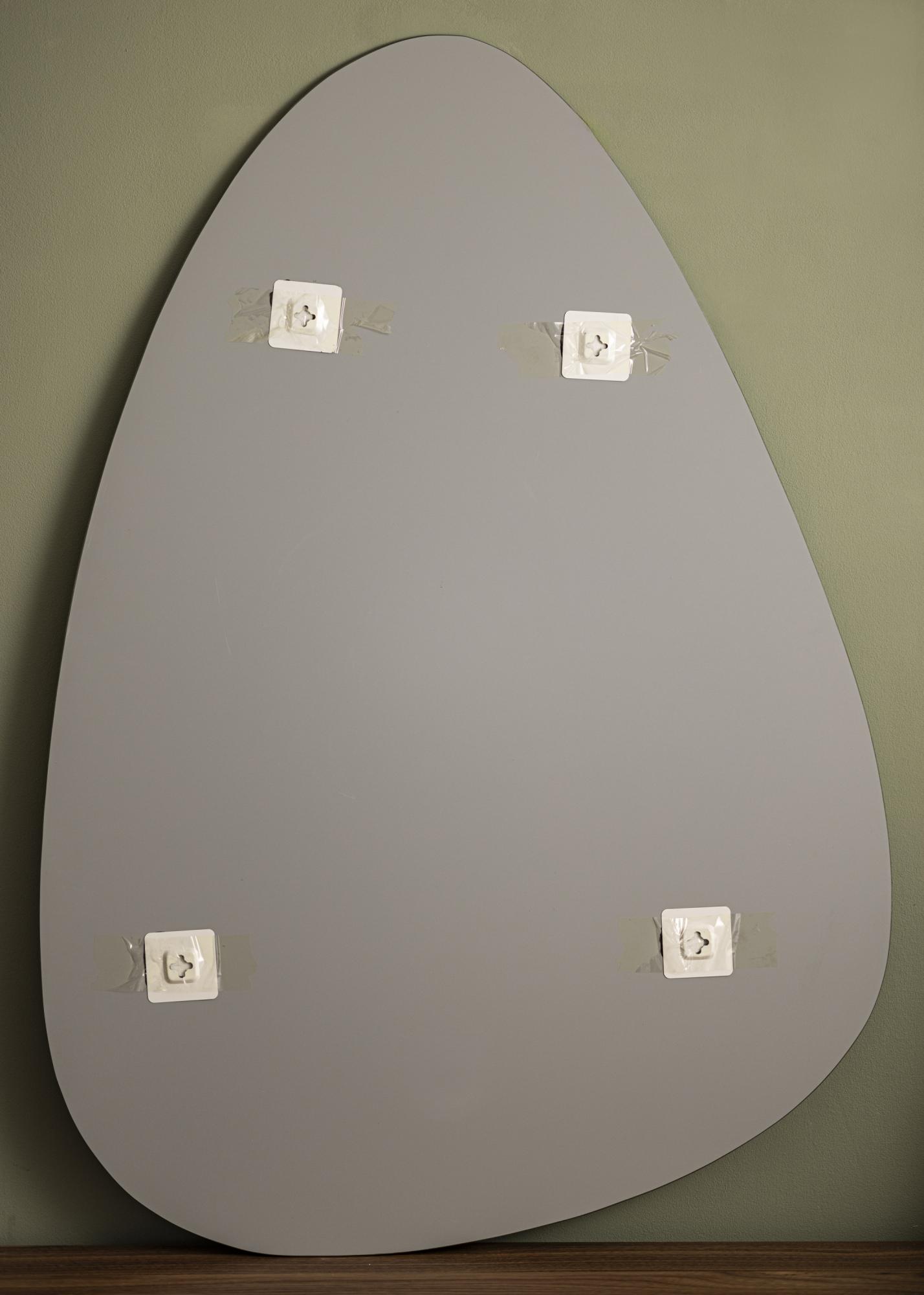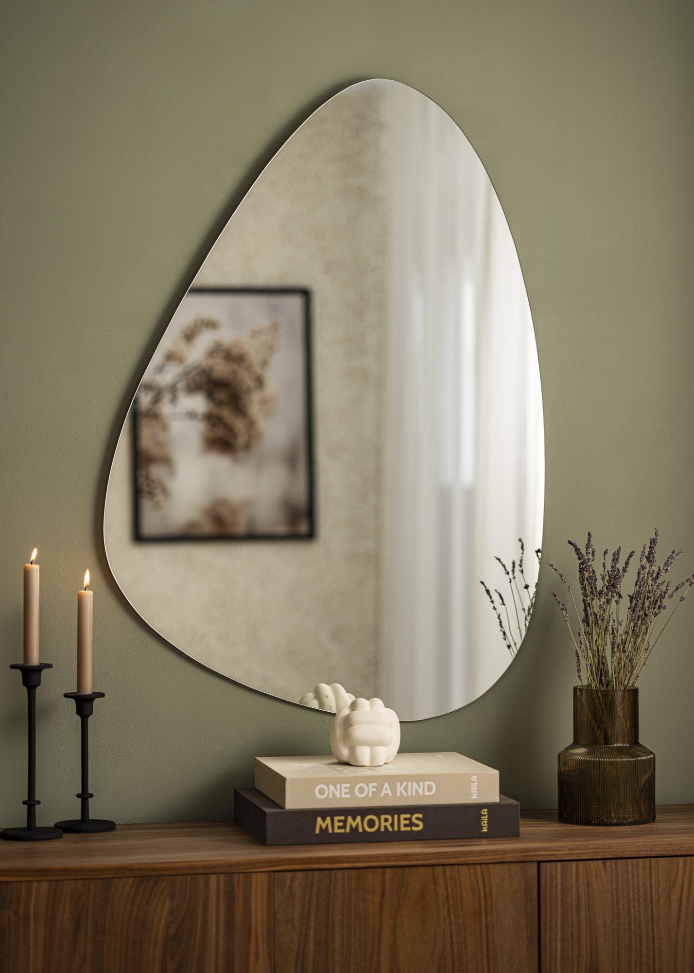 This trendy and asymmetrical shape mirror is shaped almost like an egg. A soft and elegant shape that creates a light and inviting atmosphere in the room you display it in. The mirror is also very thin, which enhances its stylish and slender appearance.