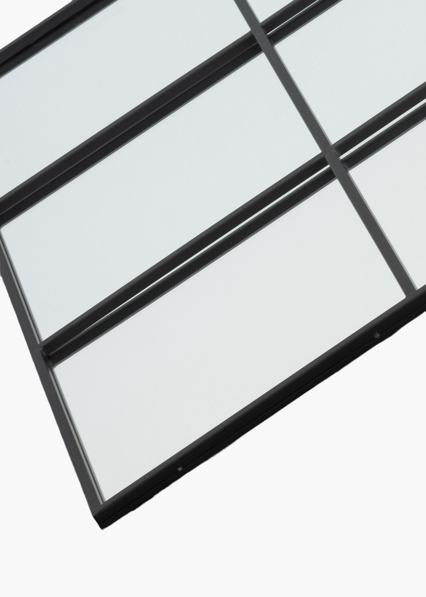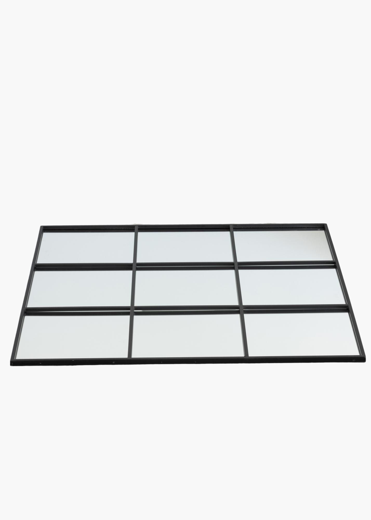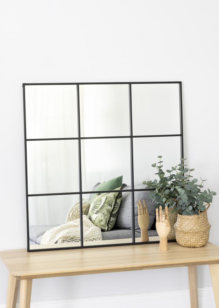 This is a square mirror with a stylish chequed pattern. The squares are stylishly framed by thin, black metal lines, giving this wall mirror a rustic and industrial look. The mirror's square shape helps give it a more stylistically simple design. Put this mirror in, for example, the hall, kitchen or bedroom to add a beautiful decorative detail to the room, at the same time as making it feel more spacious. Wall fixings included. The mirror measures 90x90 cm.