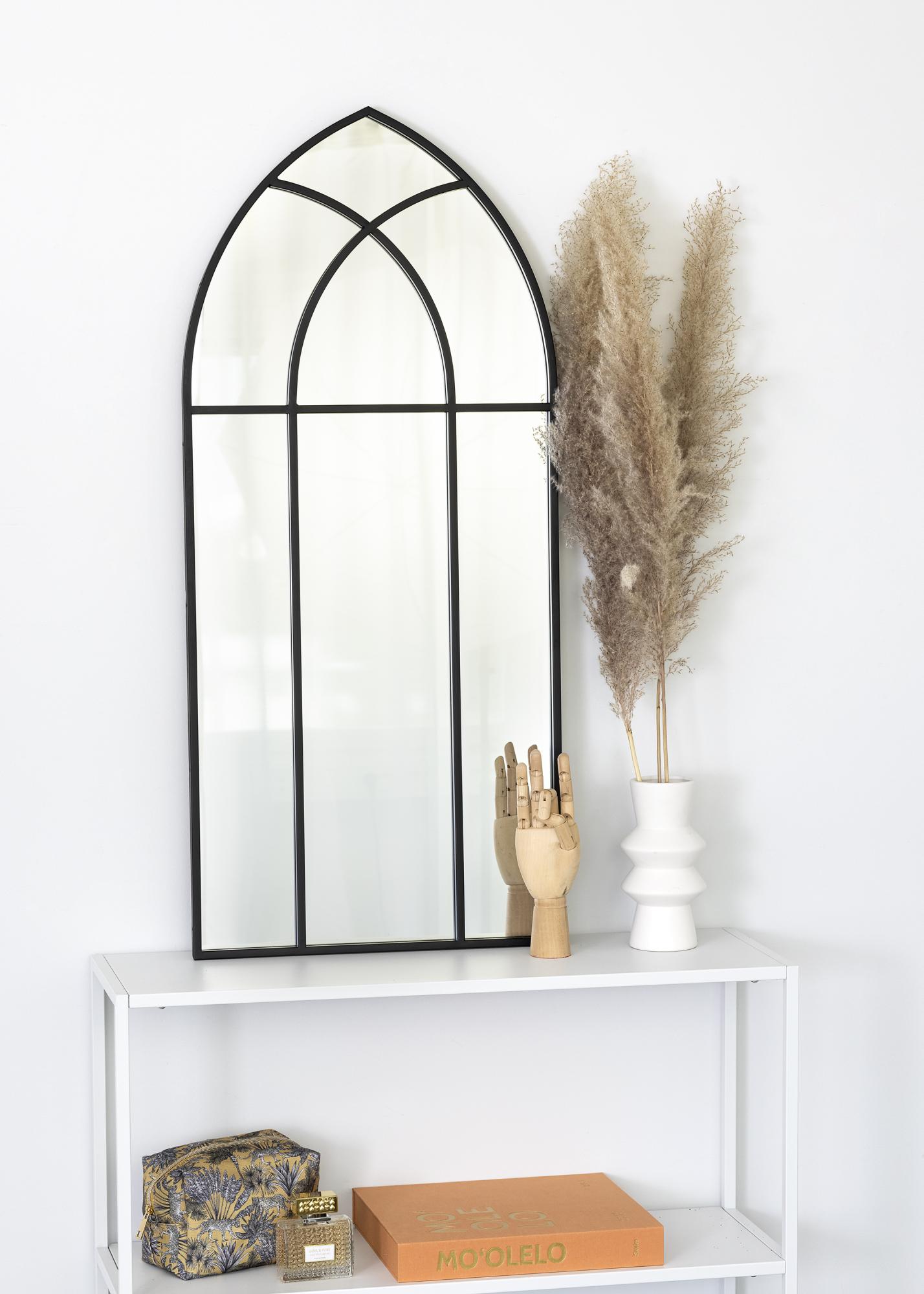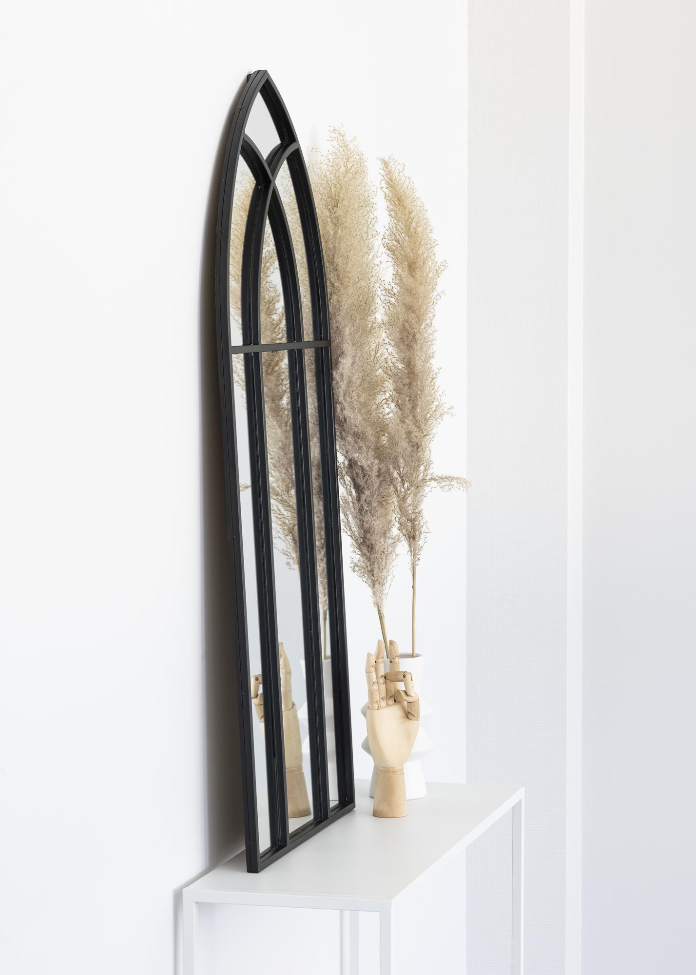 This is a very decorative mirror that will create a romantic atmosphere straight away, wherever it's placed! This mirror has a design that resembles a garden window, with a slightly gothic look to it. The mirror's exciting shape will make it a real eye-catcher in your home! It measures 45x100 cm, and has a decorative pattern consisting of thin, black metal lines.