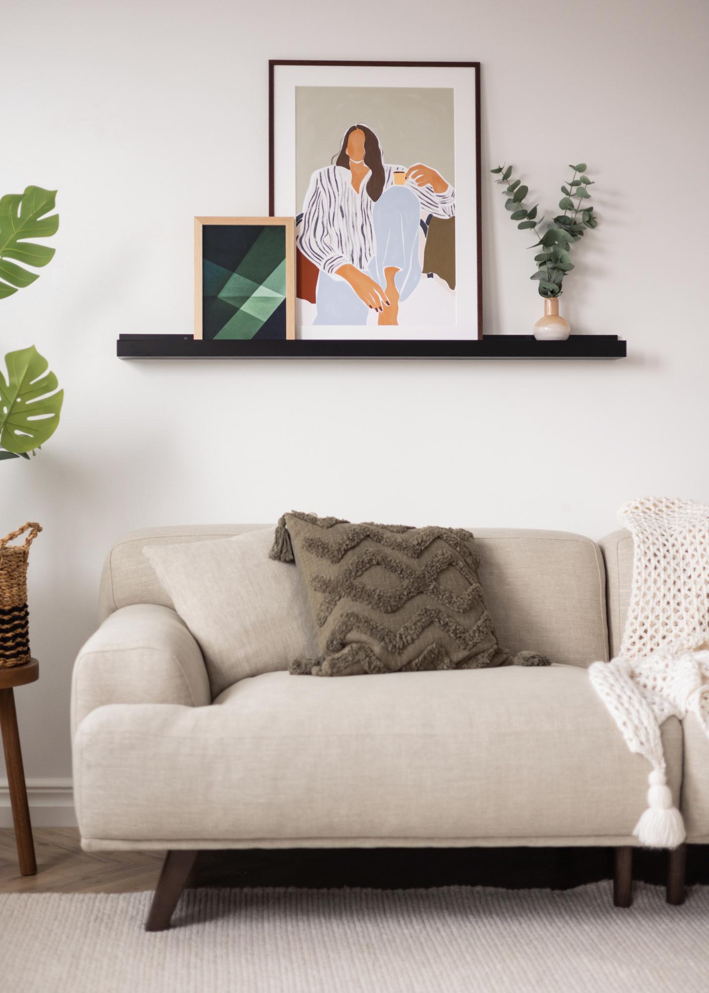 Display and vary your wall art easily and stylishly with an elegant photo shelf! This photo shelf is made of MDF and is trendily painted black with a fine, semi-gloss finish. The photo rail has a sleek design with straight, simple lines and a minimalist feel. The shelf has a milled groove in the middle that acts as support for your pictures and gives them a nice angle as they lean against the wall.
