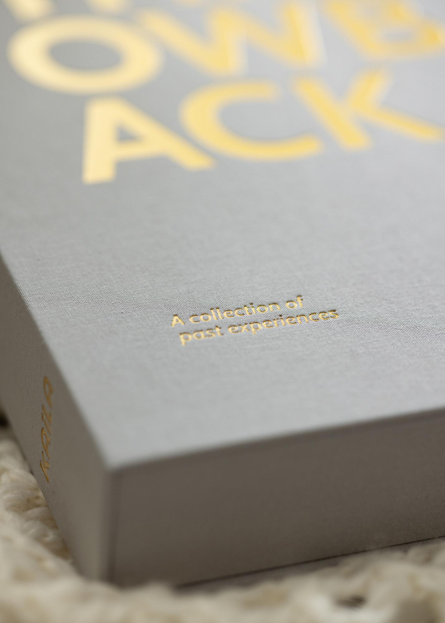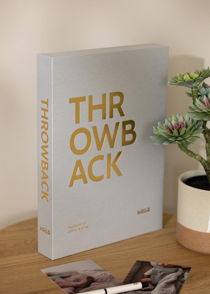 The album is stylishly covered in grey fabric and decorated front and back with "THROWBACK" in gold-coloured text. The album title also includes the phrase "A collection of past experiences", printed in the bottom left corner.