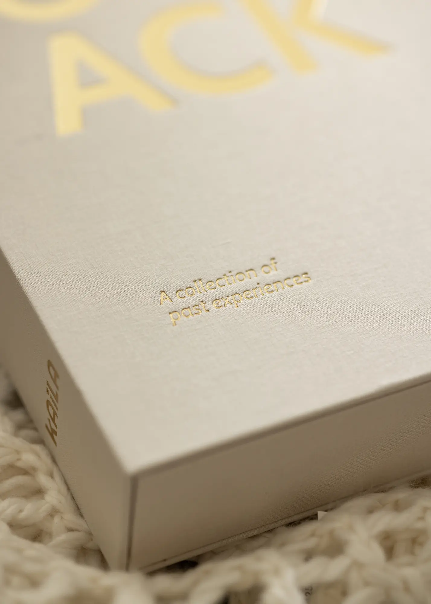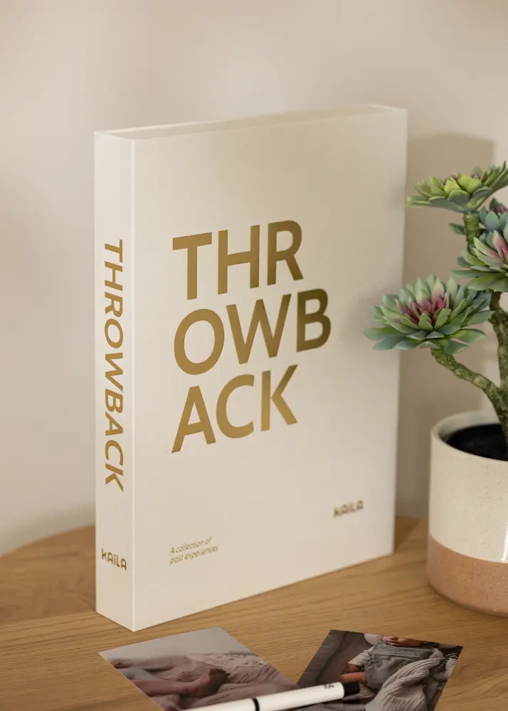 The album is stylishly covered in light grey fabric and decorated front and back with "THROWBACK" in gold-coloured text. The album title also includes the phrase "A collection of past experiences", printed in the bottom left corner.